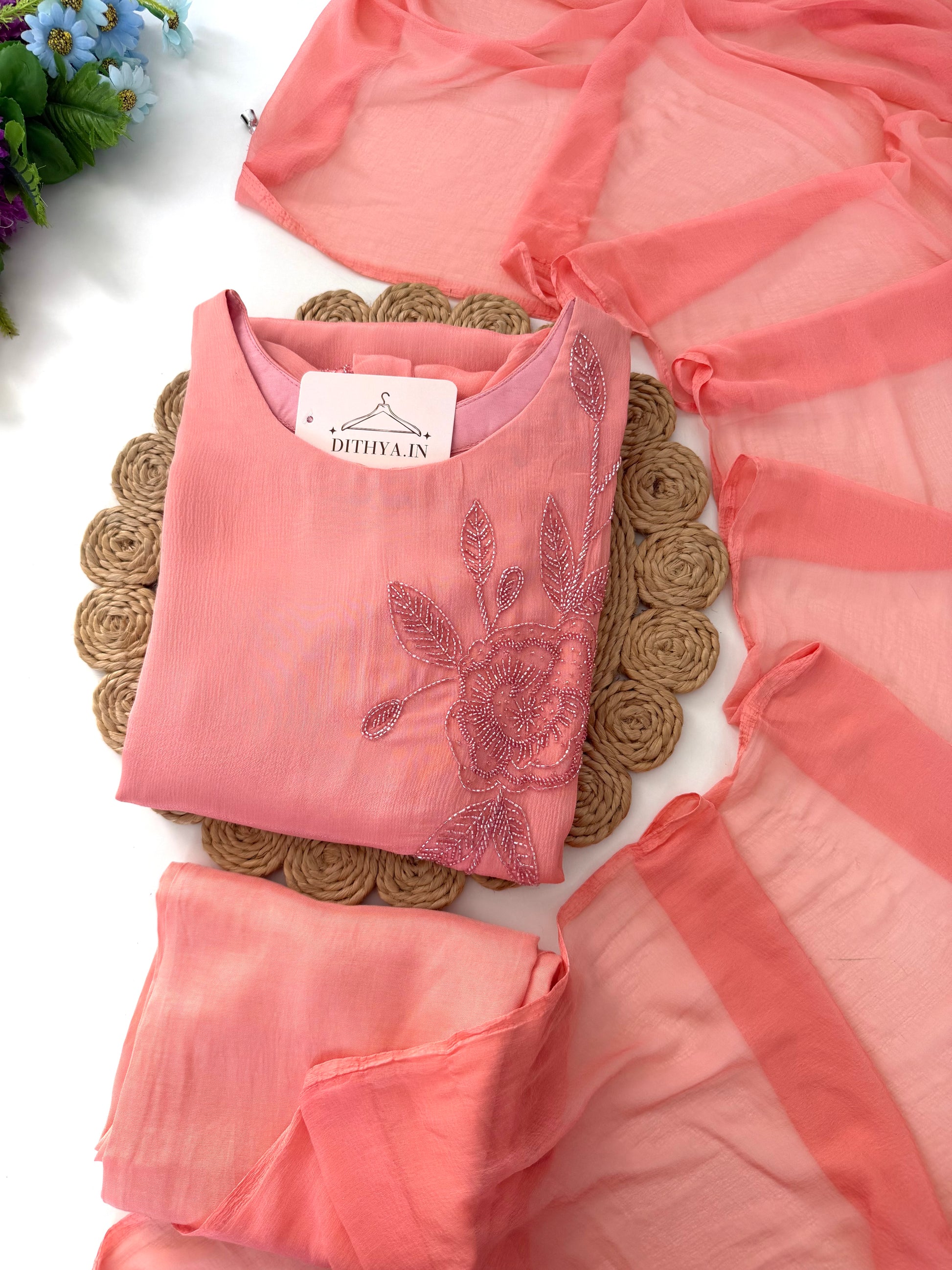 K057 - Pure Chinnon Handwork Aline Kurti with pants and dupatta