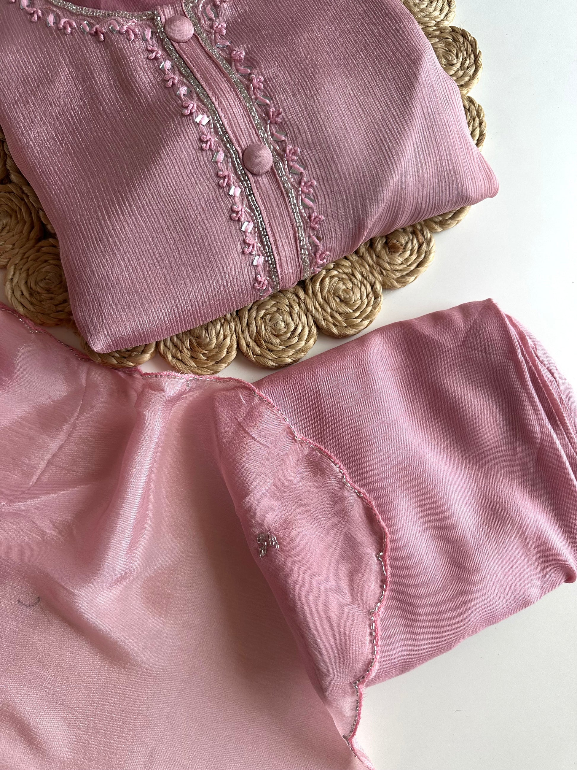 Elevate your wardrobe with our Pure Chinnon Handwork Anarkali, complete with pants and dupatta. Expertly crafted and adorned with delicate handwork, this traditional garment exudes elegance and sophistication. Made from pure chinnon fabric, it offers both comfort and impeccable style. Perfect for any occasion.