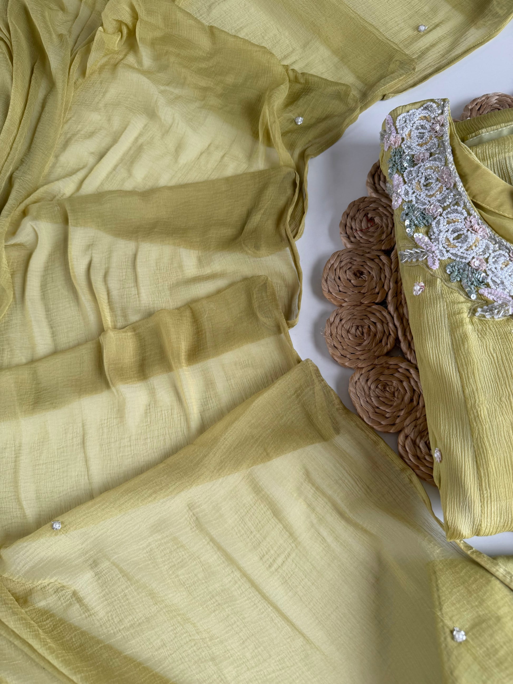 Upgrade your wardrobe with our Pure Chinnon handwork Anarkali set! Made with pure Chinnon fabric and intricate handiwork, this set includes pants and a dupatta for a complete look. Elevate your style with high-quality materials and expert craftsmanship.