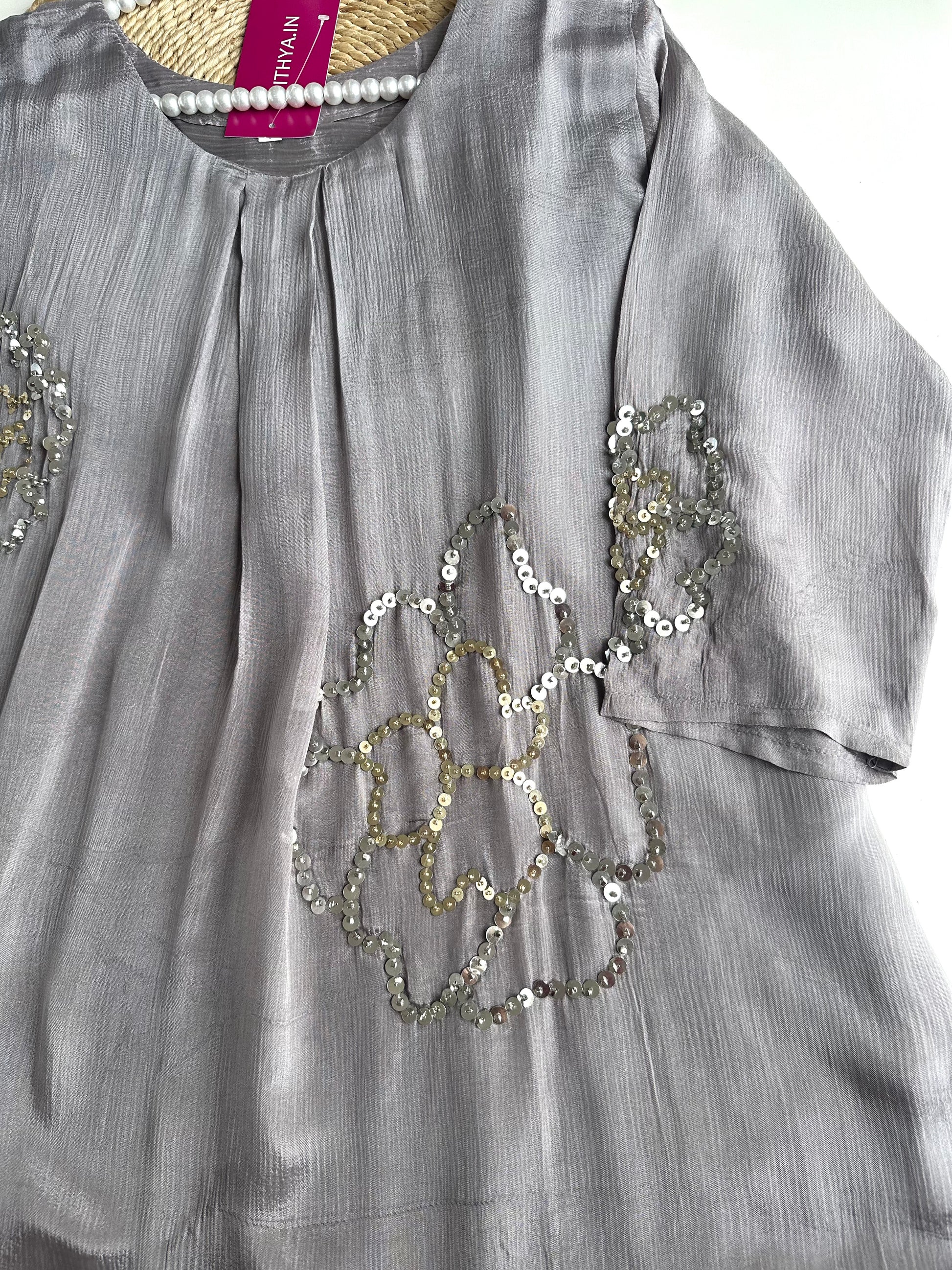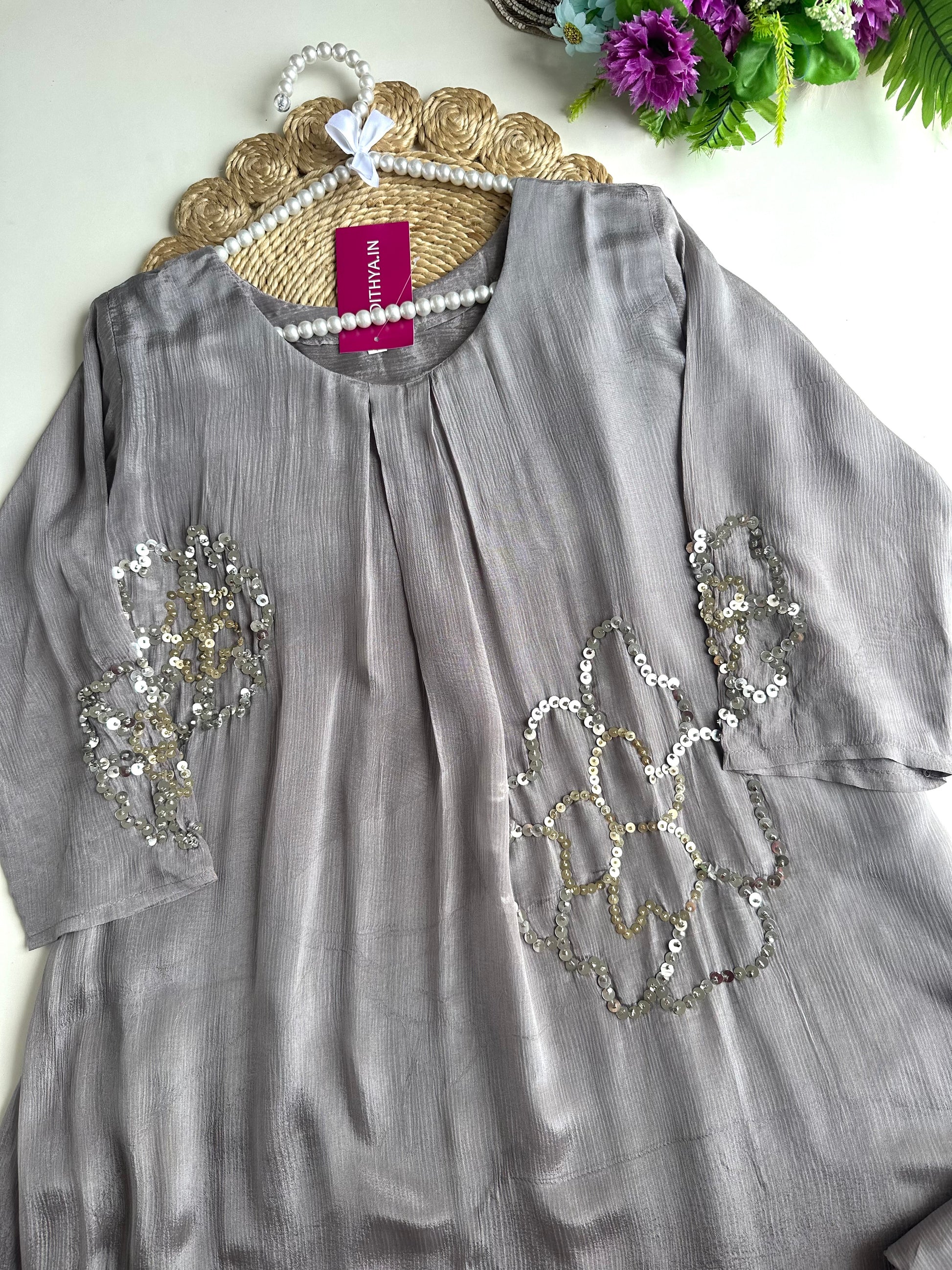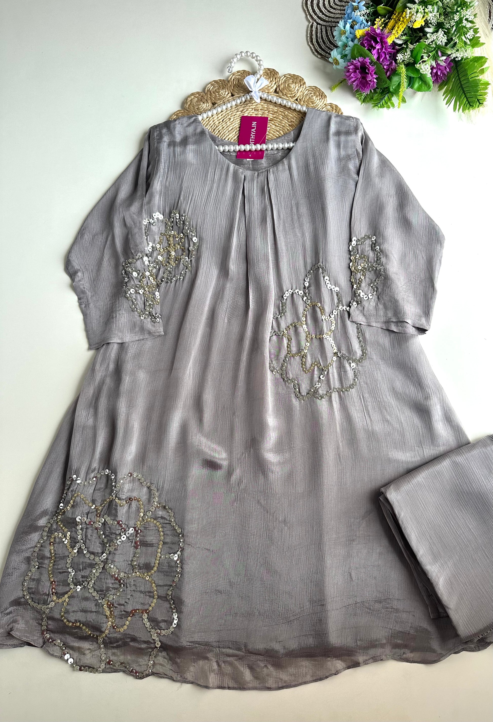 This Pure Chinnon handwork Coord set boasts intricate details and exceptional craftsmanship. Made from pure Chinnon fabric, it offers a luxurious and elegant look. Perfect for special occasions, this set adds a sophisticated touch to your wardrobe. Elevate your style with this handwork Coord set.