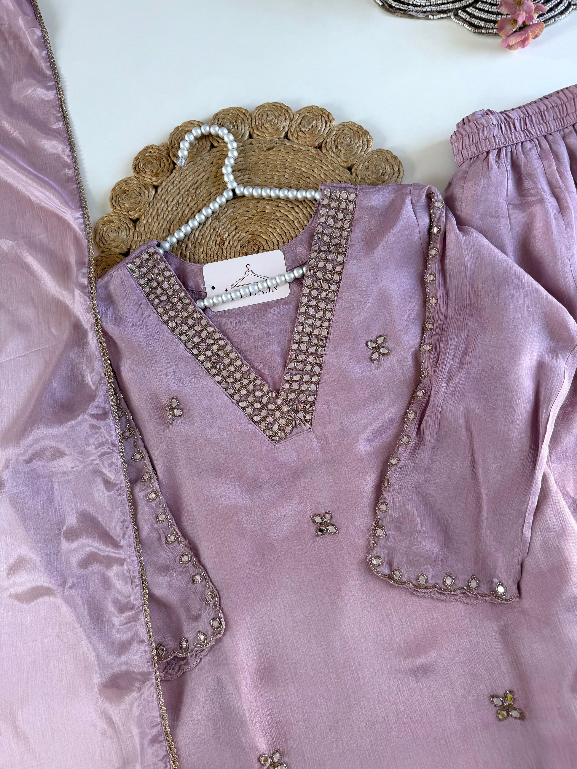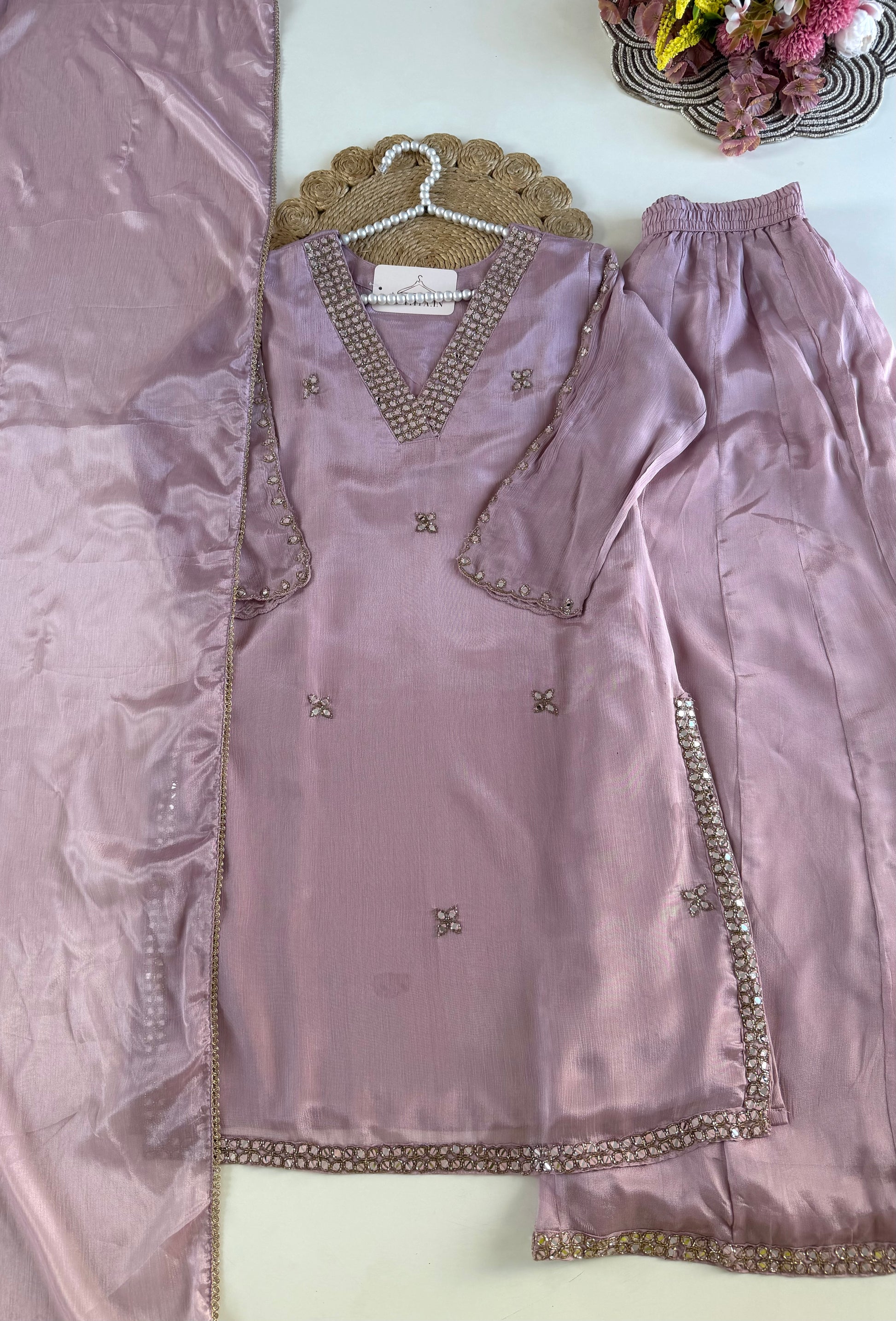 K376 - Pure Chinnon mirror handwork short Kurti with divider pants and dupatta