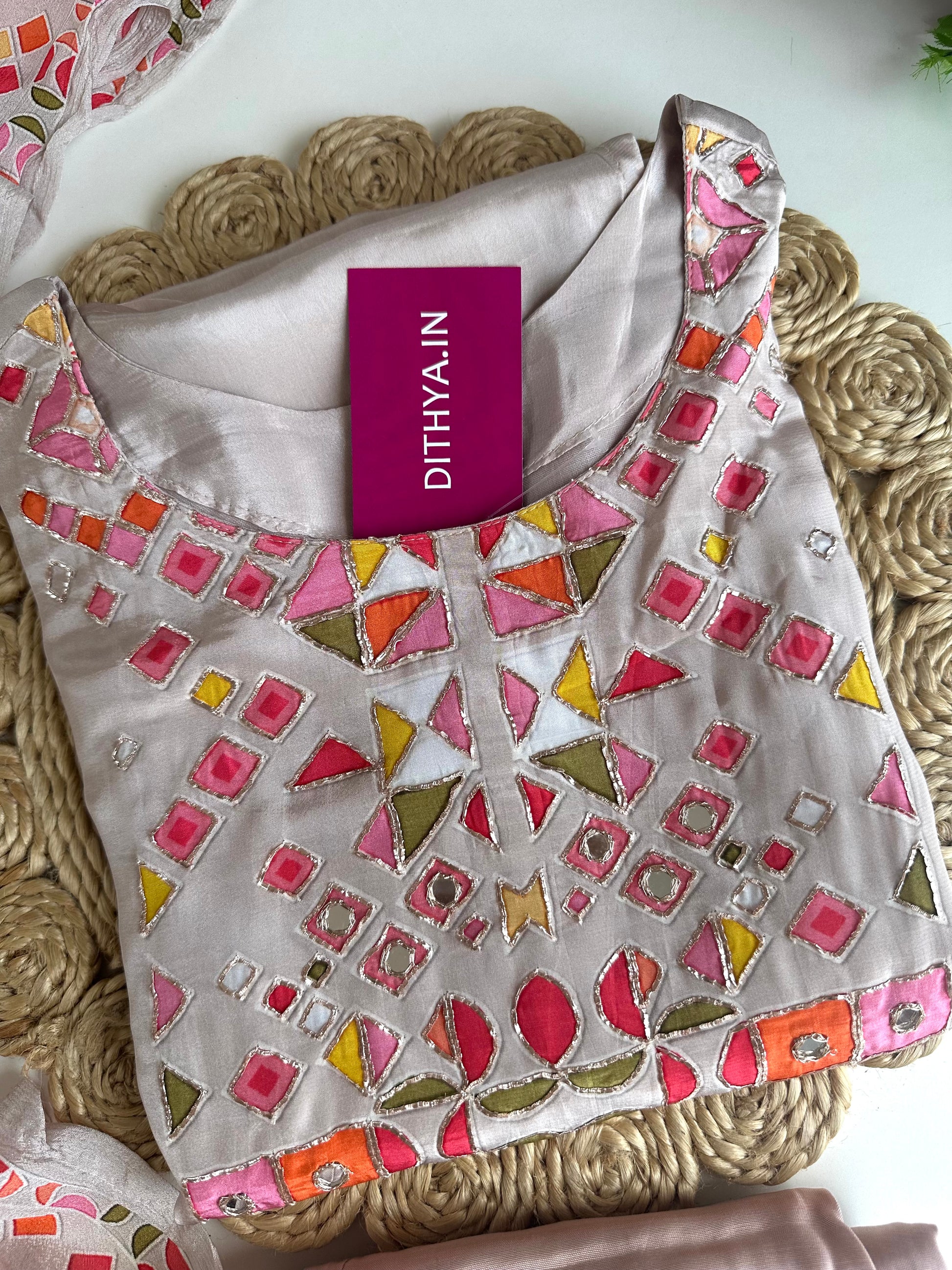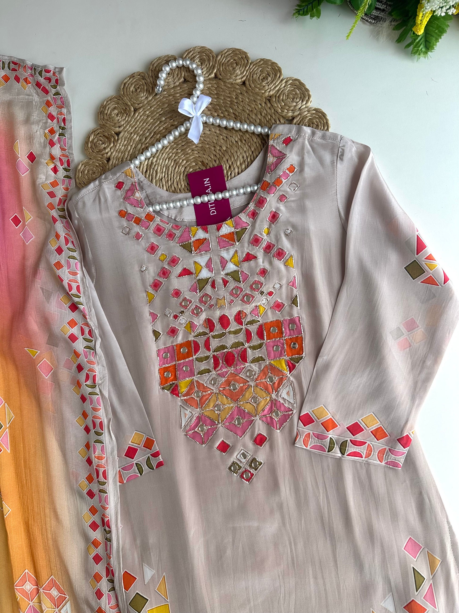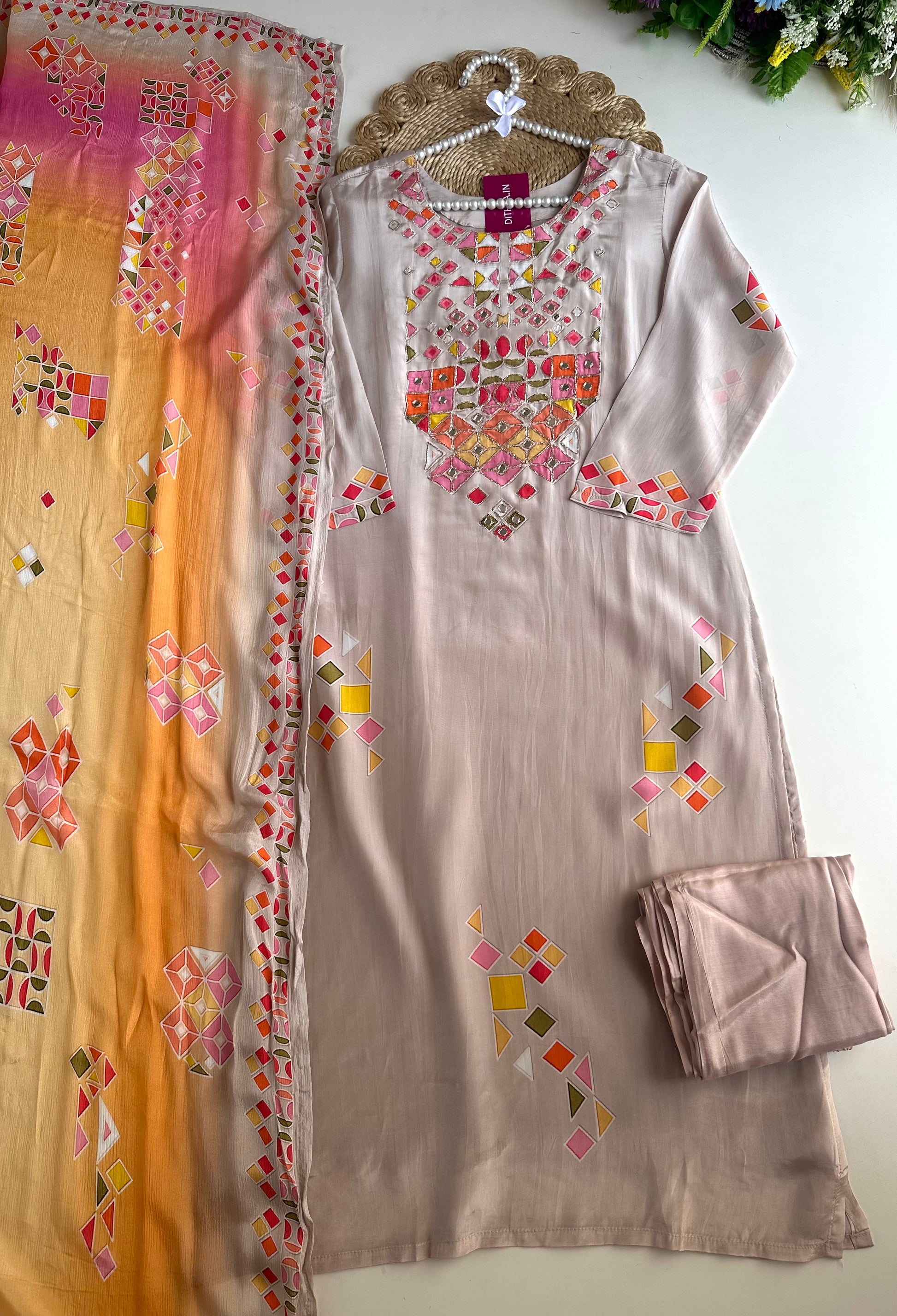 K132 - Pure crape handwork straight Kurti with pants and dupatta