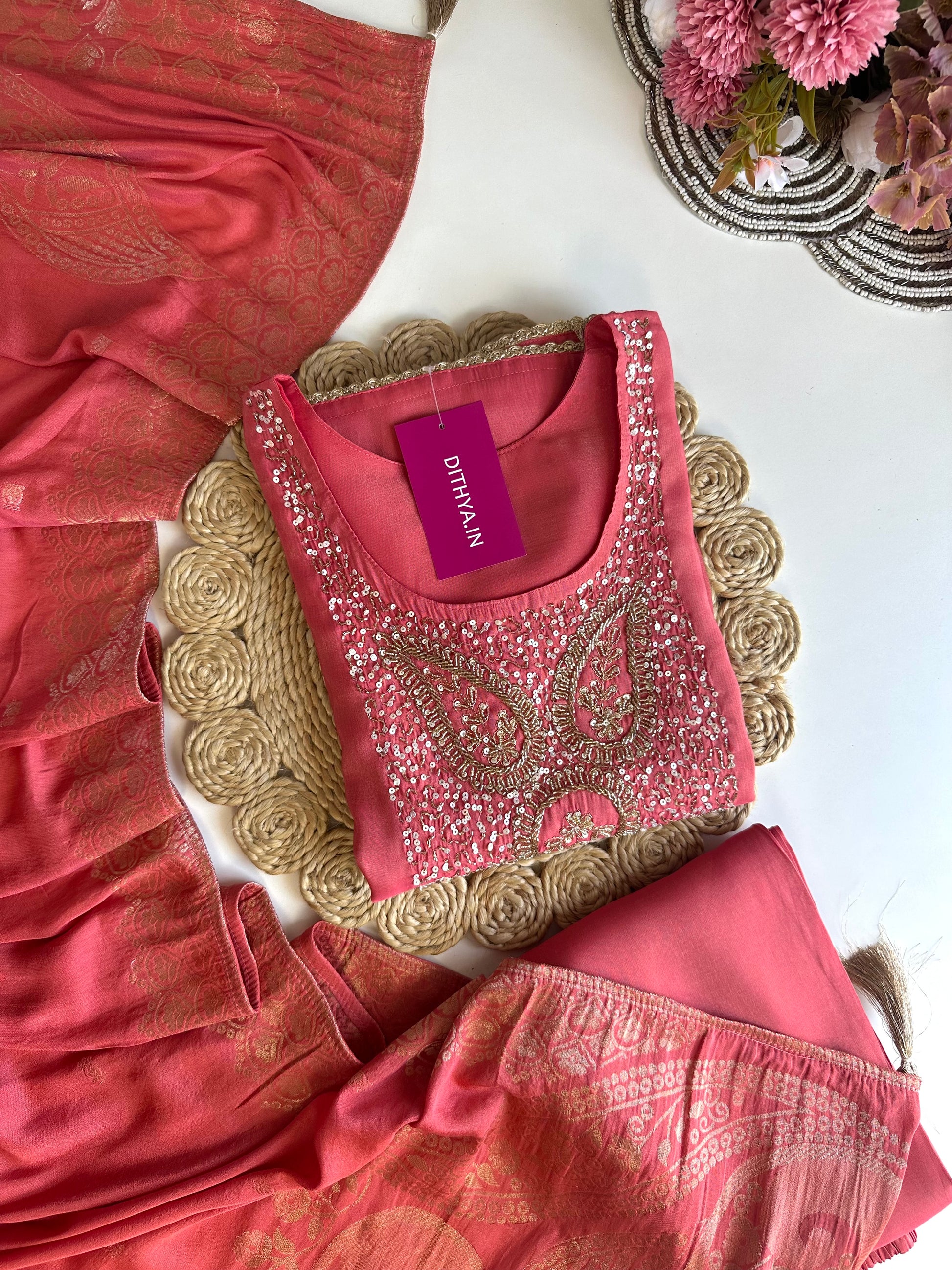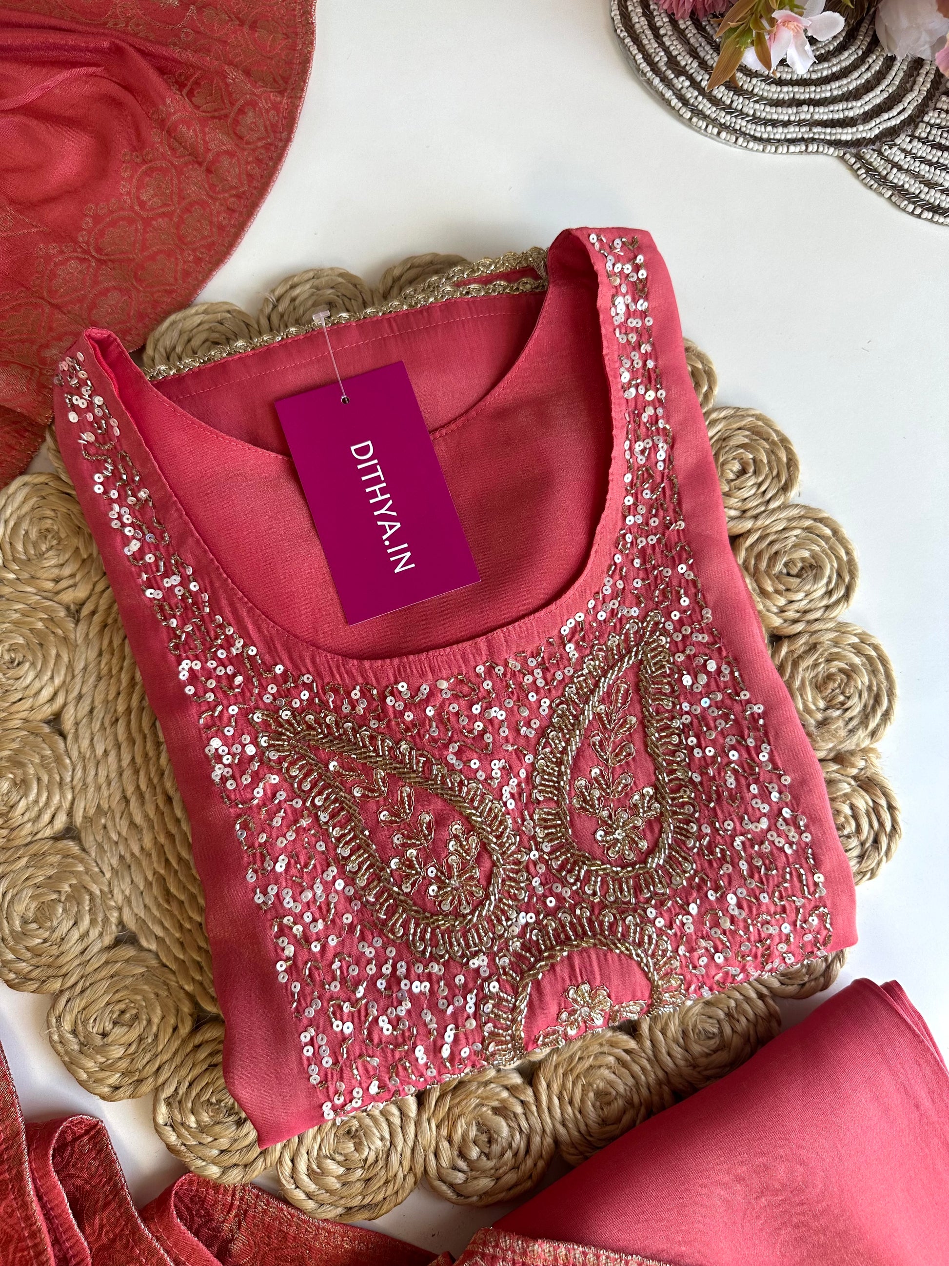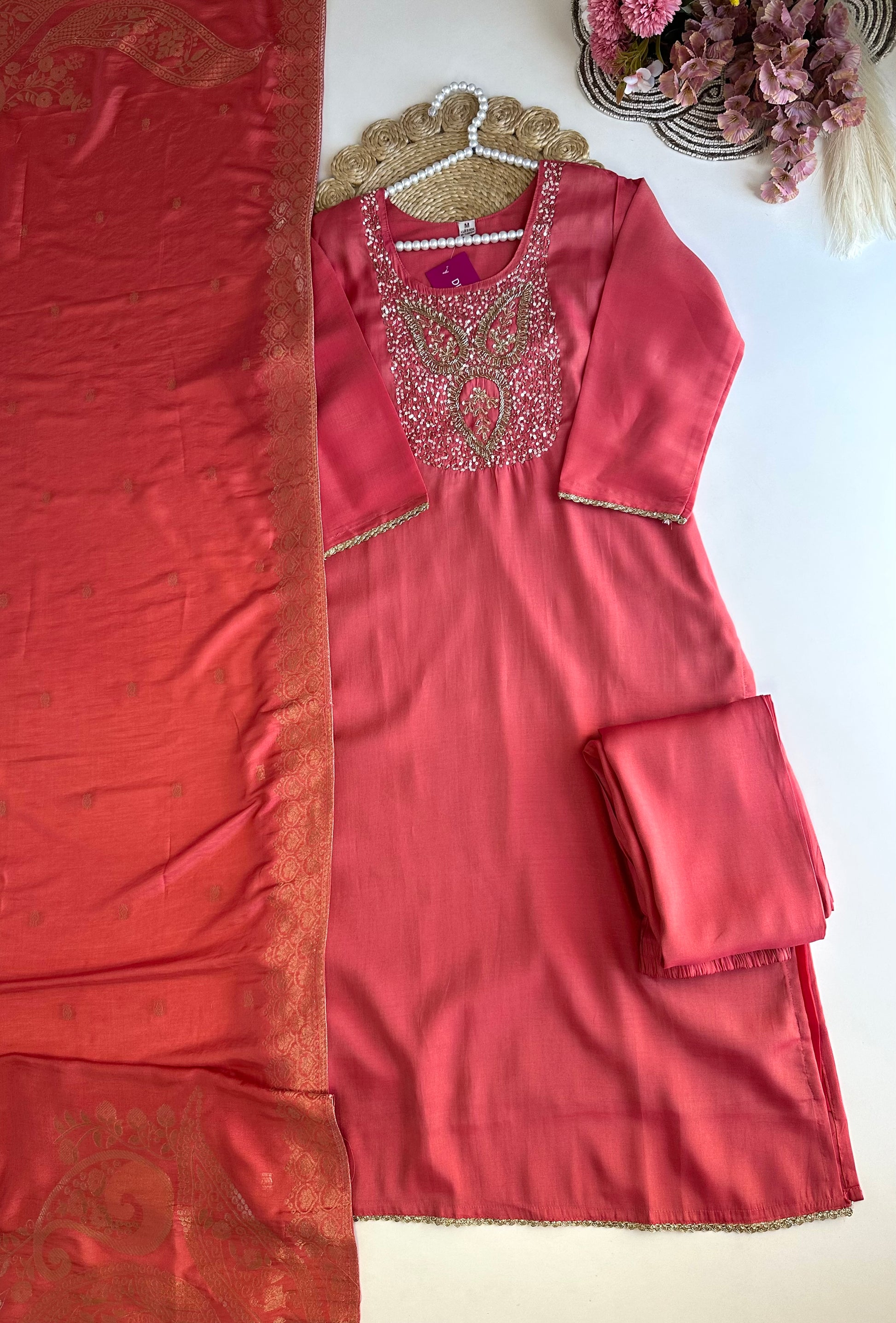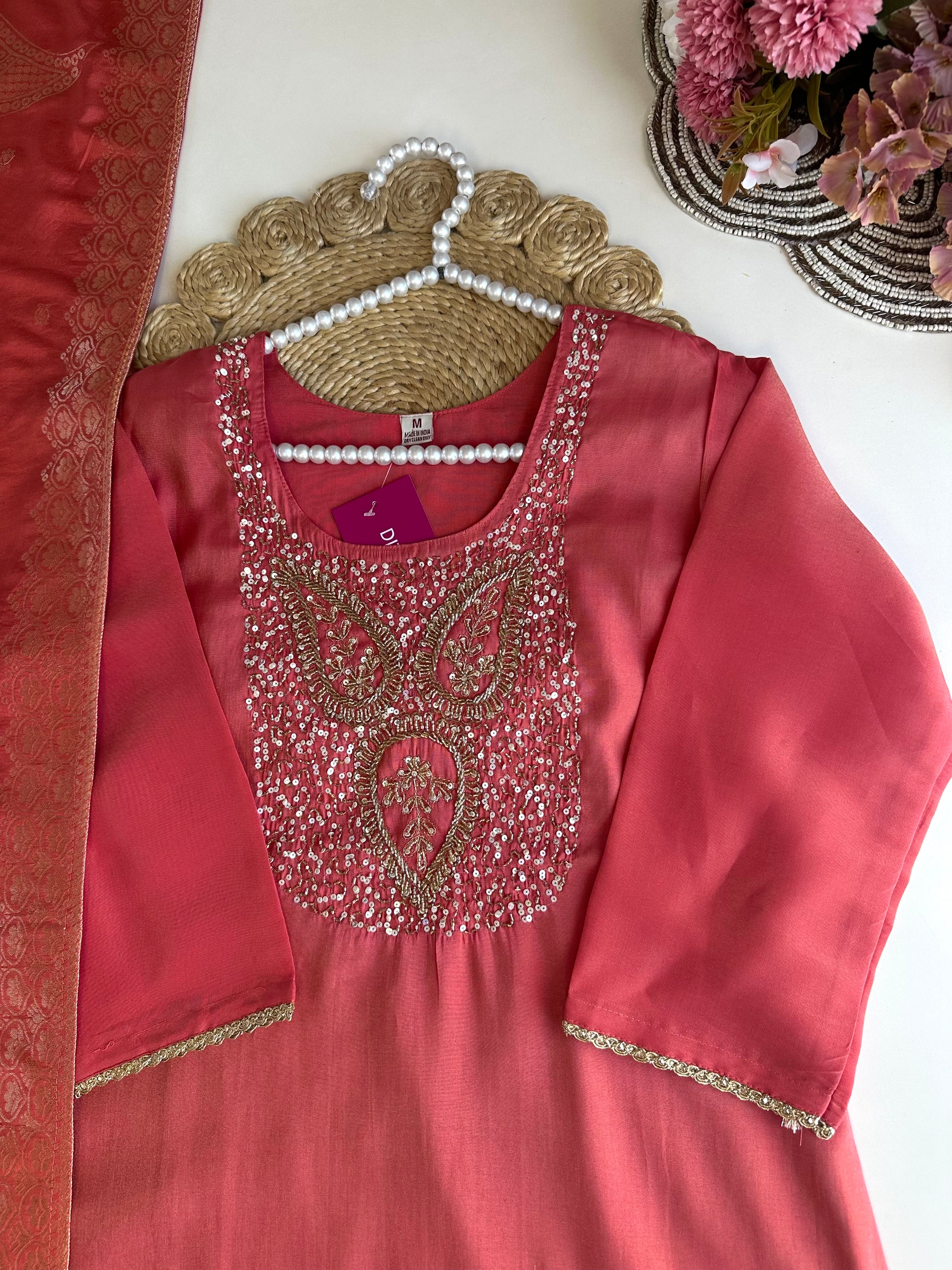 K456 - Roman silk handwork straight Kurti with pants and dupatta