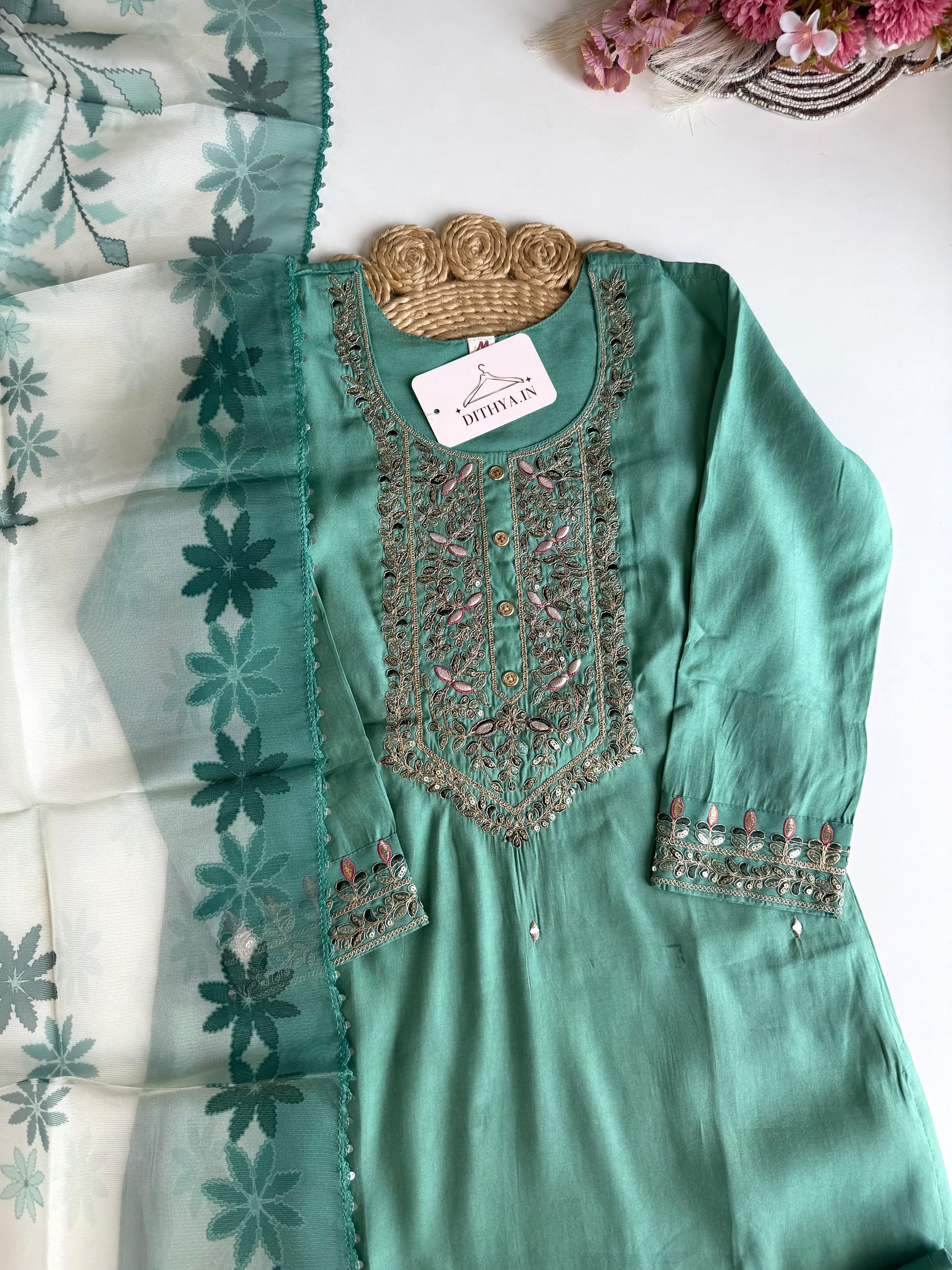 Elevate your ethnic wardrobe with the Roman silk straight Kurti set, featuring matching pants and a dupatta. Crafted from smooth Roman silk, this ensemble offers a refined drape and subtle sheen, ensuring both comfort and elegance. The straight cut of the Kurti provides a flattering silhouette, perfect for formal occasions or festive events. Paired with coordinating pants and a dupatta, this set delivers a complete, coordinated look with minimal effort.