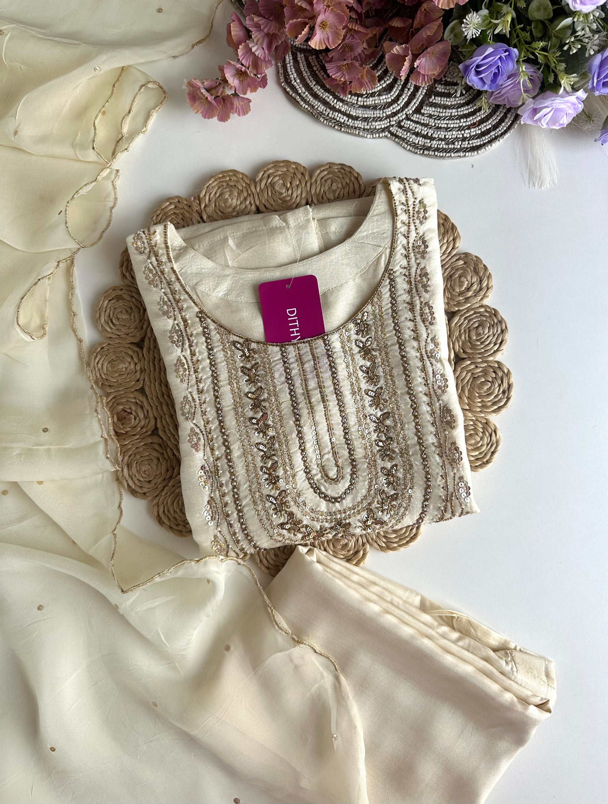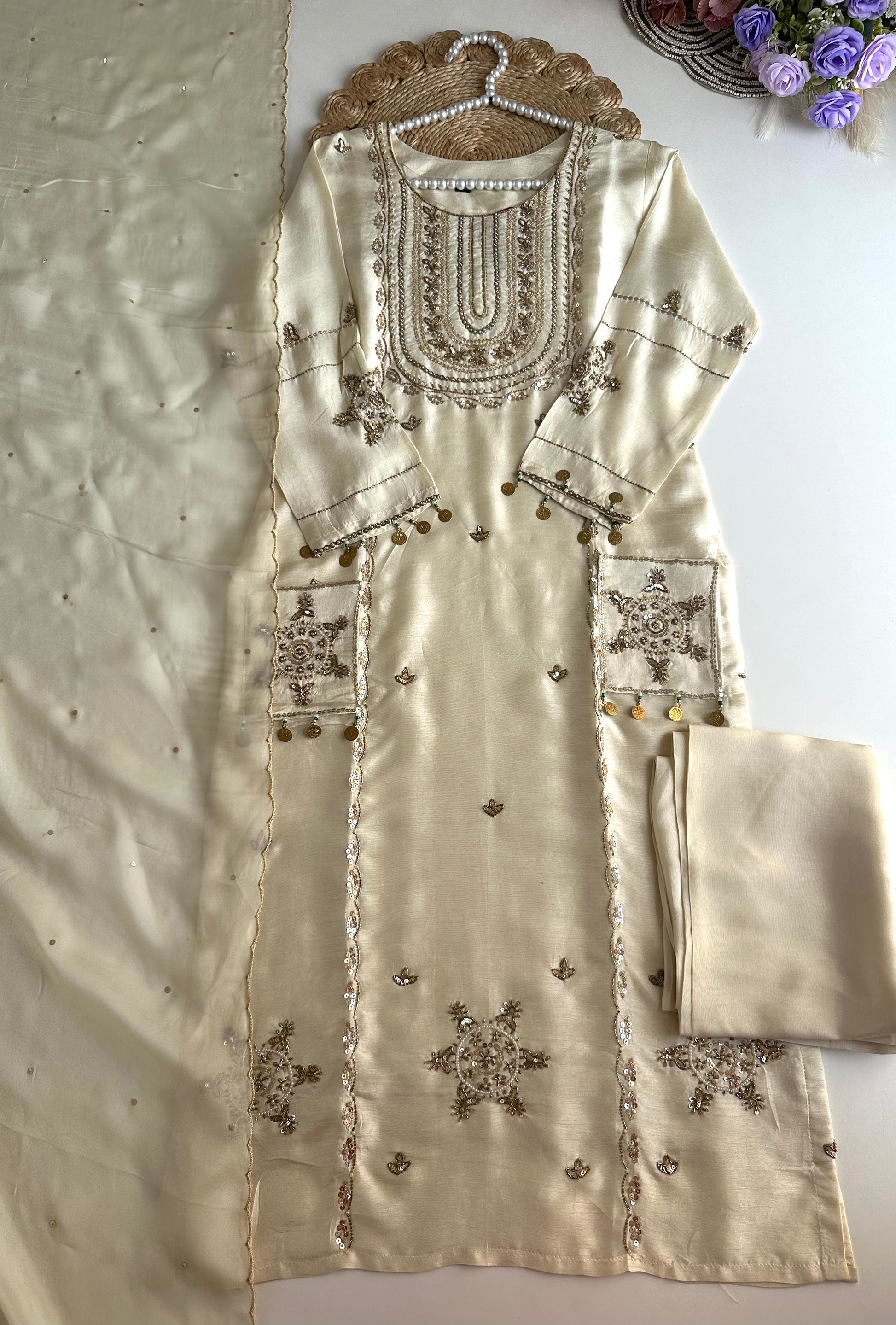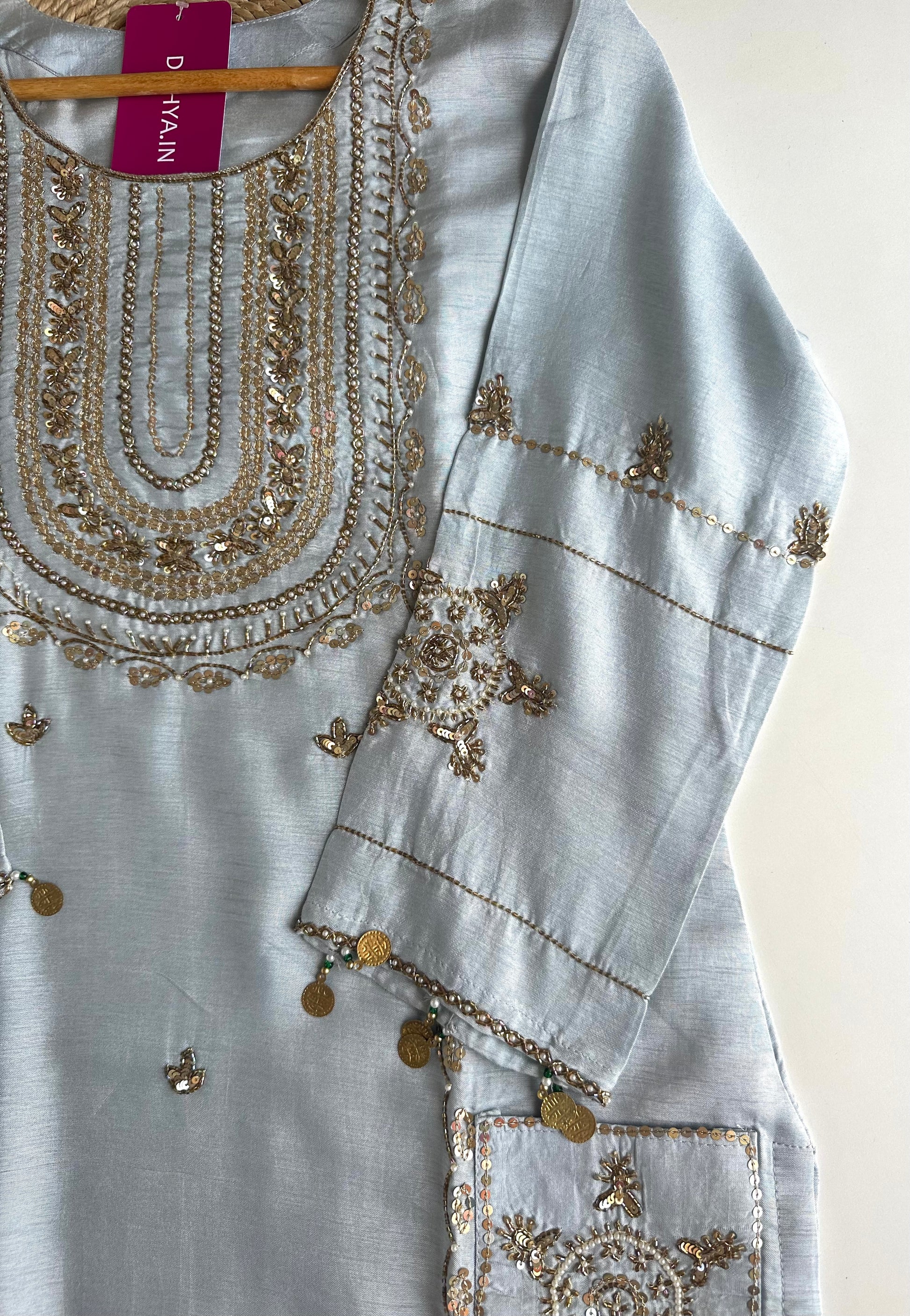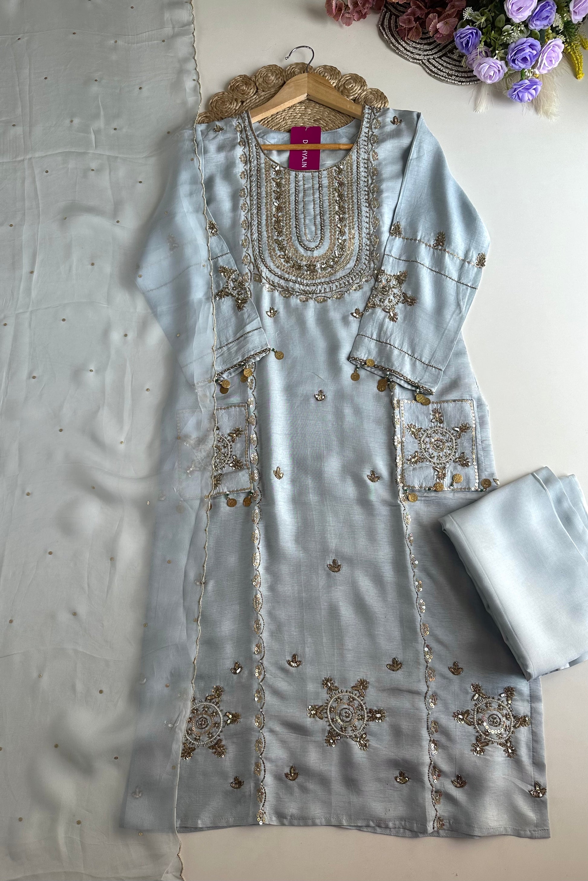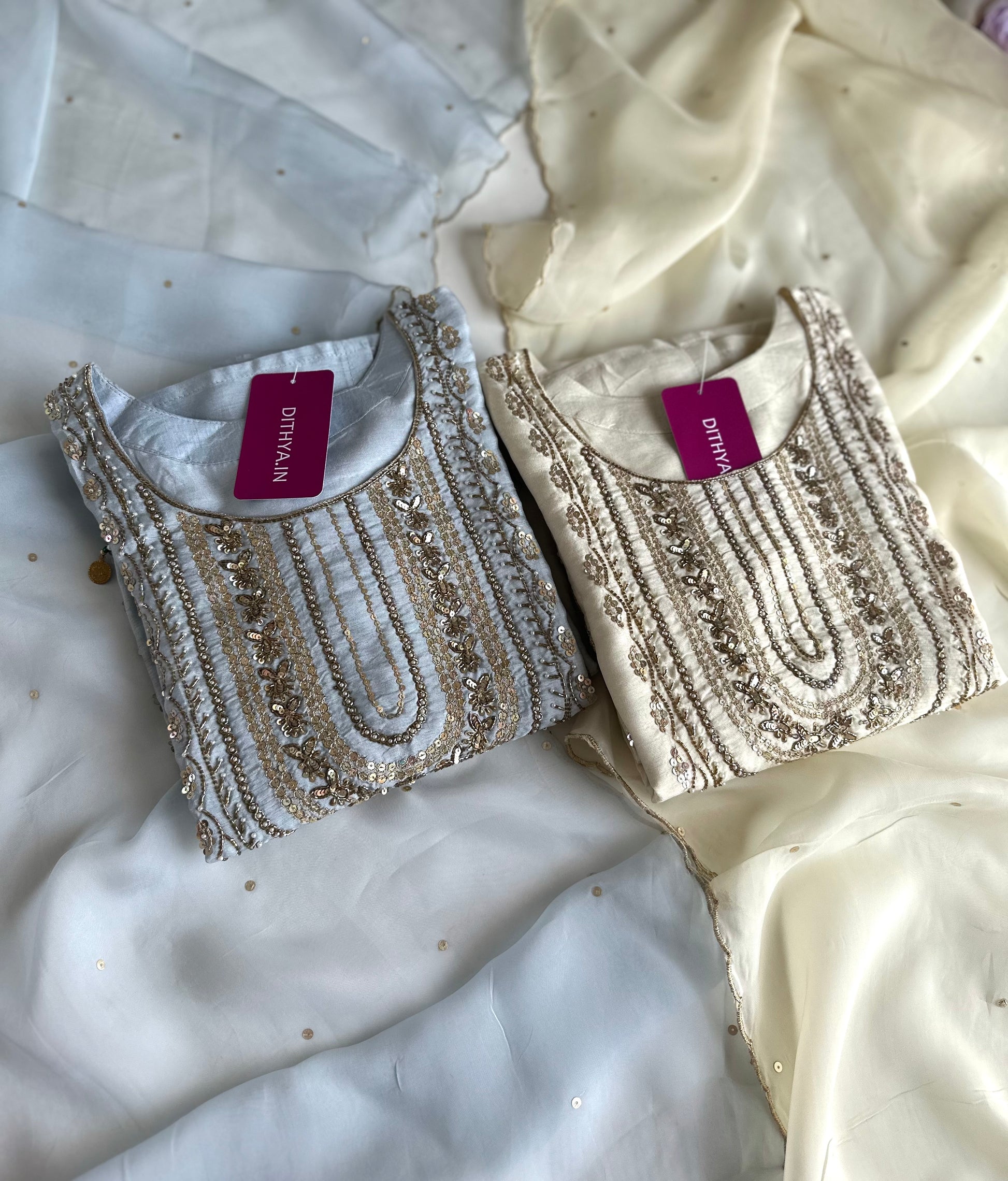 K188 - Russian silk handwork straight Kurti with pants and dupatta in 2 colours