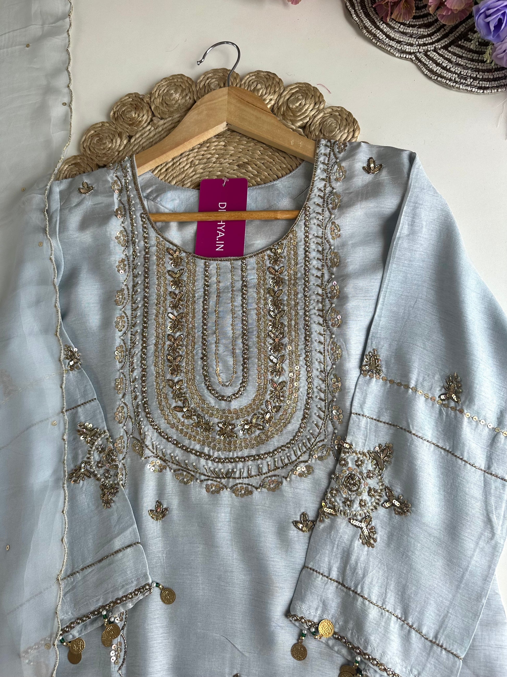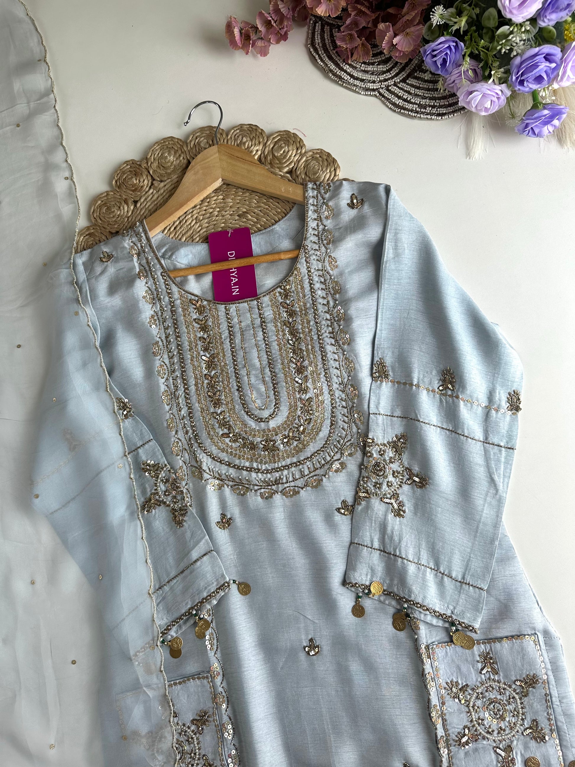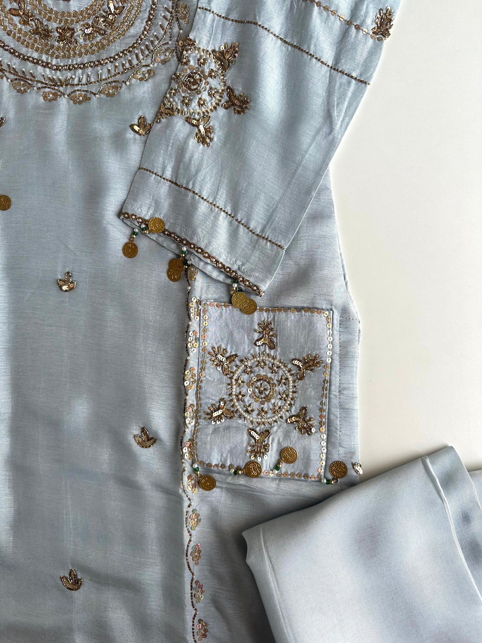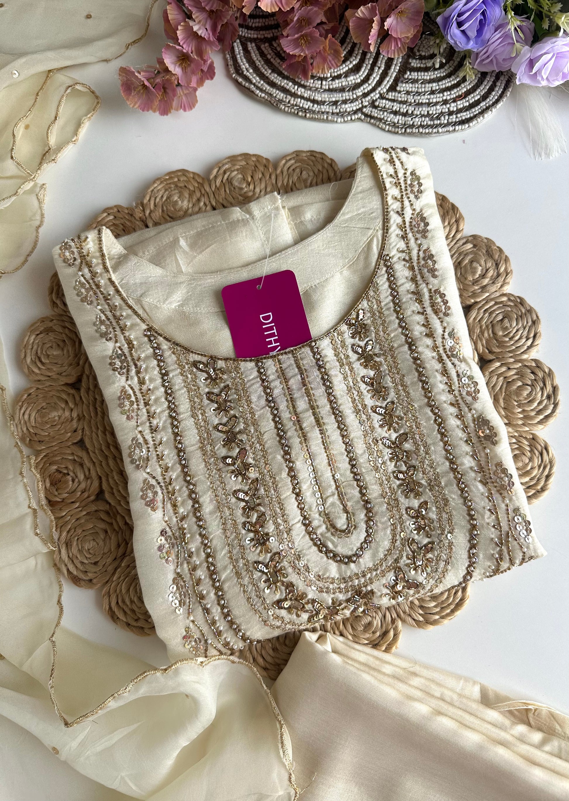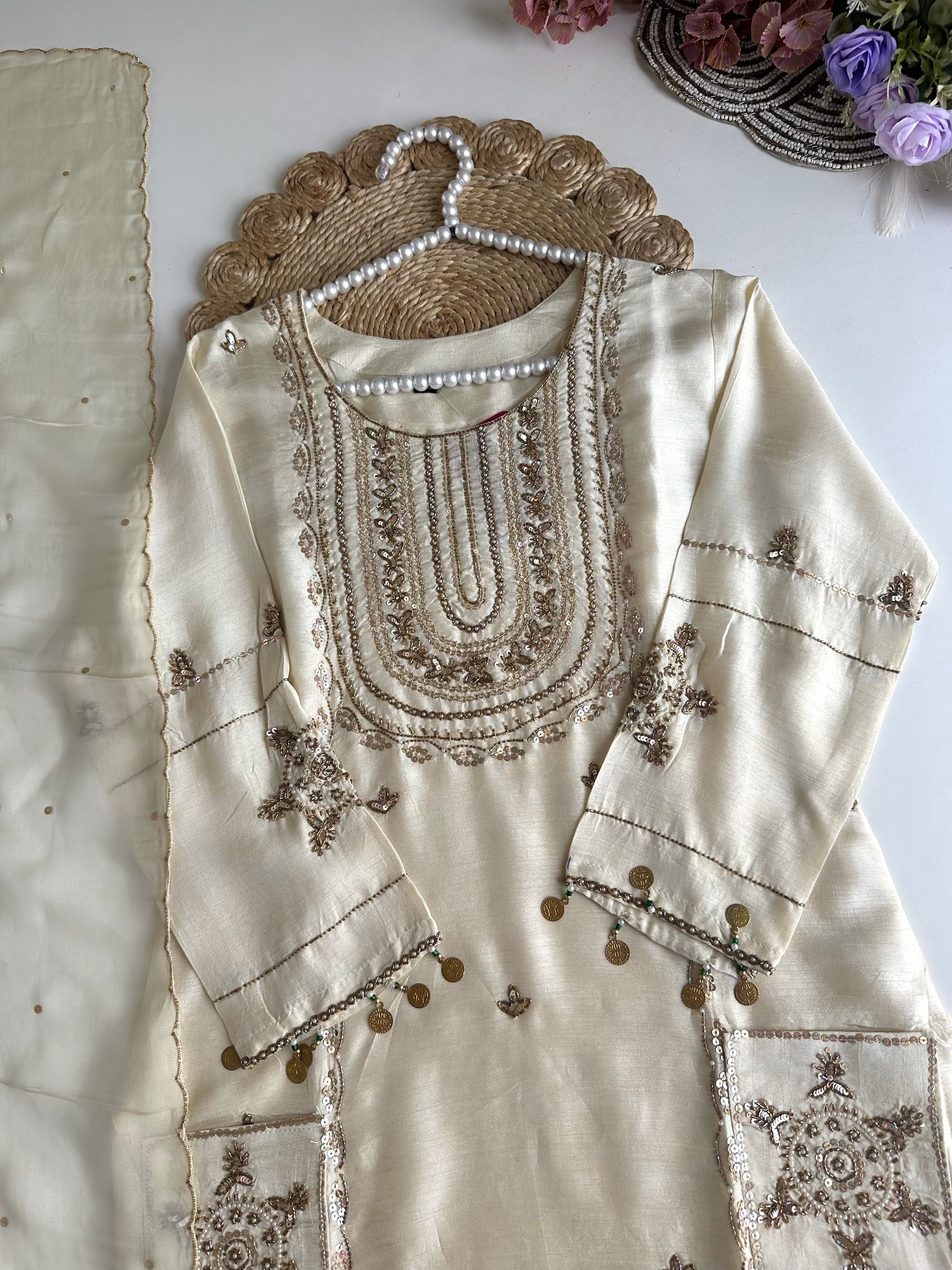 K188 - Russian silk handwork straight Kurti with pants and dupatta in 2 colours