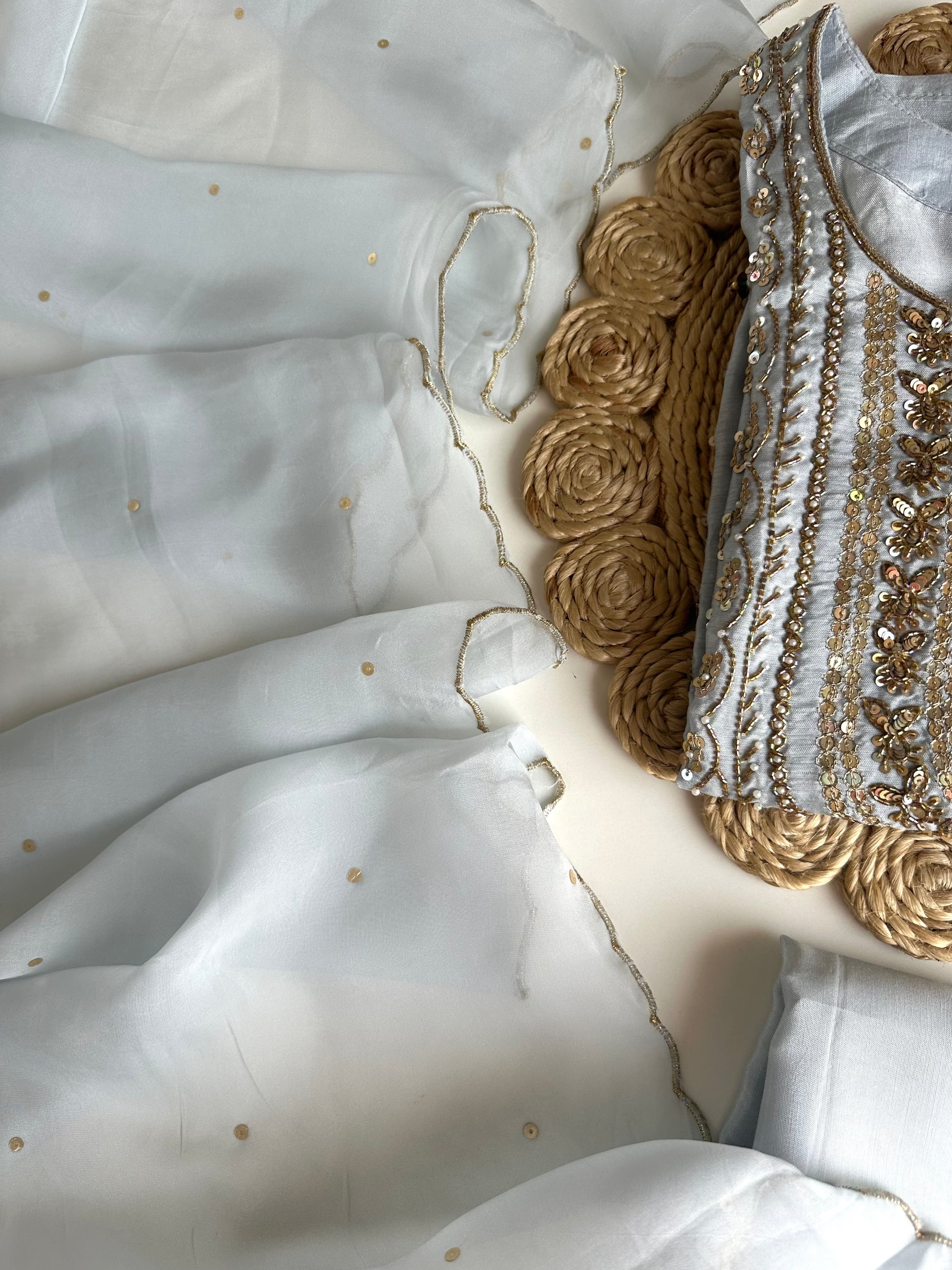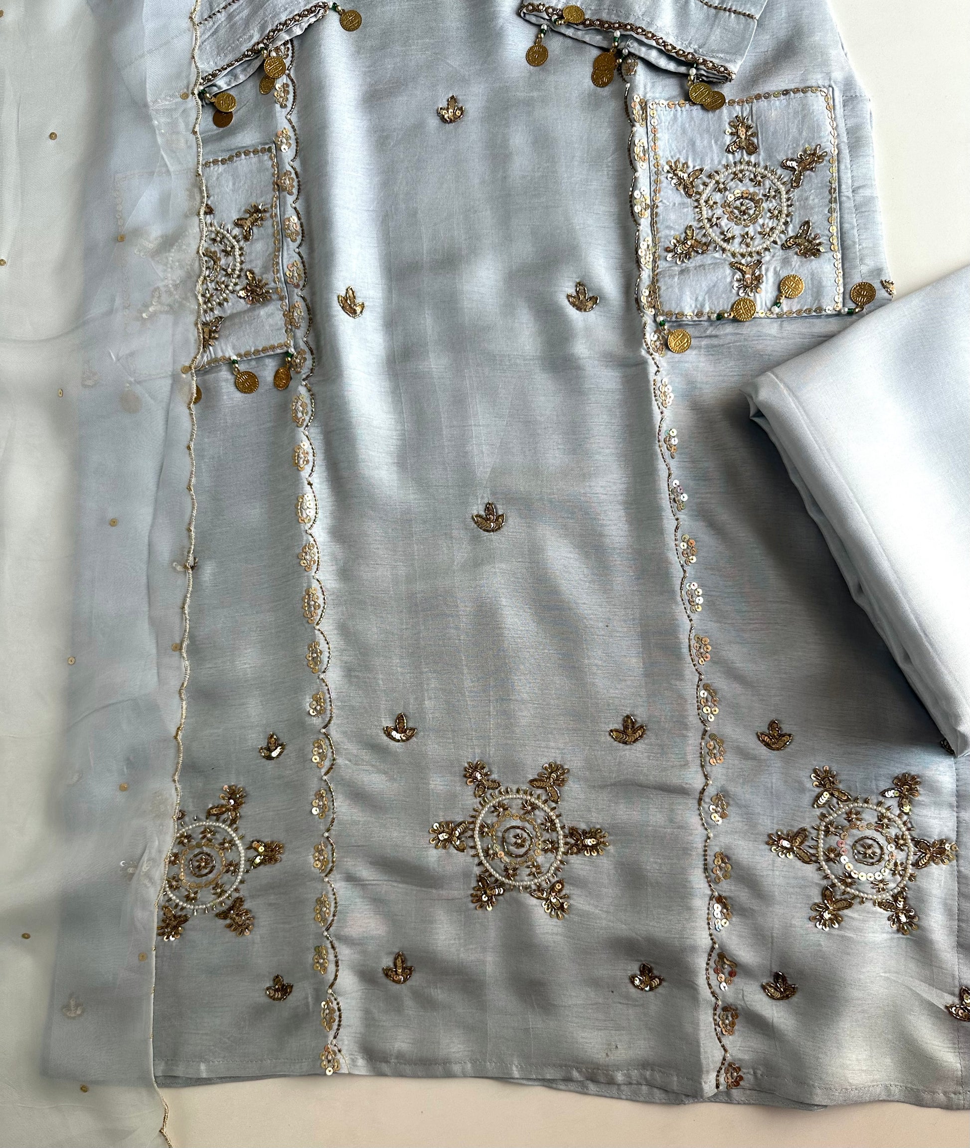 Expertly crafted from luxurious Russian silk by skilled artisans, our K188 Kurti brings elegance and style to your wardrobe. The beautifully handworked design and straight cut silhouette make it a versatile piece that can be dressed up or down. Comes with coordinating pants and dupatta in your choice of two stunning colours.