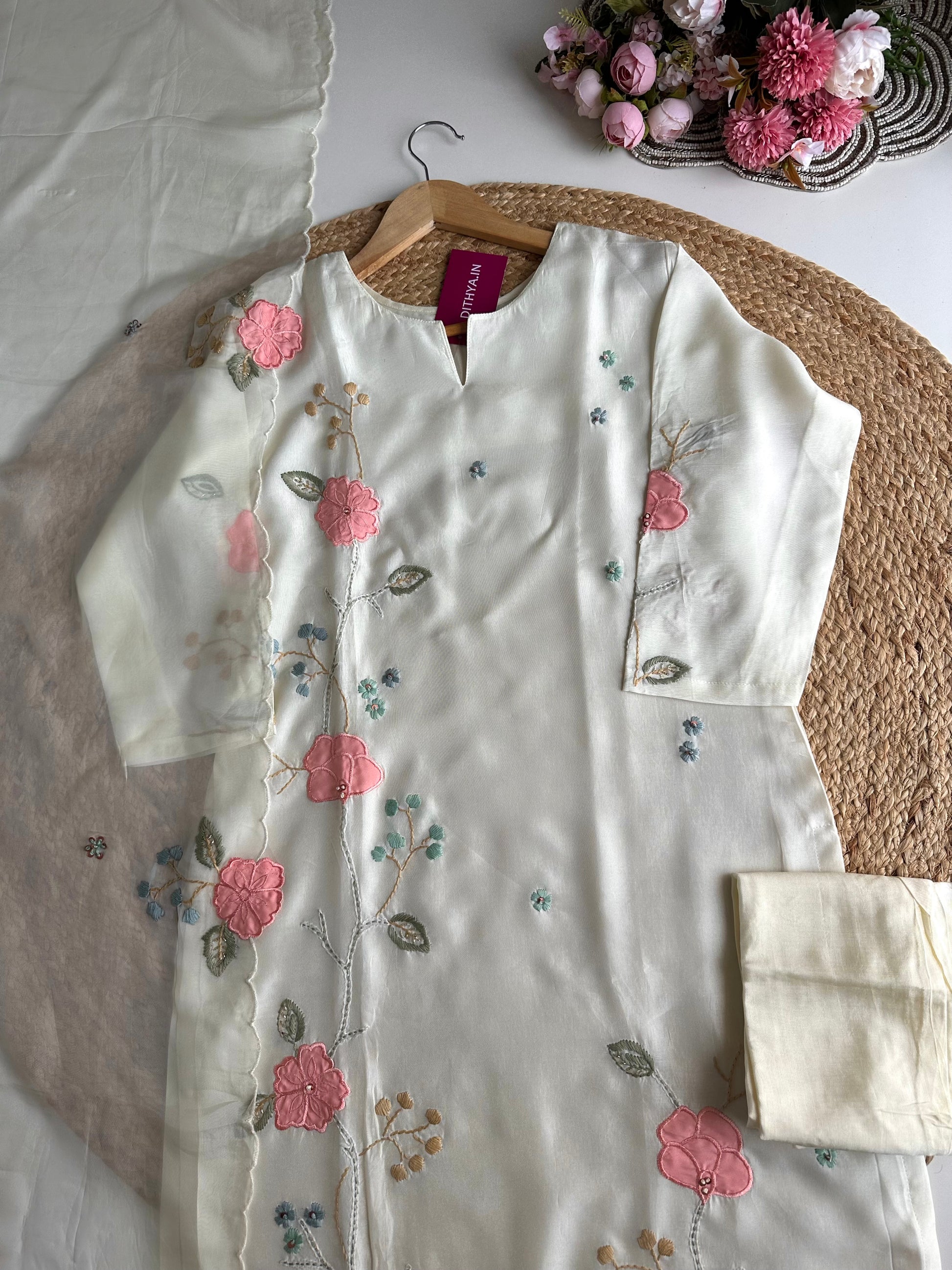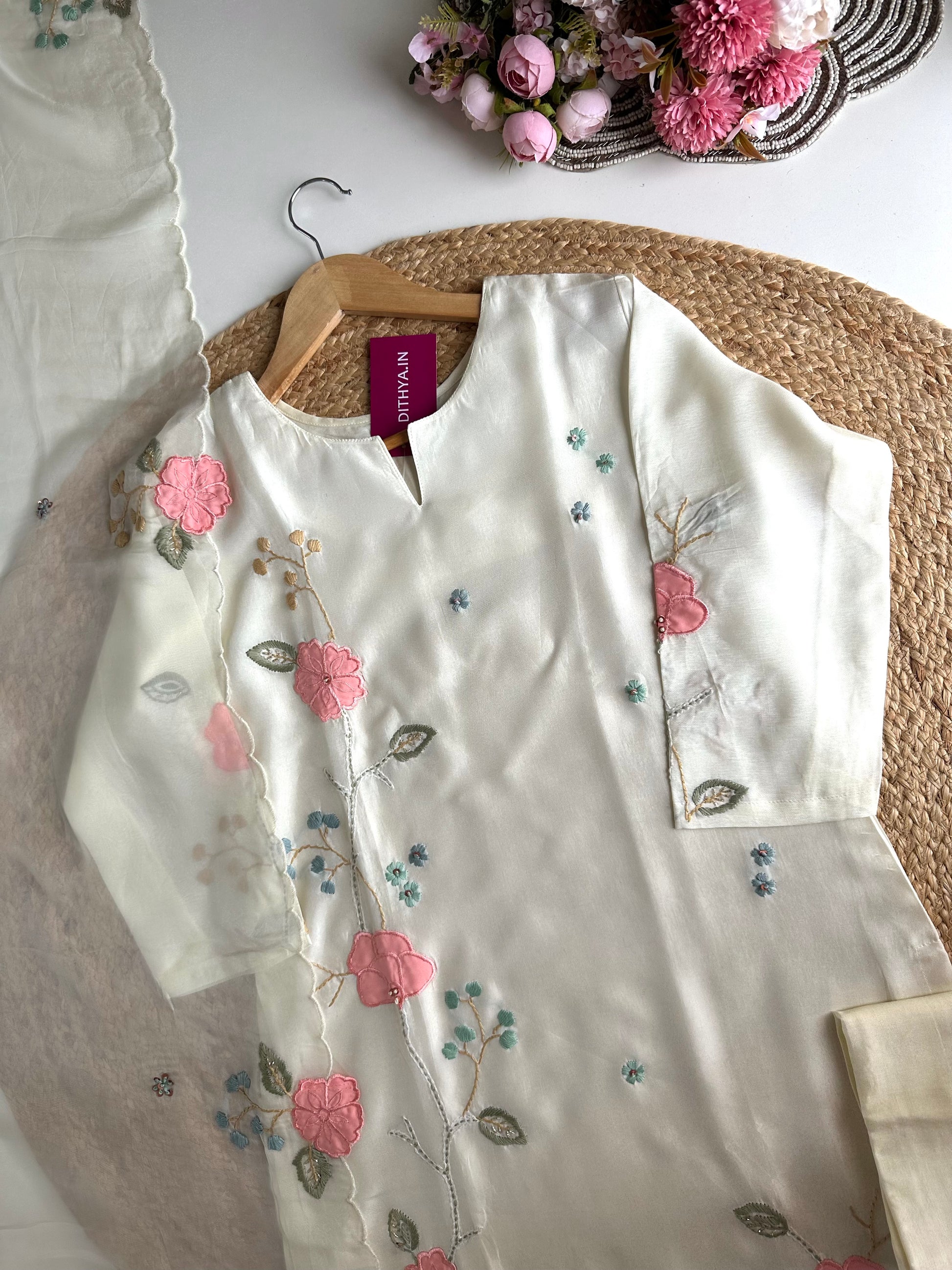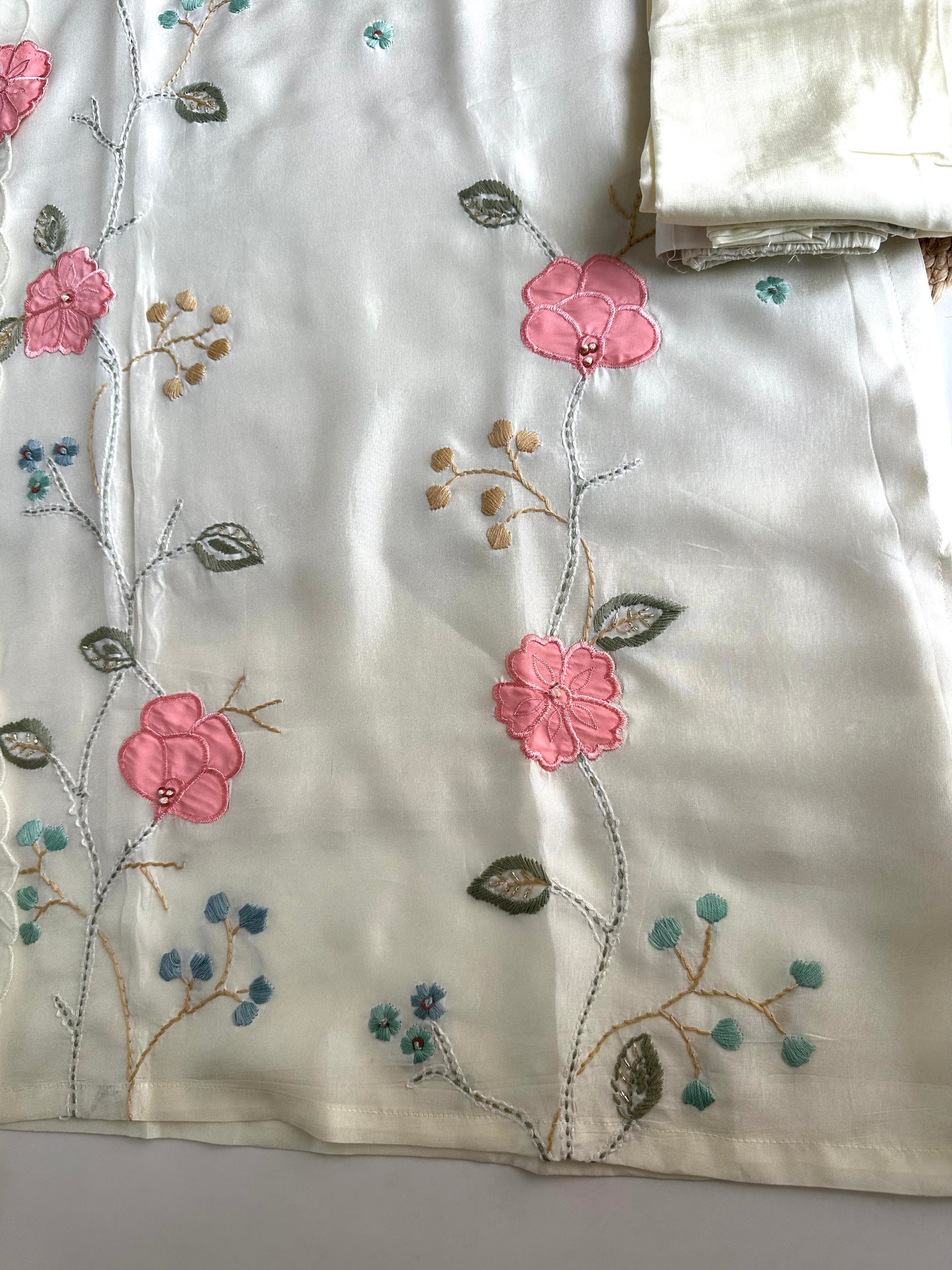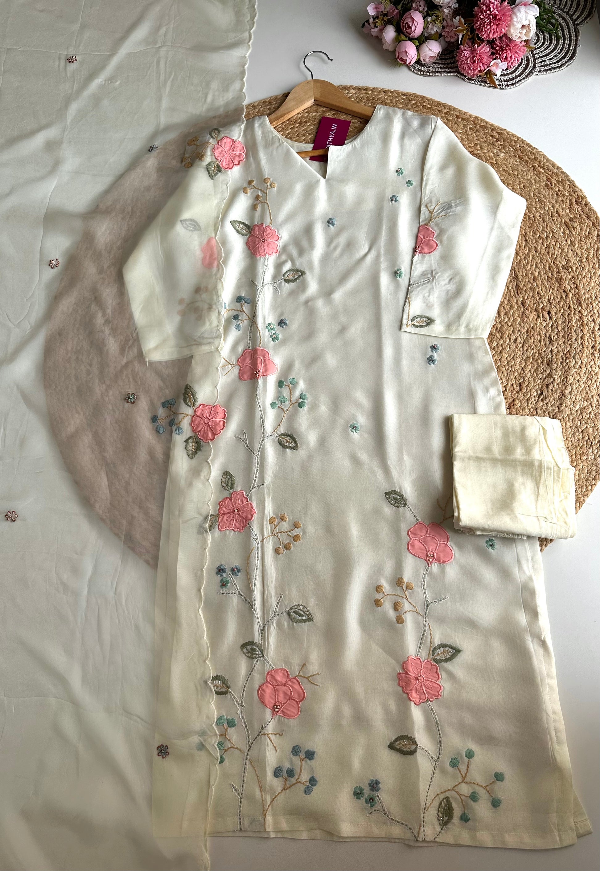 K139 - Russian silk Appliqué work straight Kurti with pants and dupatta