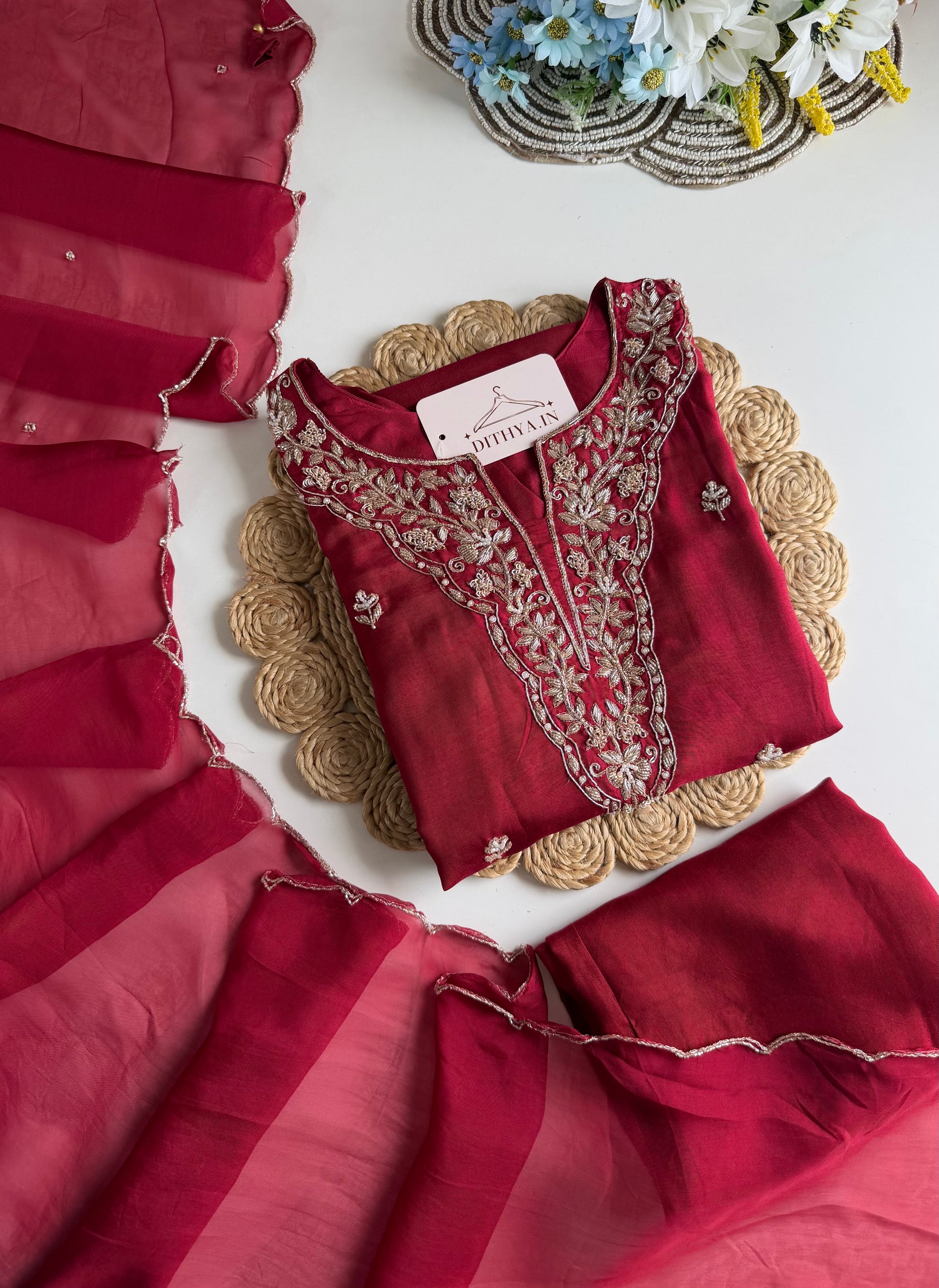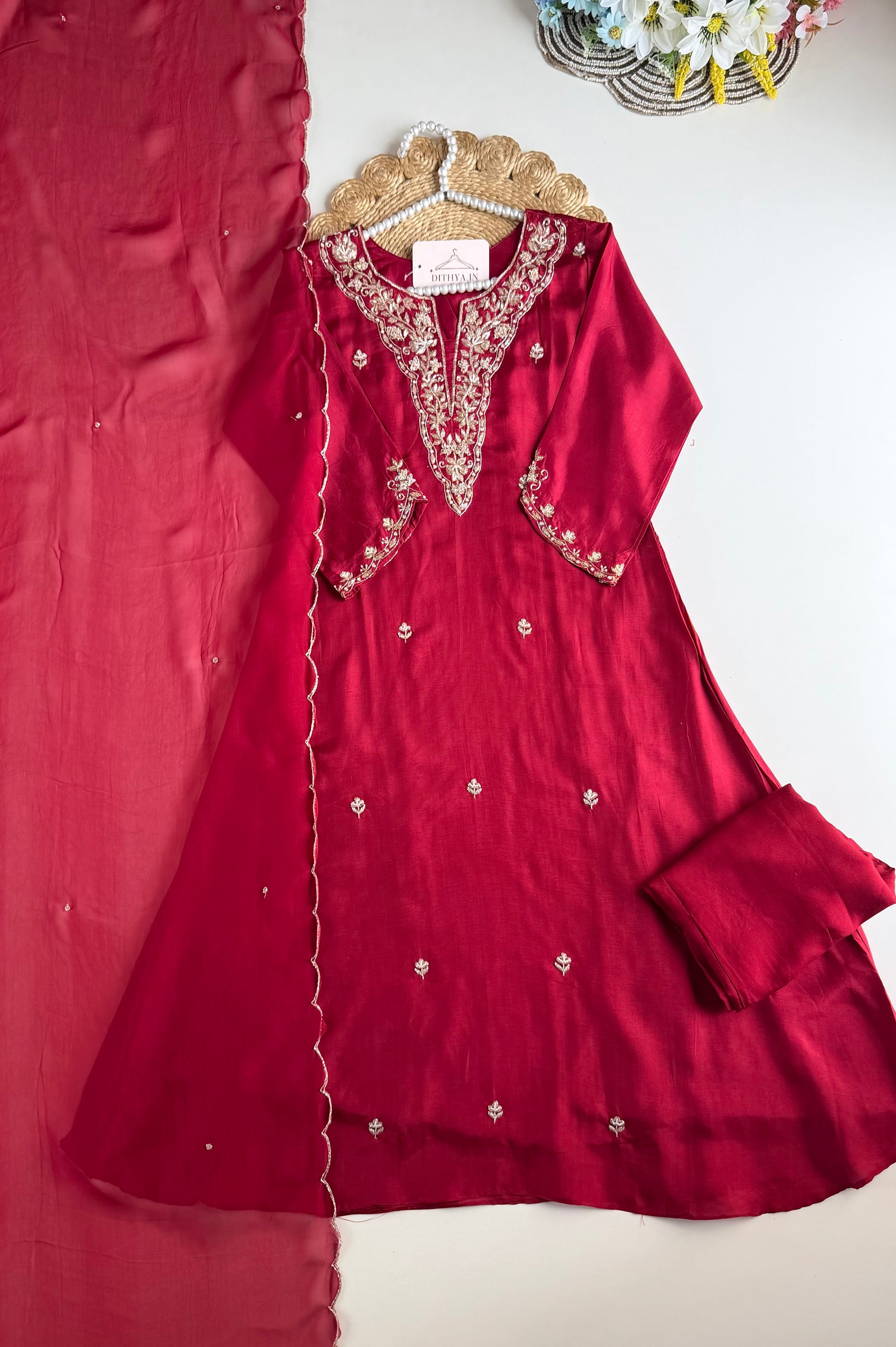 Elevate your style with our Russian silk handwork aline Kurti, complete with matching pants and dupatta. Made with high-quality Russian silk, this ensemble boasts intricate handiwork and a flattering A-line cut. Perfect for any occasion, indulge in the luxurious feel of silk while making a statement with your fashion choices.