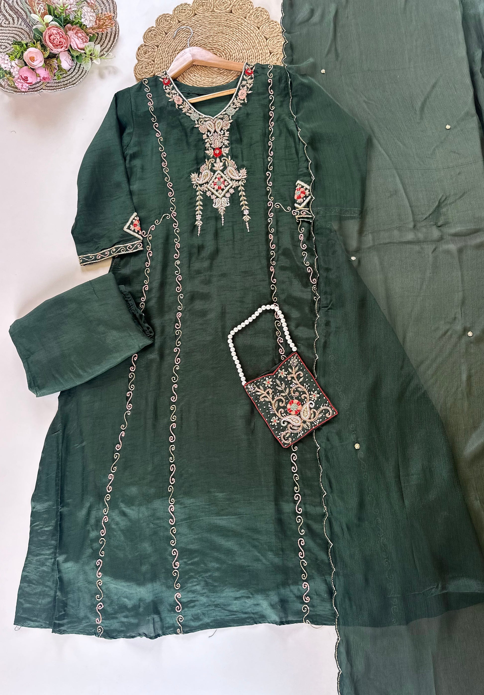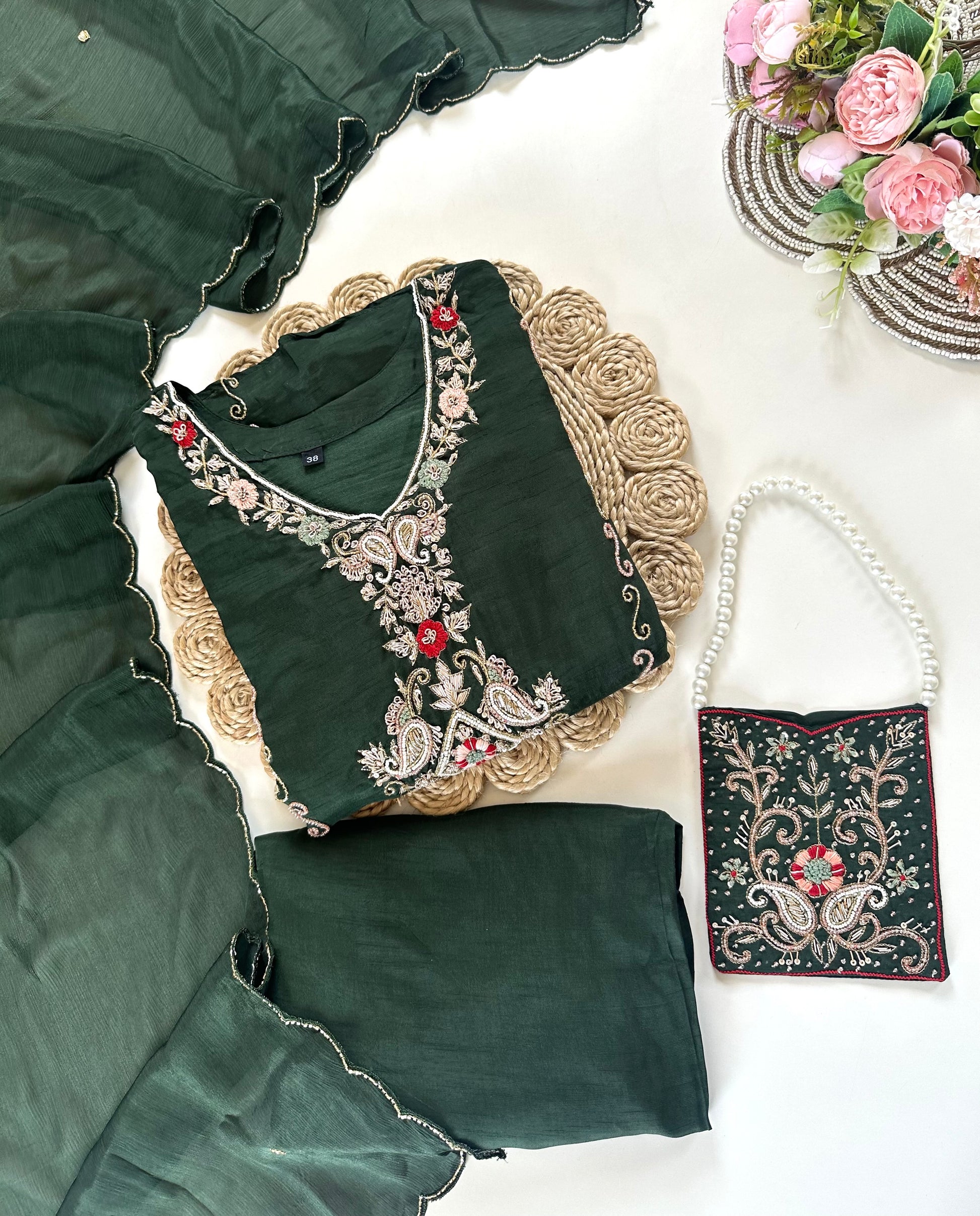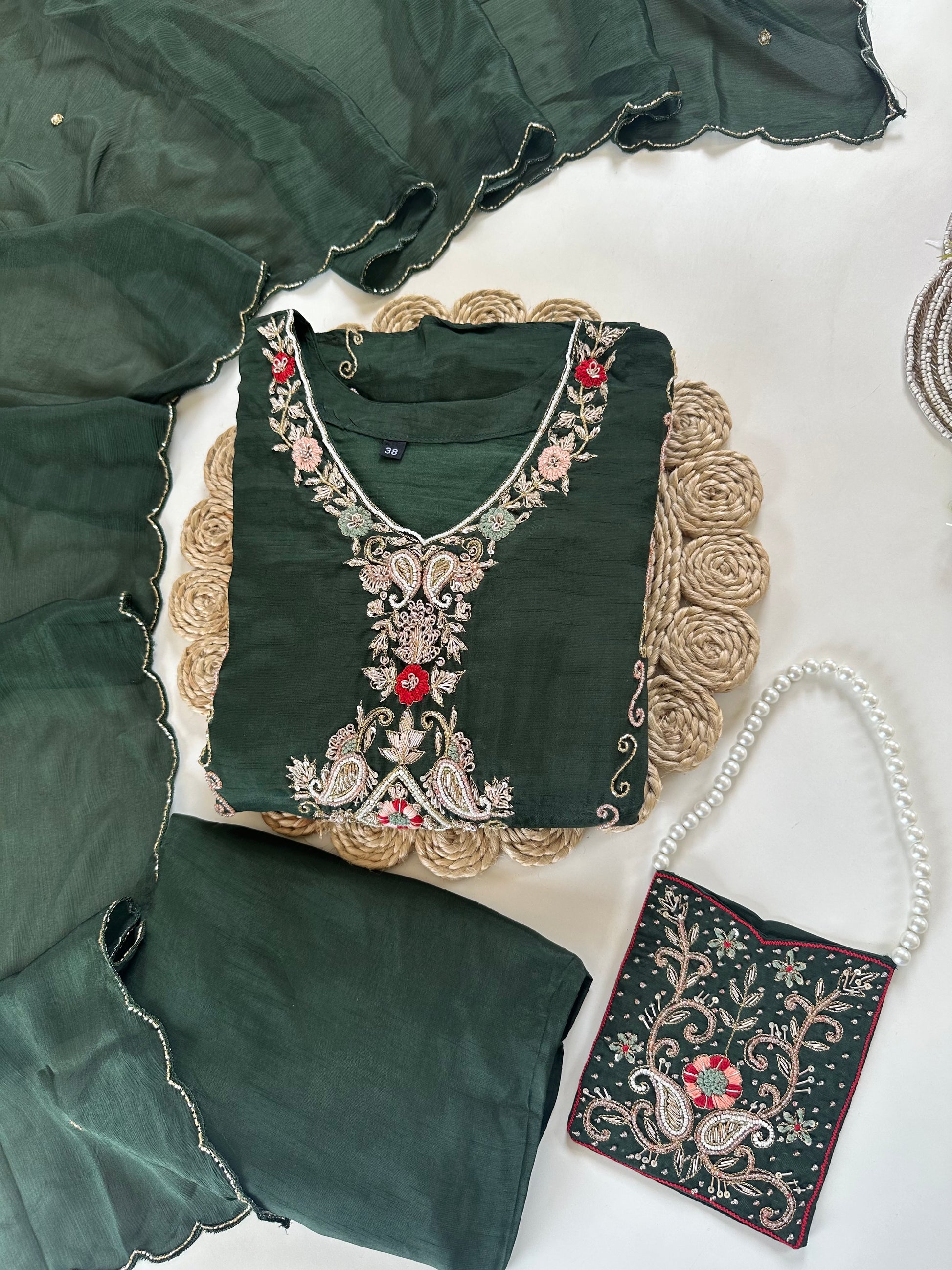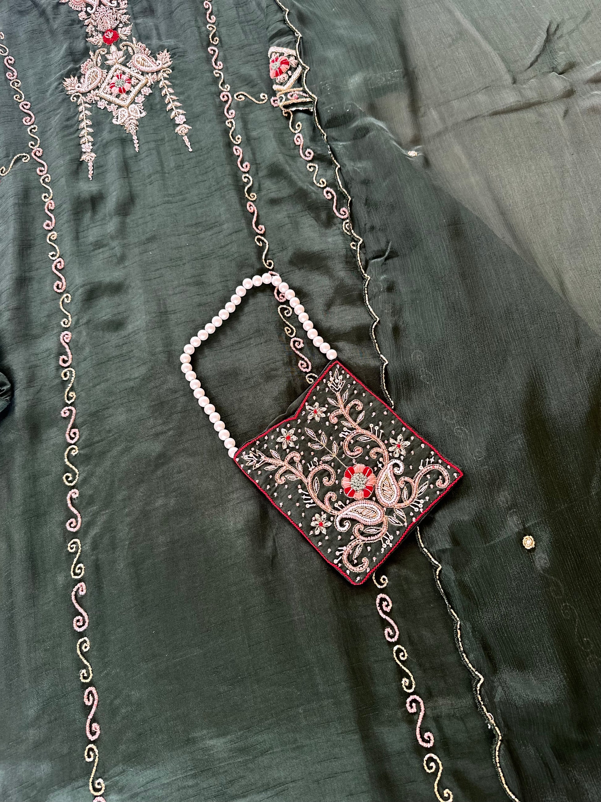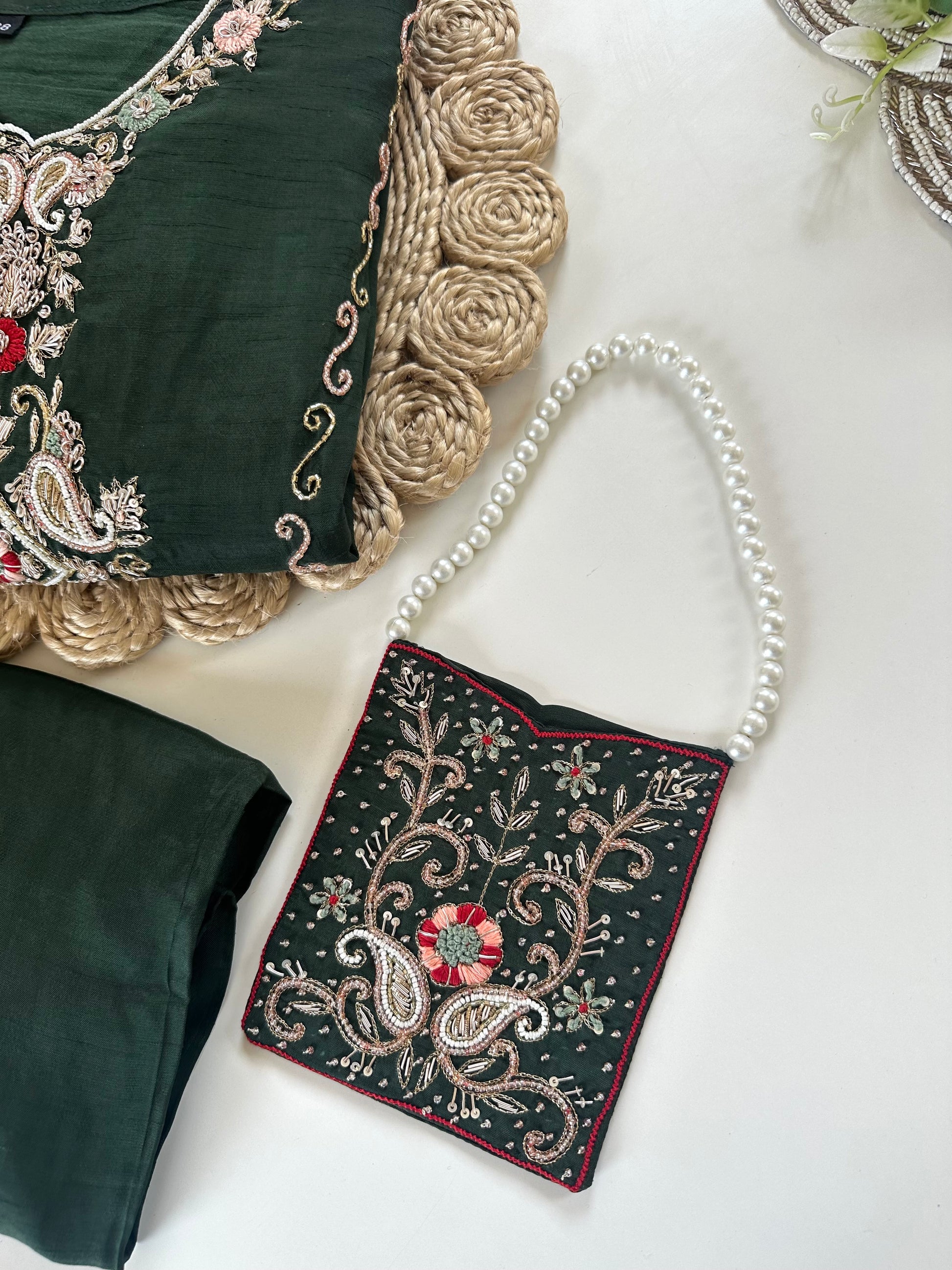 K311 - Russian silk handwork Aline Kurti with pants, dupatta and potli bag .