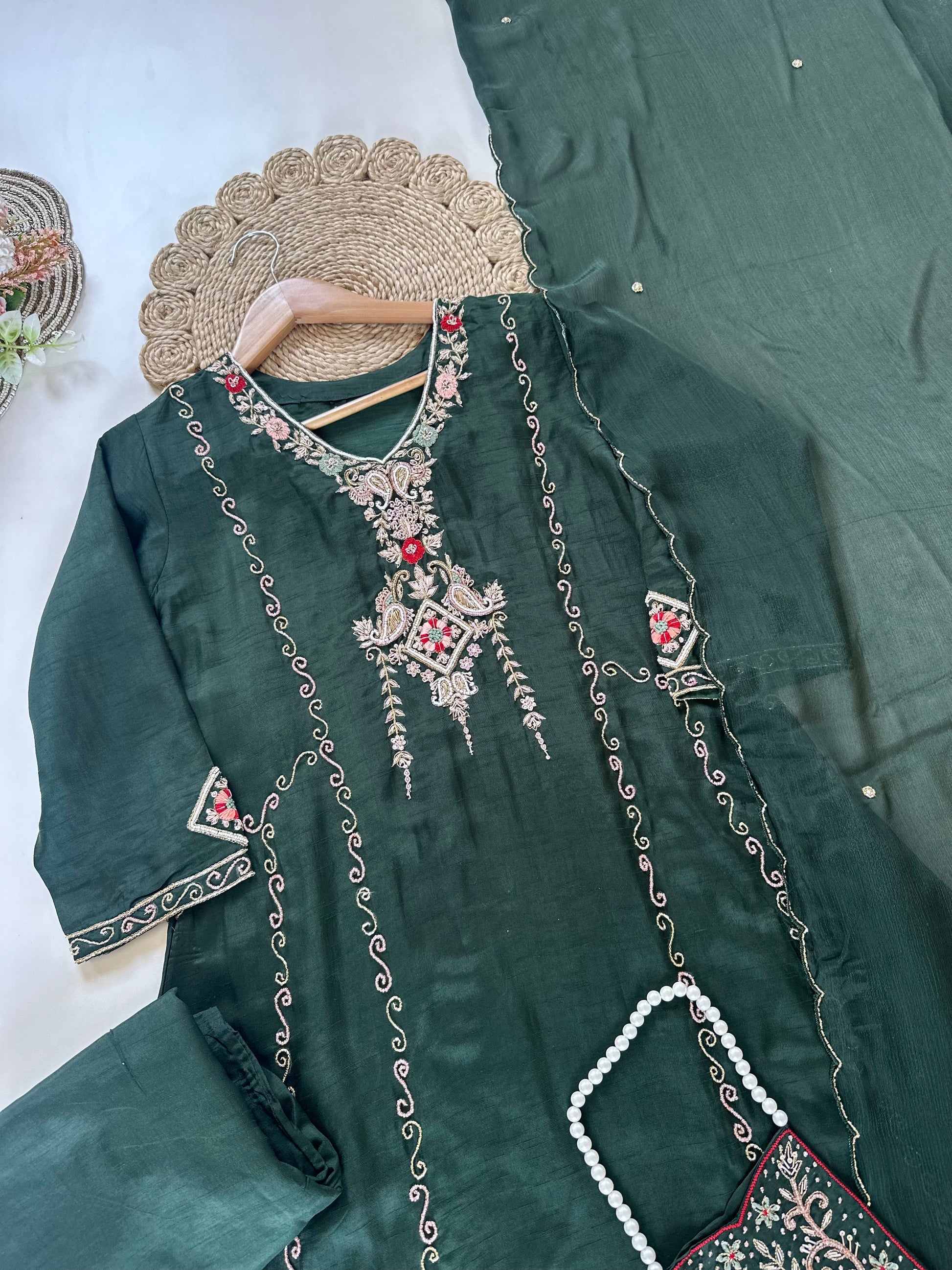 Discover the beauty of Russian silk with our handcrafted Aline Kurti. This elegant set comes with pants, dupatta, and potli bag, making it a complete outfit. The intricate handwork adds a touch of sophistication, while the premium fabric ensures comfort and durability. Elevate your wardrobe with this timeless piece.