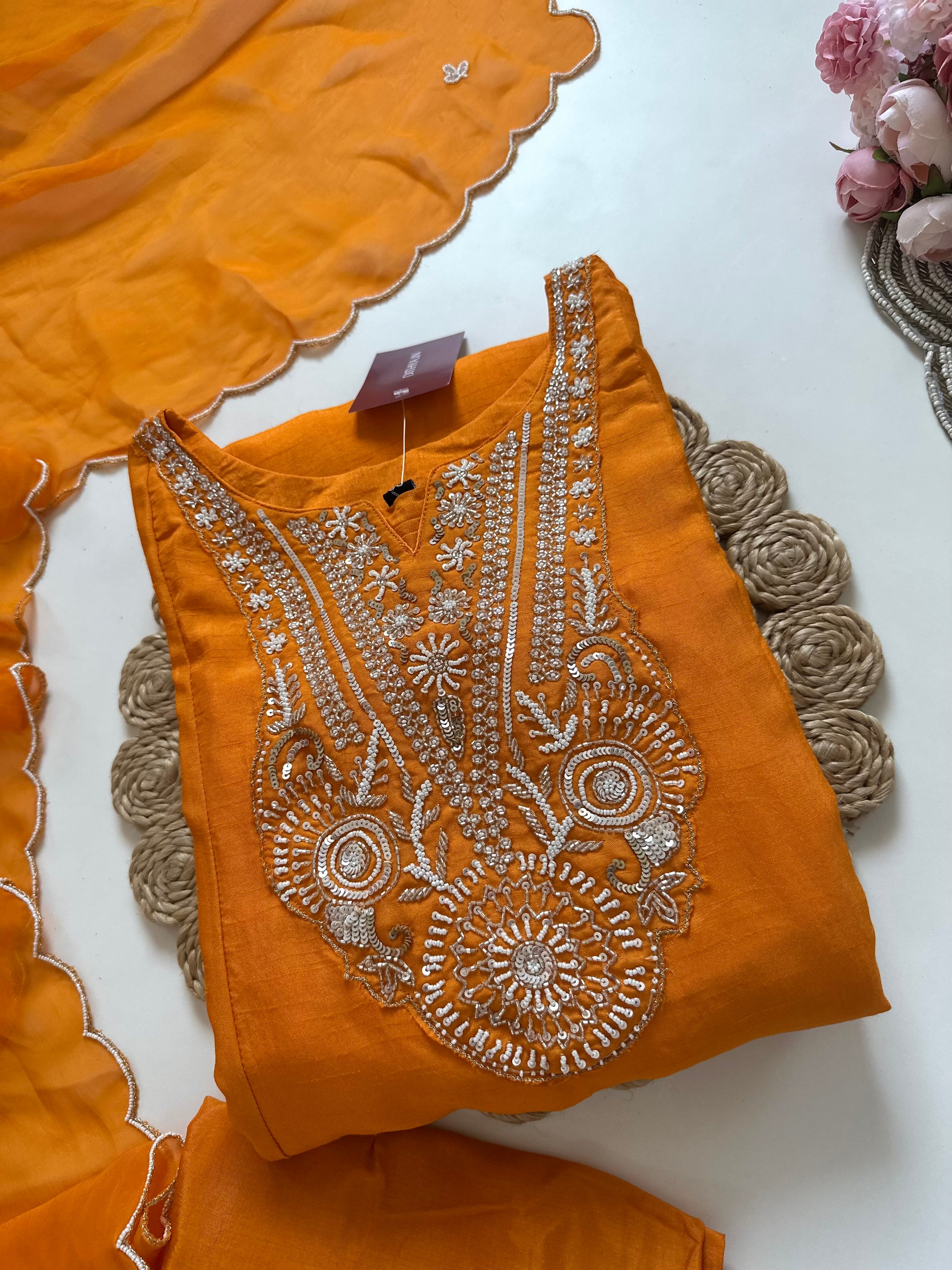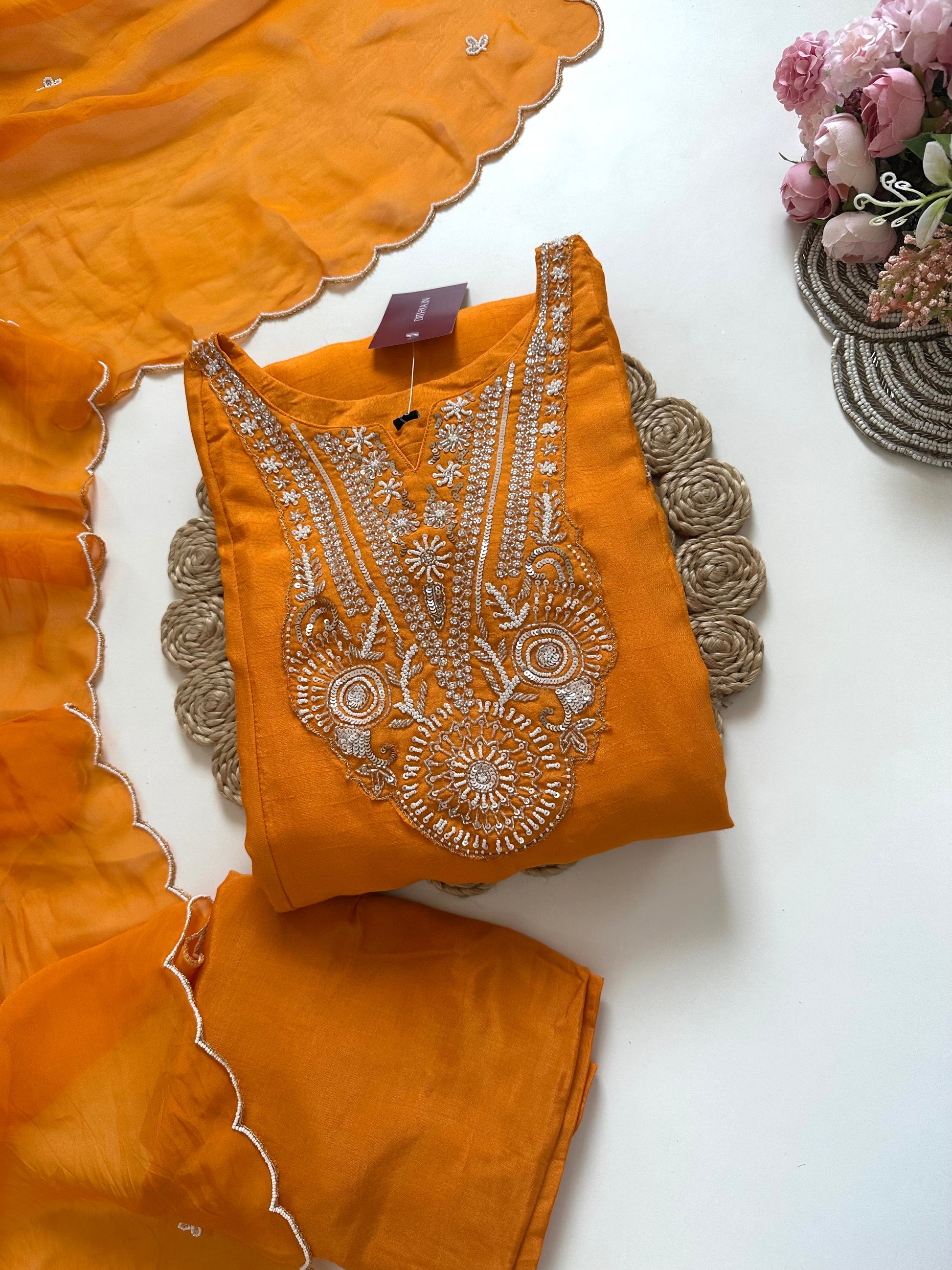Expertly crafted with Russian silk, this handwork Anarkali comes with matching pants and dupatta. The intricate design showcases the quality and attention to detail put into each piece. Elevate your wardrobe with this timeless and luxurious ensemble.