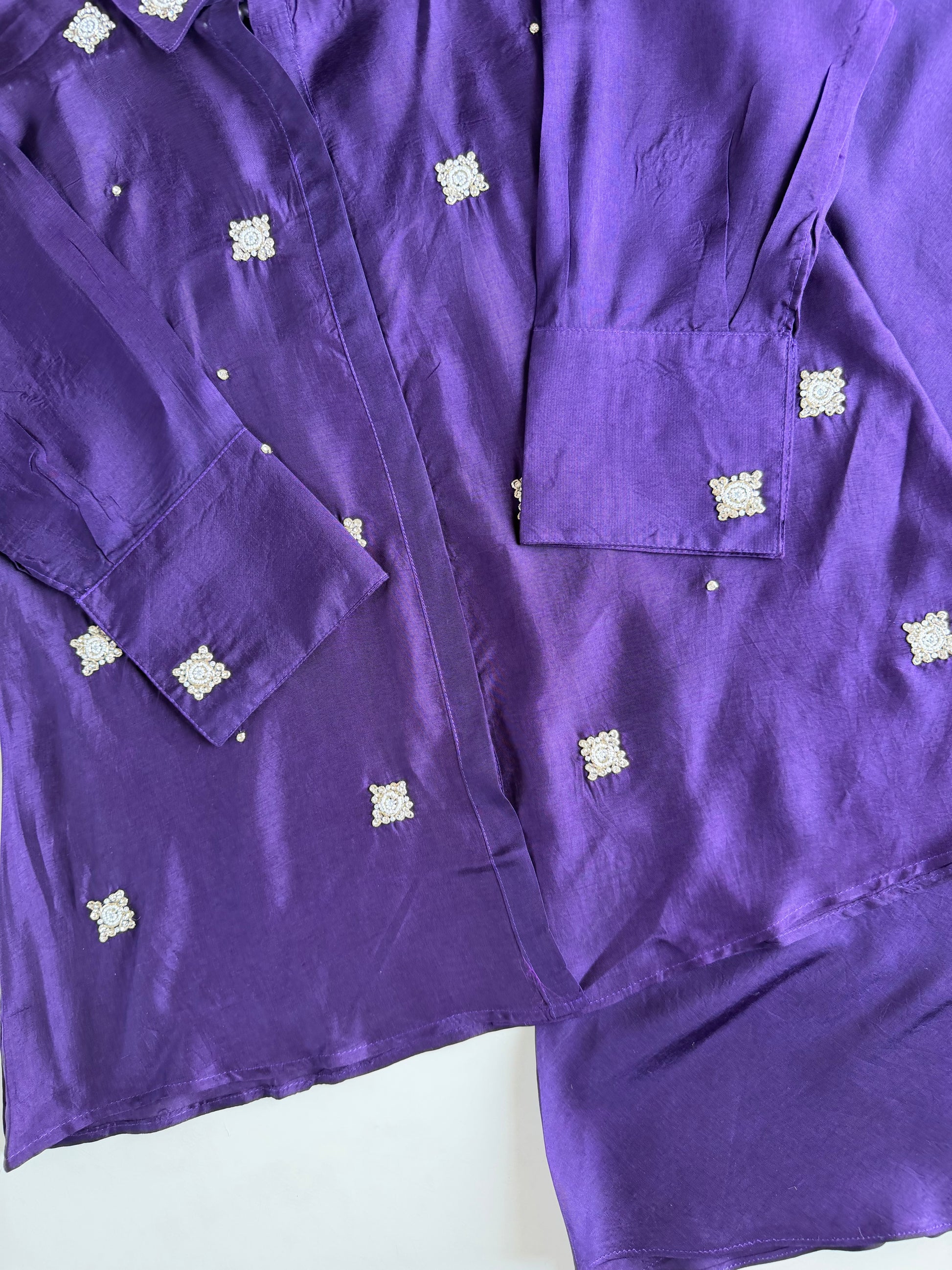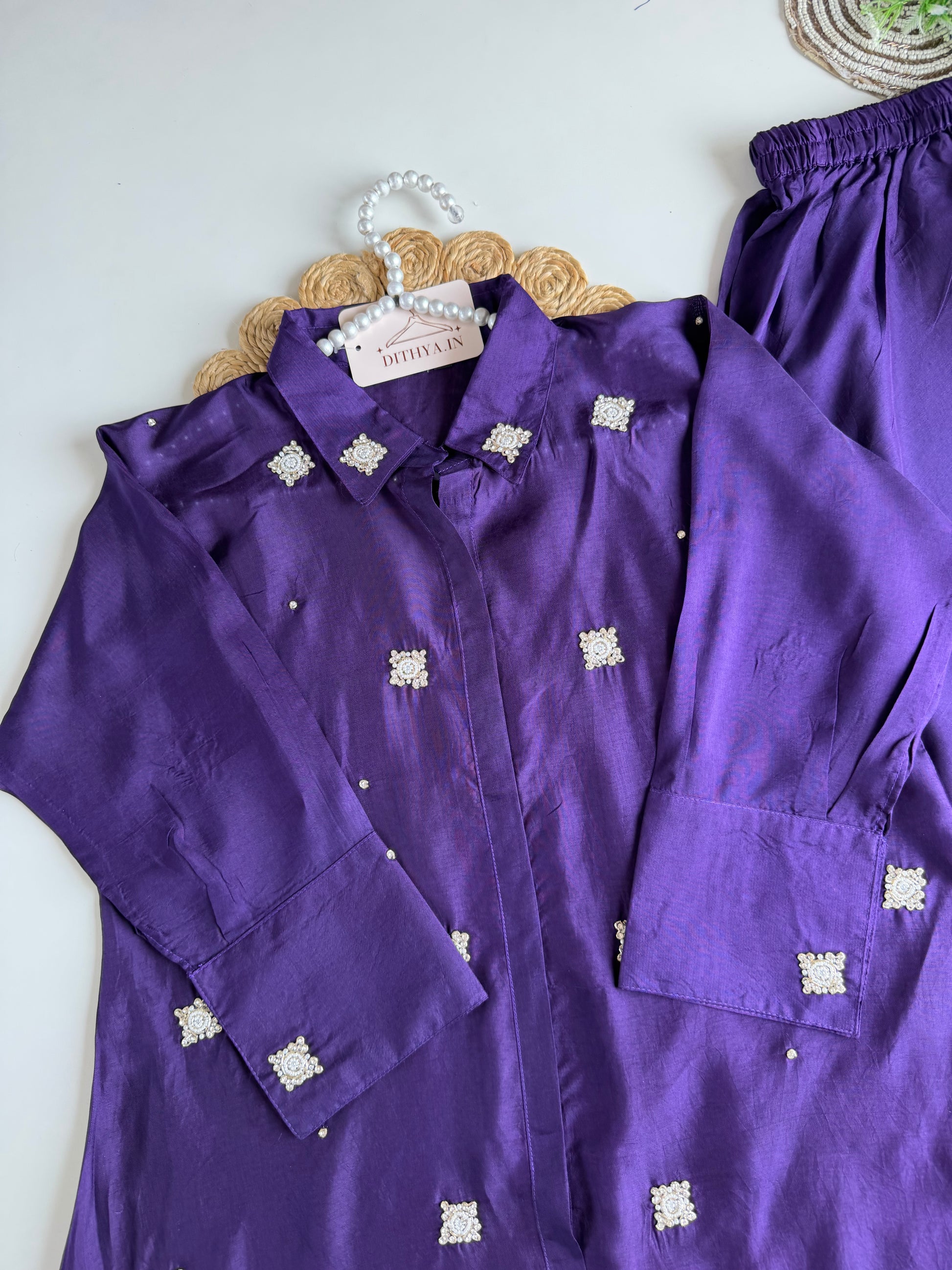 Crafted with exquisite Russian silk and delicate handiwork, this coord set exudes luxury and sophistication. Elevate your wardrobe with this unique and elegant piece, perfect for special occasions or a touch of luxury in your everyday life. Indulge in the high-quality material and expert craftsmanship, making you stand out from the crowd.