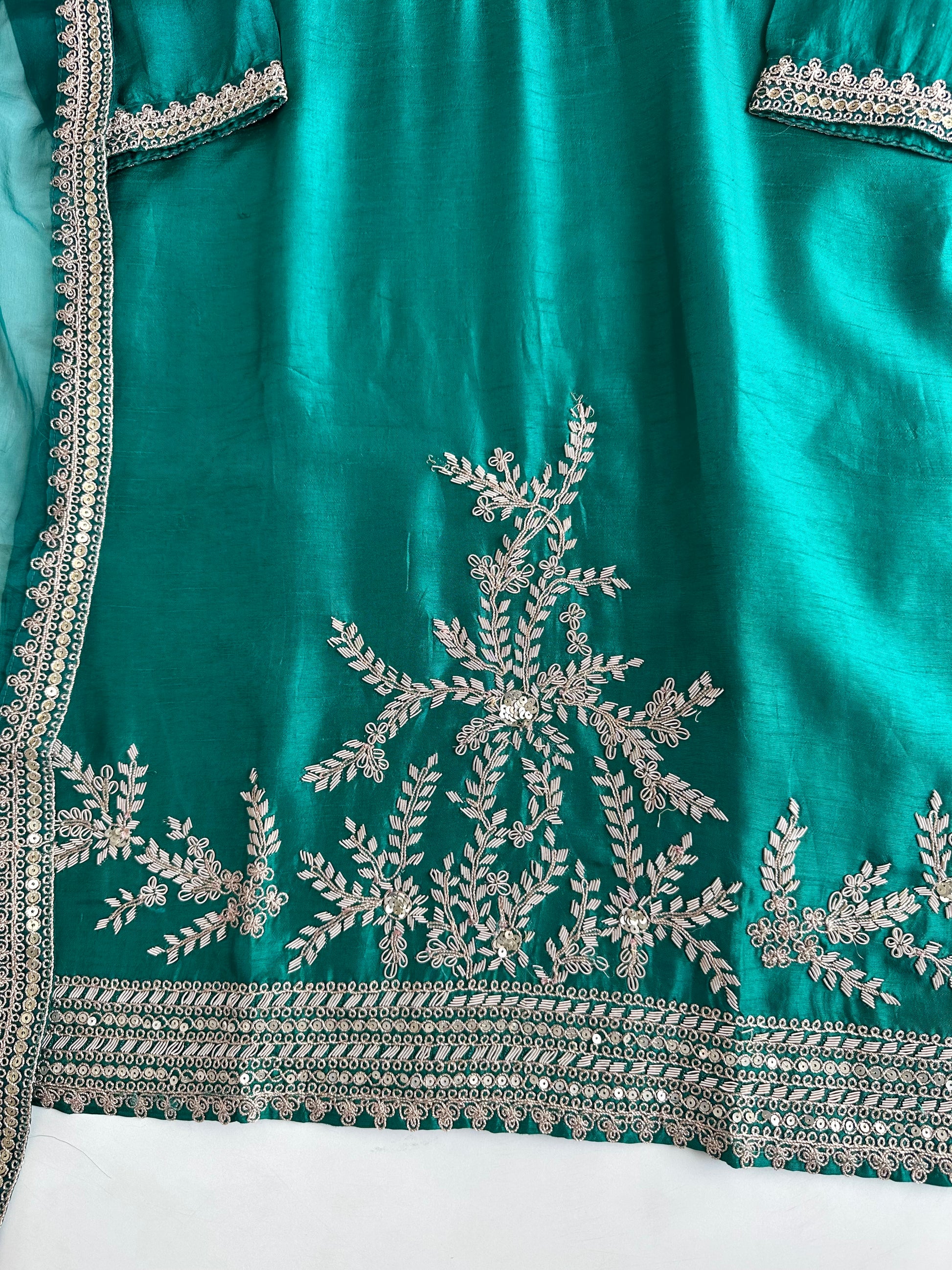 This elegant Kurti set is made from luxurious Russian silk, and features intricate handwork detailing. The set includes a sharara and dupatta, making it a versatile and stylish addition to any wardrobe. Experience the beauty and craftsmanship of traditional Indian wear with this unique piece.