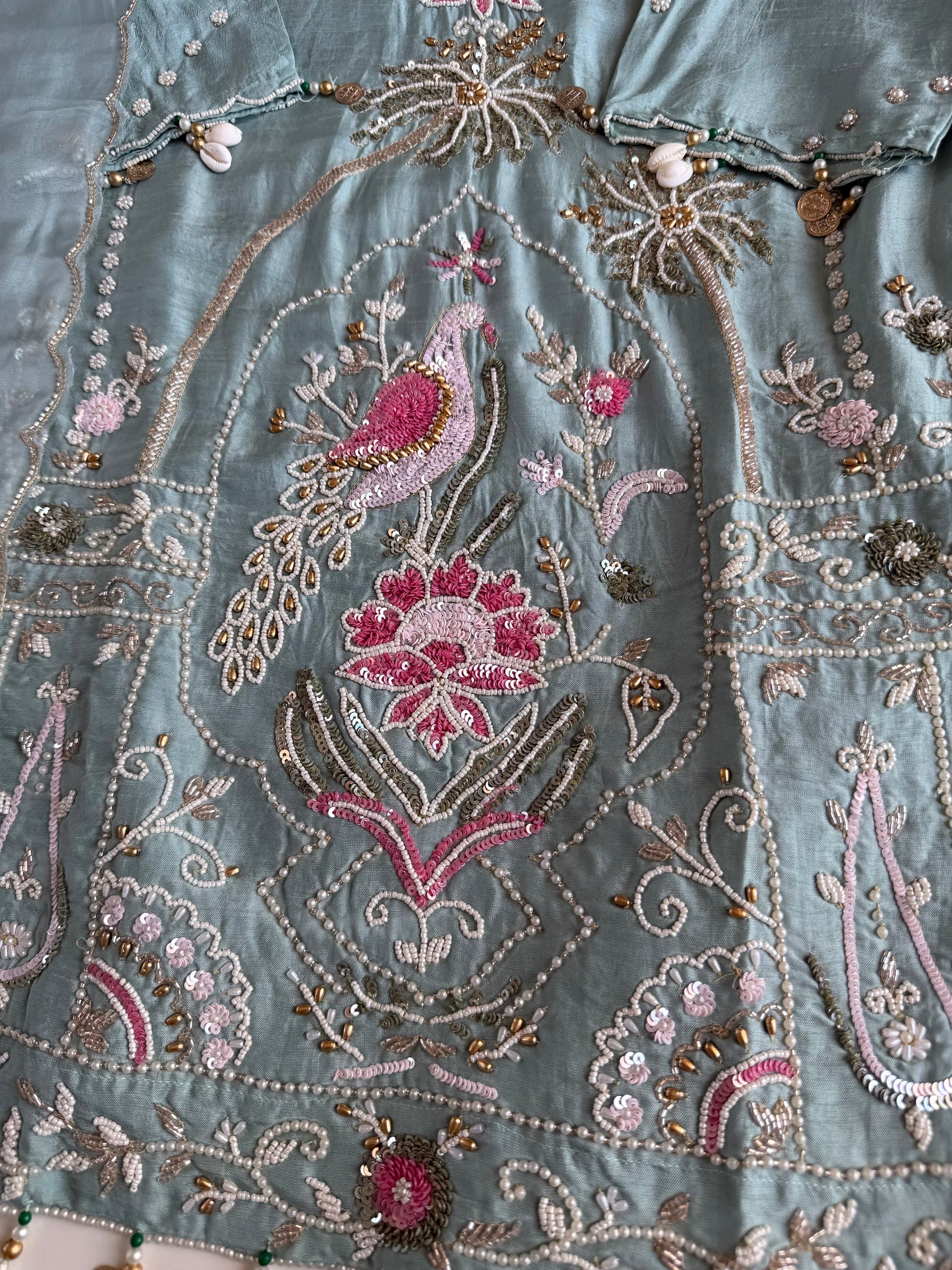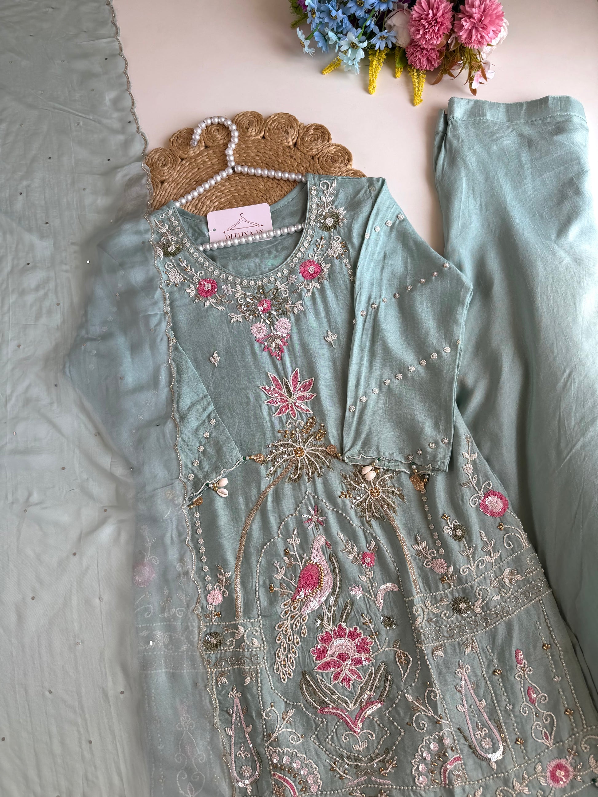 The K333 features a short Kurti crafted from Russian silk, renowned for its softness and sheen. Accompanied by divider pants and a coordinating dupatta, this ensemble offers a sophisticated yet comfortable option suitable for various occasions. The handwork detail enhances its aesthetic appeal, adding a touch of elegance.