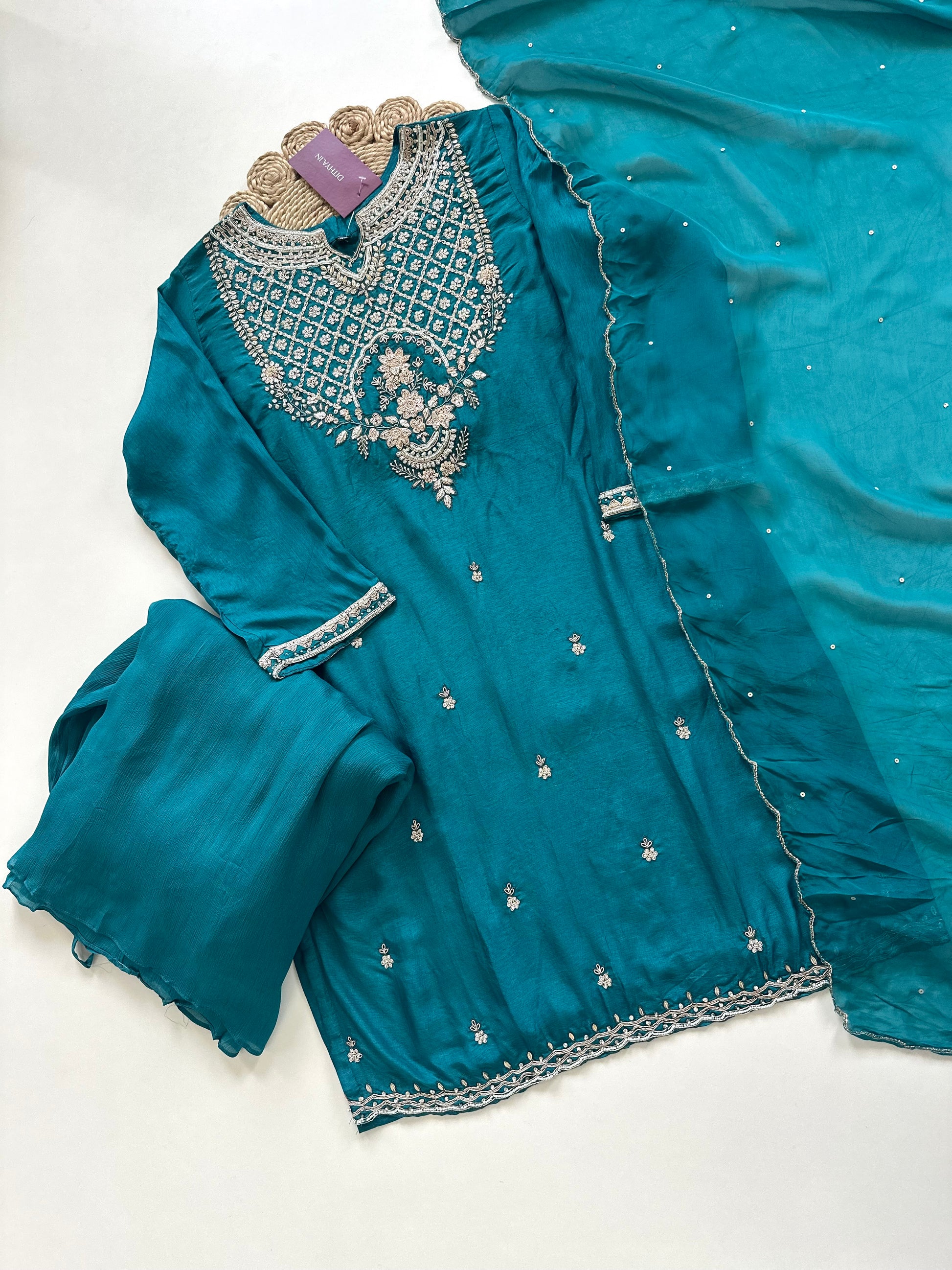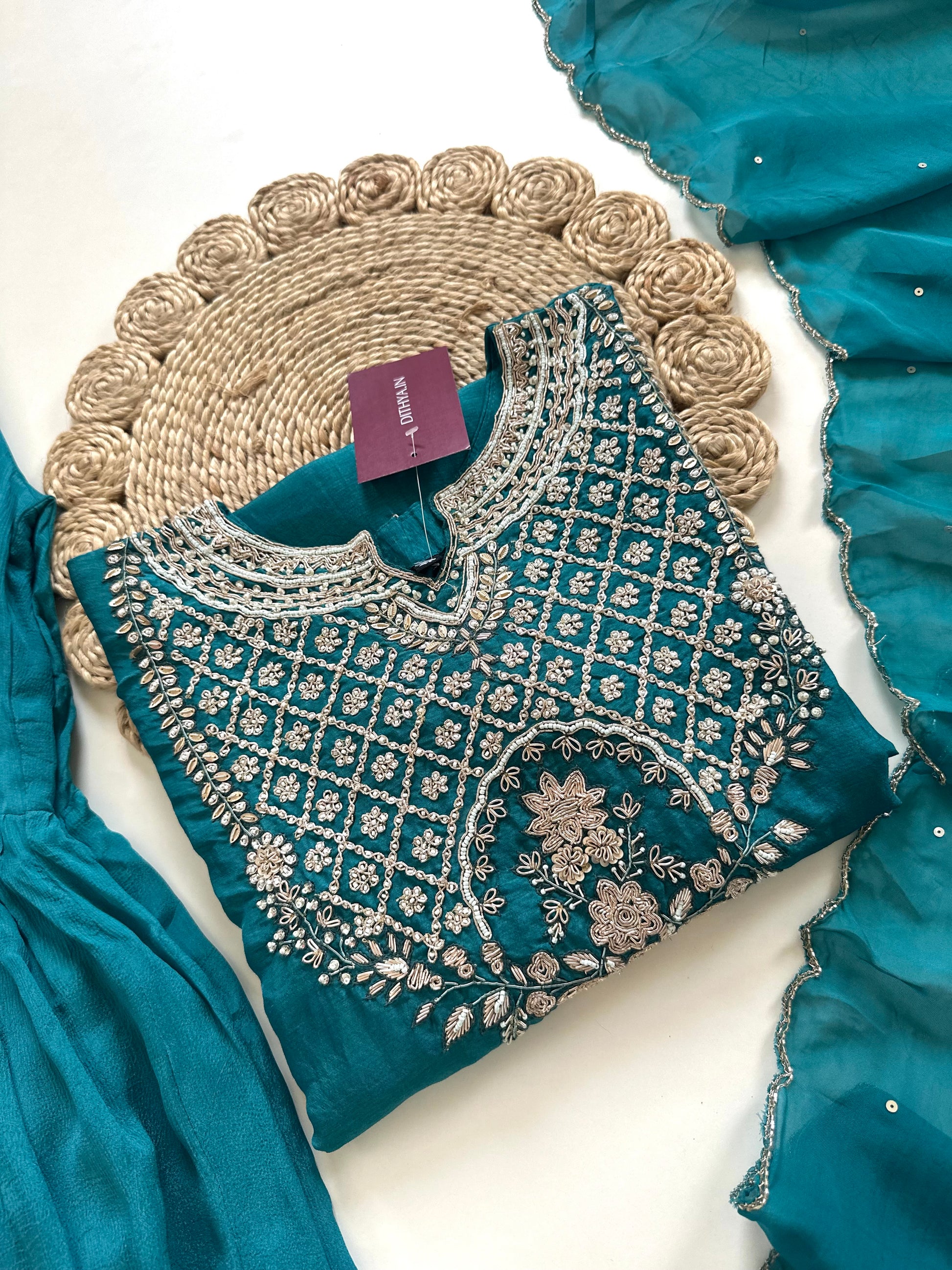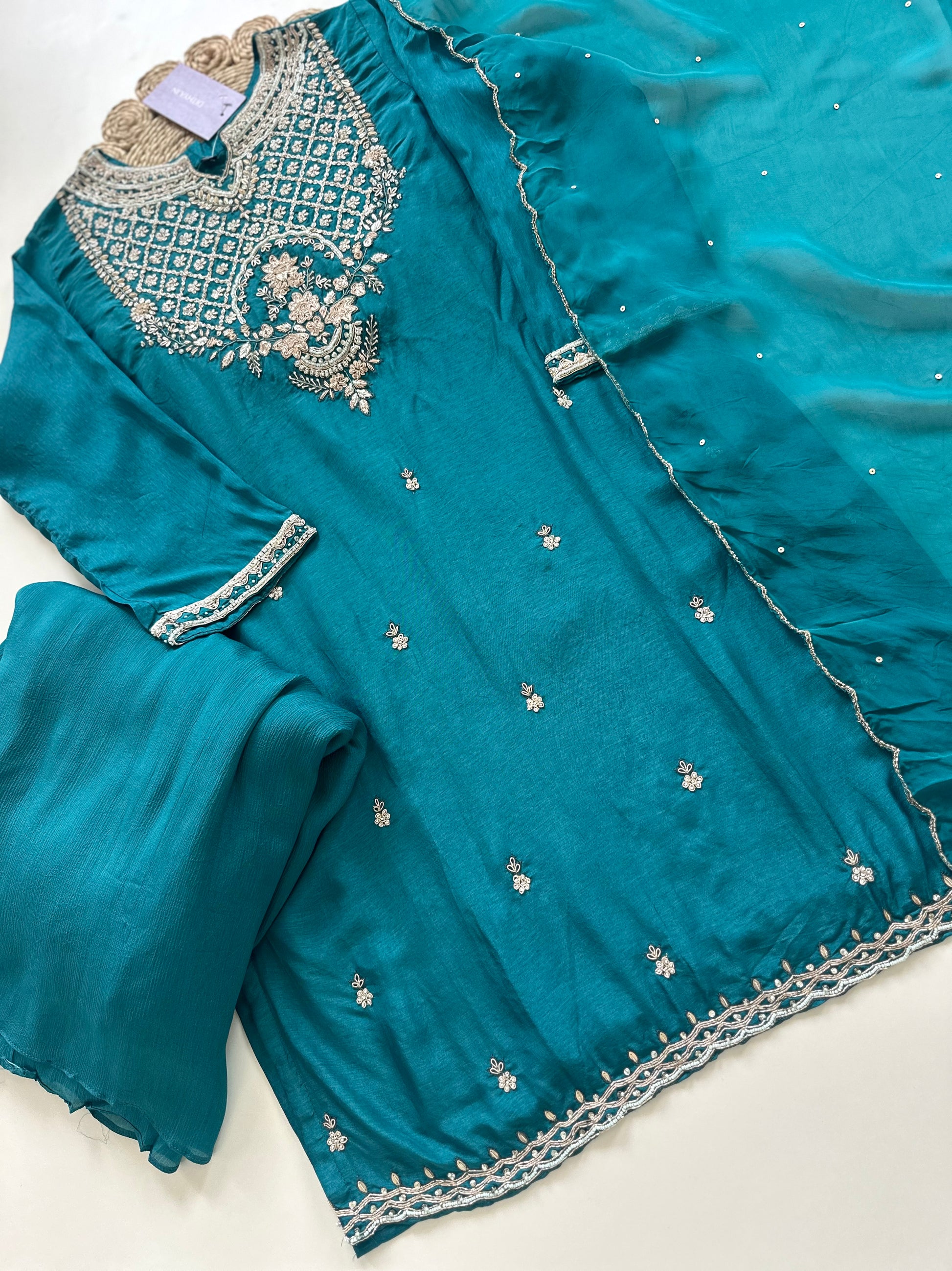 Discover the elegance and artistry of our Russian silk Handwork Short kurti with sharara and dupatta. Made from luxurious Russian silk, this handcrafted attire features intricate details that add a touch of traditional charm. Perfect for any occasion, elevate your style with this exquisite outfit.