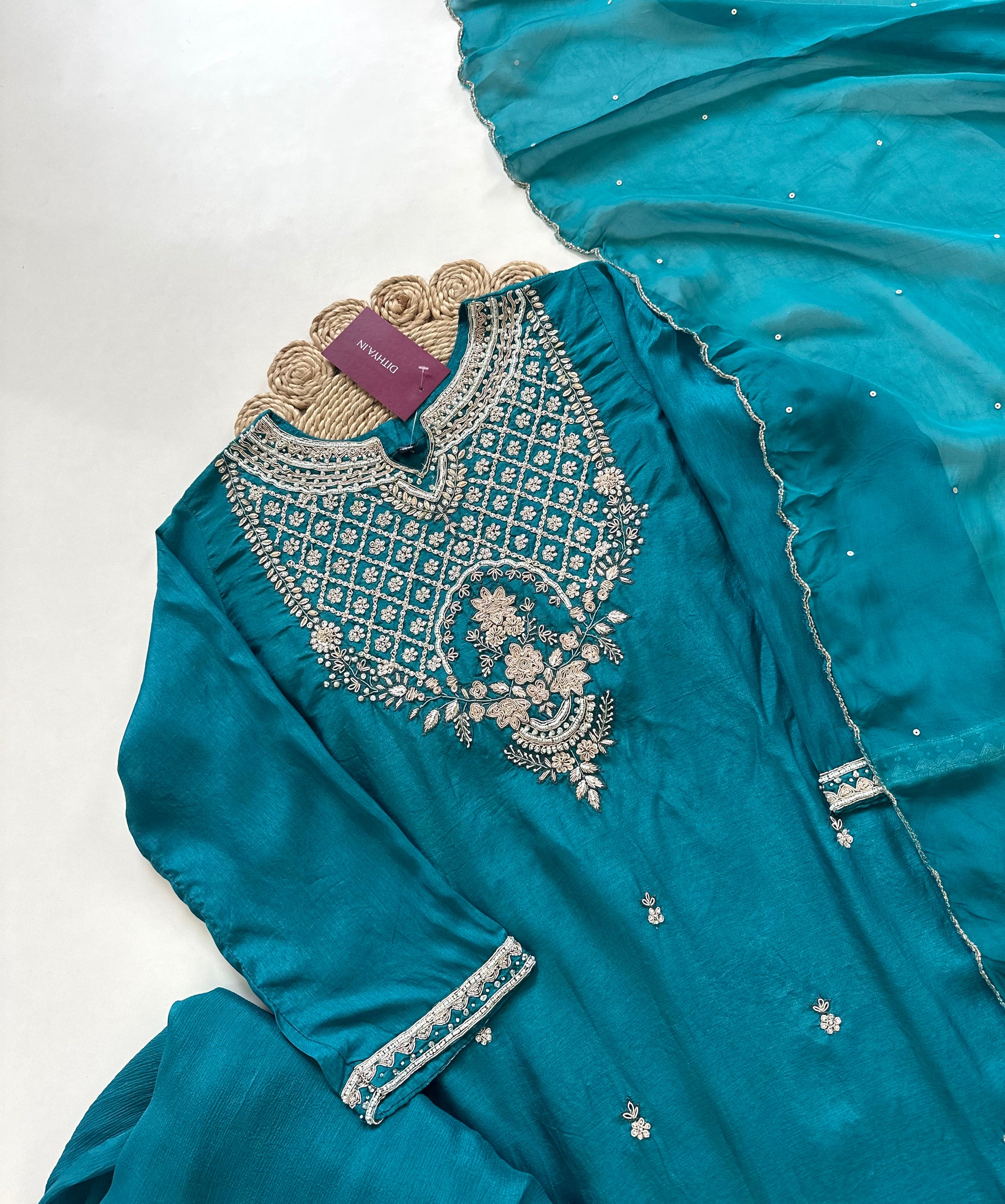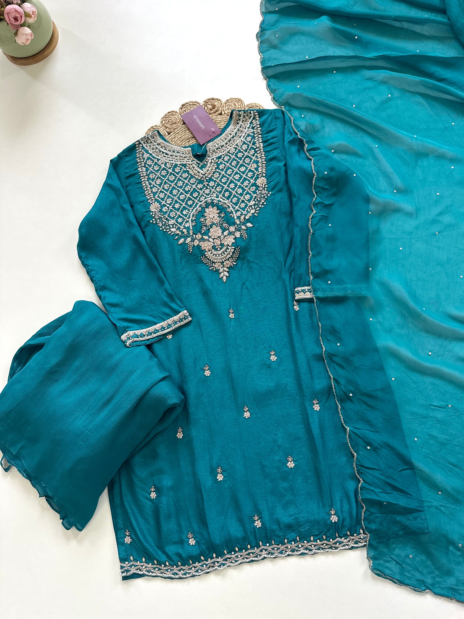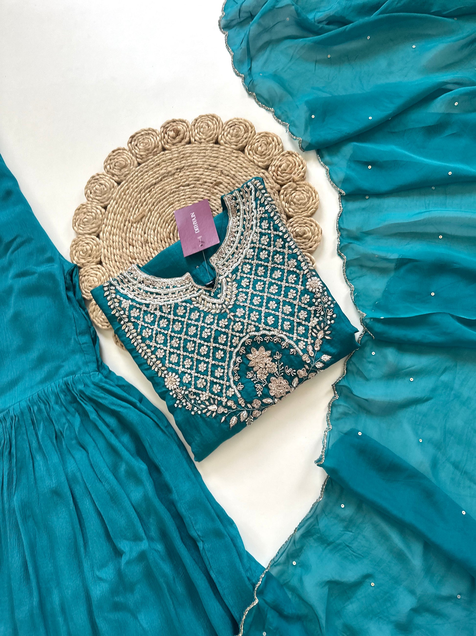 Discover the elegance and artistry of our Russian silk Handwork Short kurti with sharara and dupatta. Made from luxurious Russian silk, this handcrafted attire features intricate details that add a touch of traditional charm. Perfect for any occasion, elevate your style with this exquisite outfit.