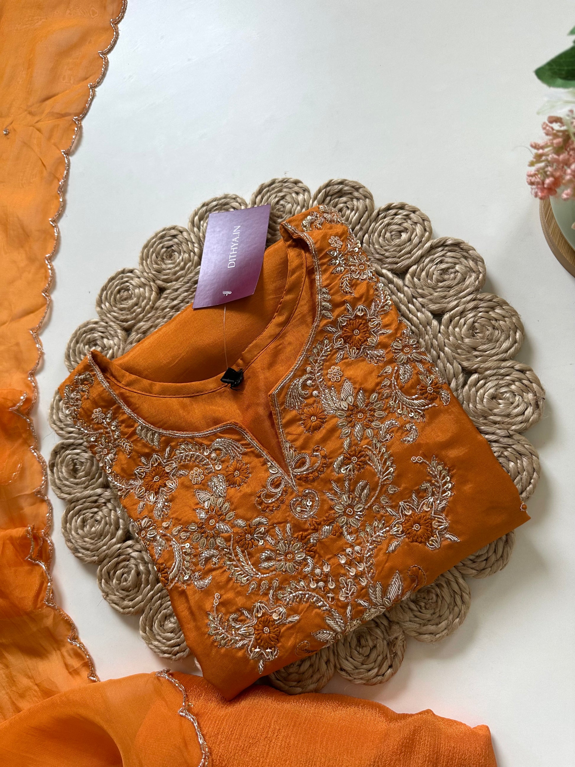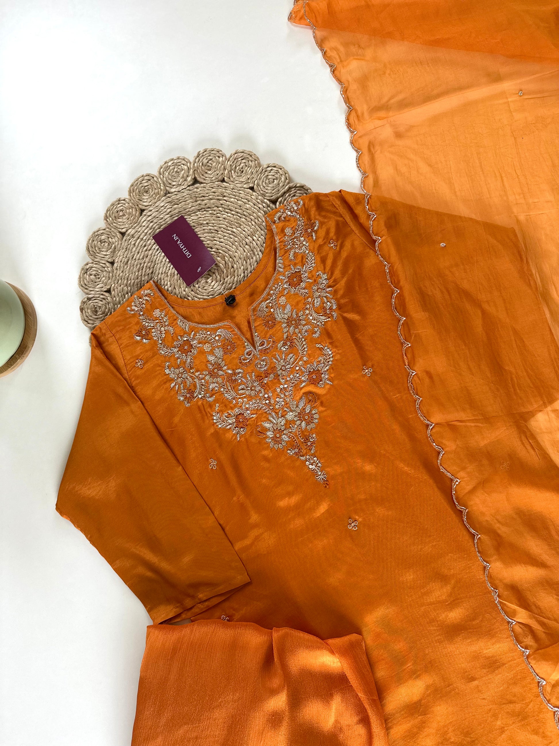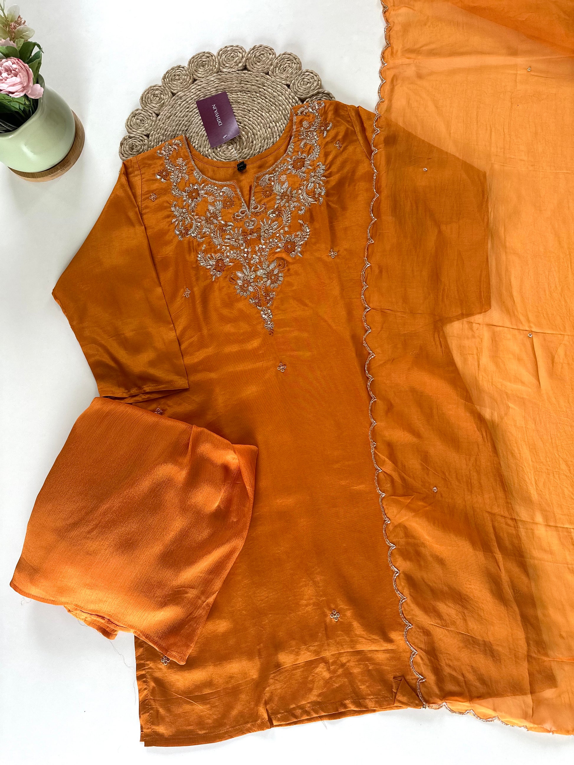 Expertly crafted with Russian silk, this short kurti features intricate handwork details. Paired with a flowing sharara and elegant dupatta, this set offers a touch of luxury and sophistication to any occasion. Experience the beauty and artisanal quality of this unique ensemble.
