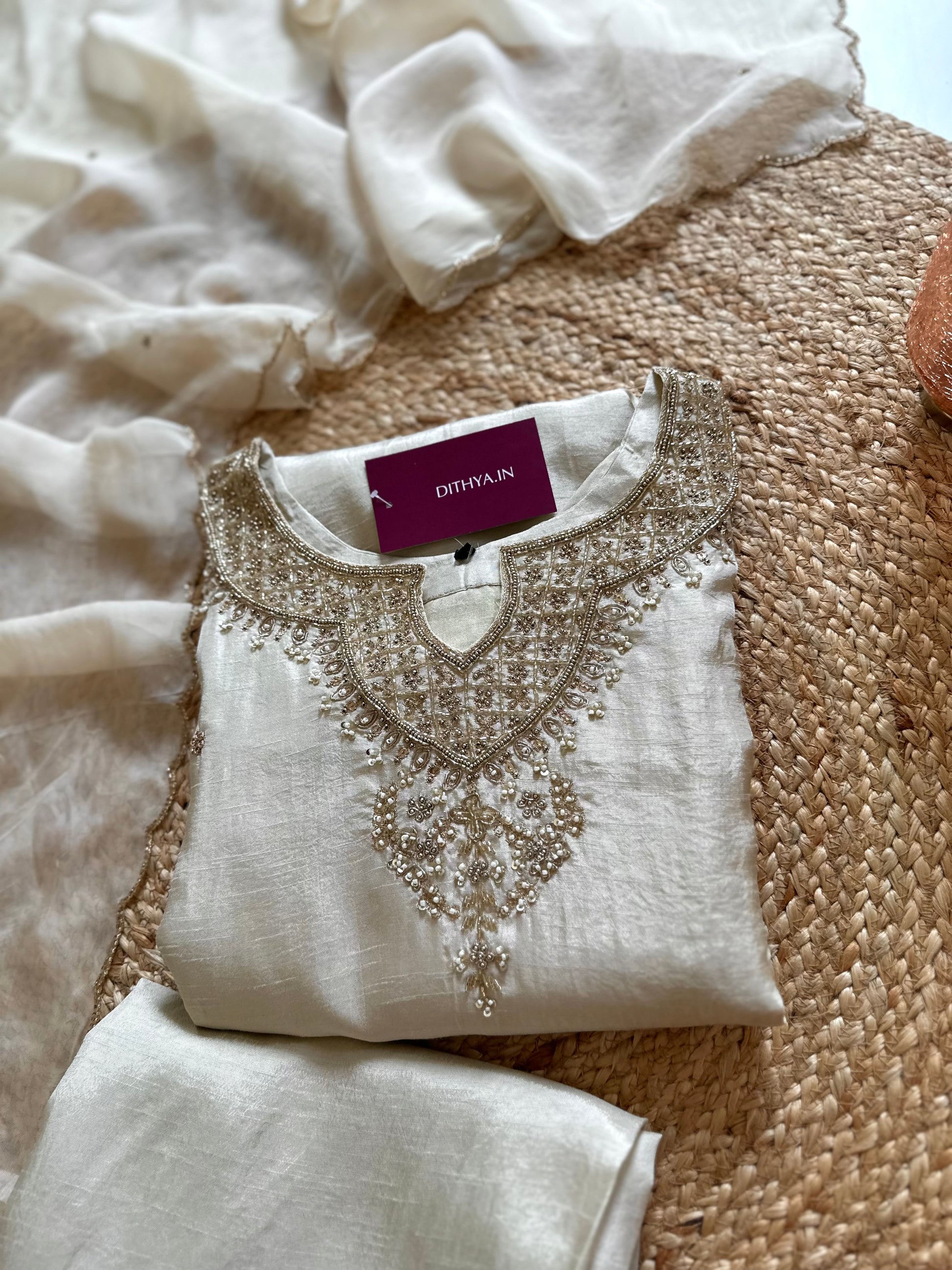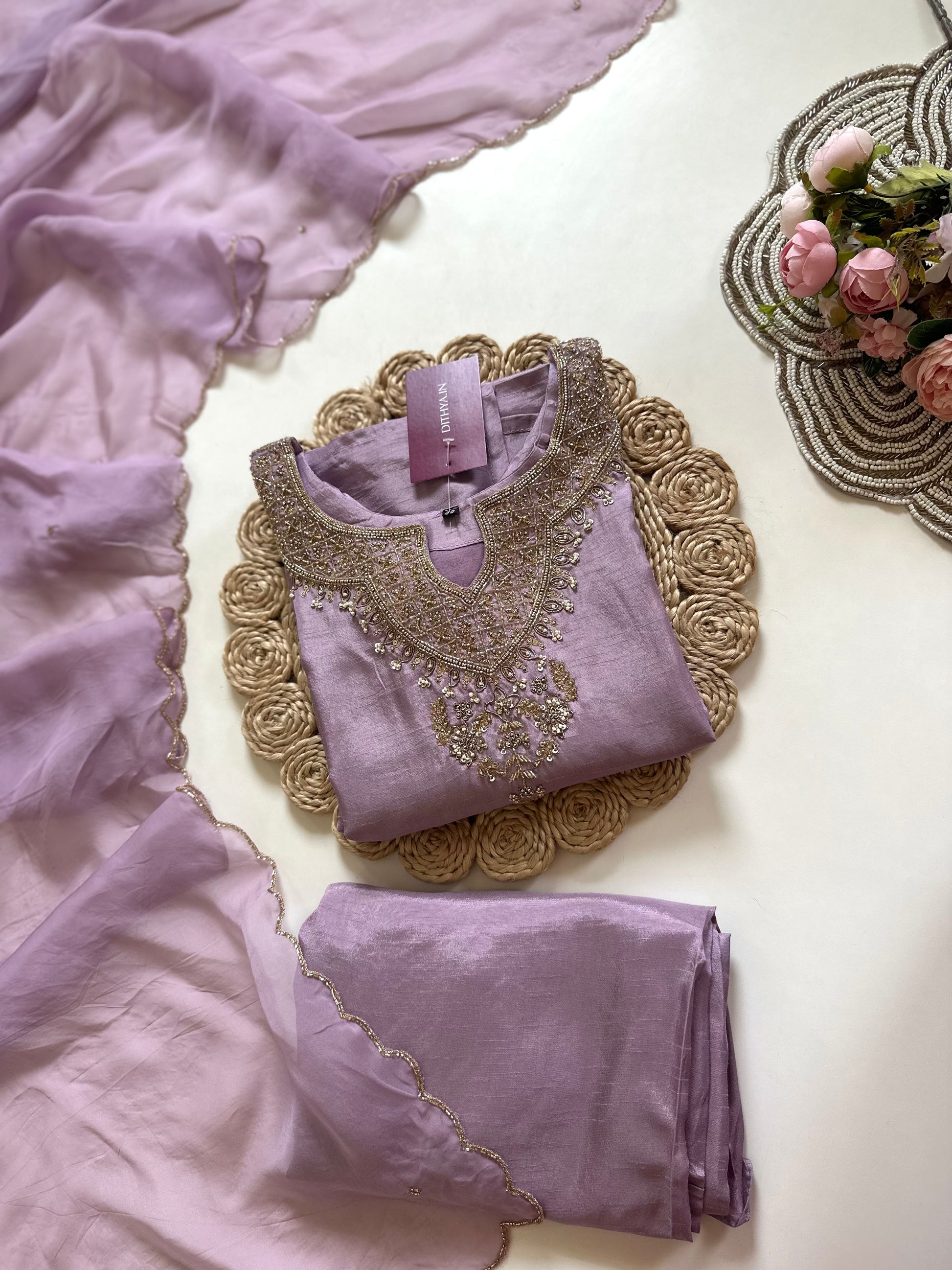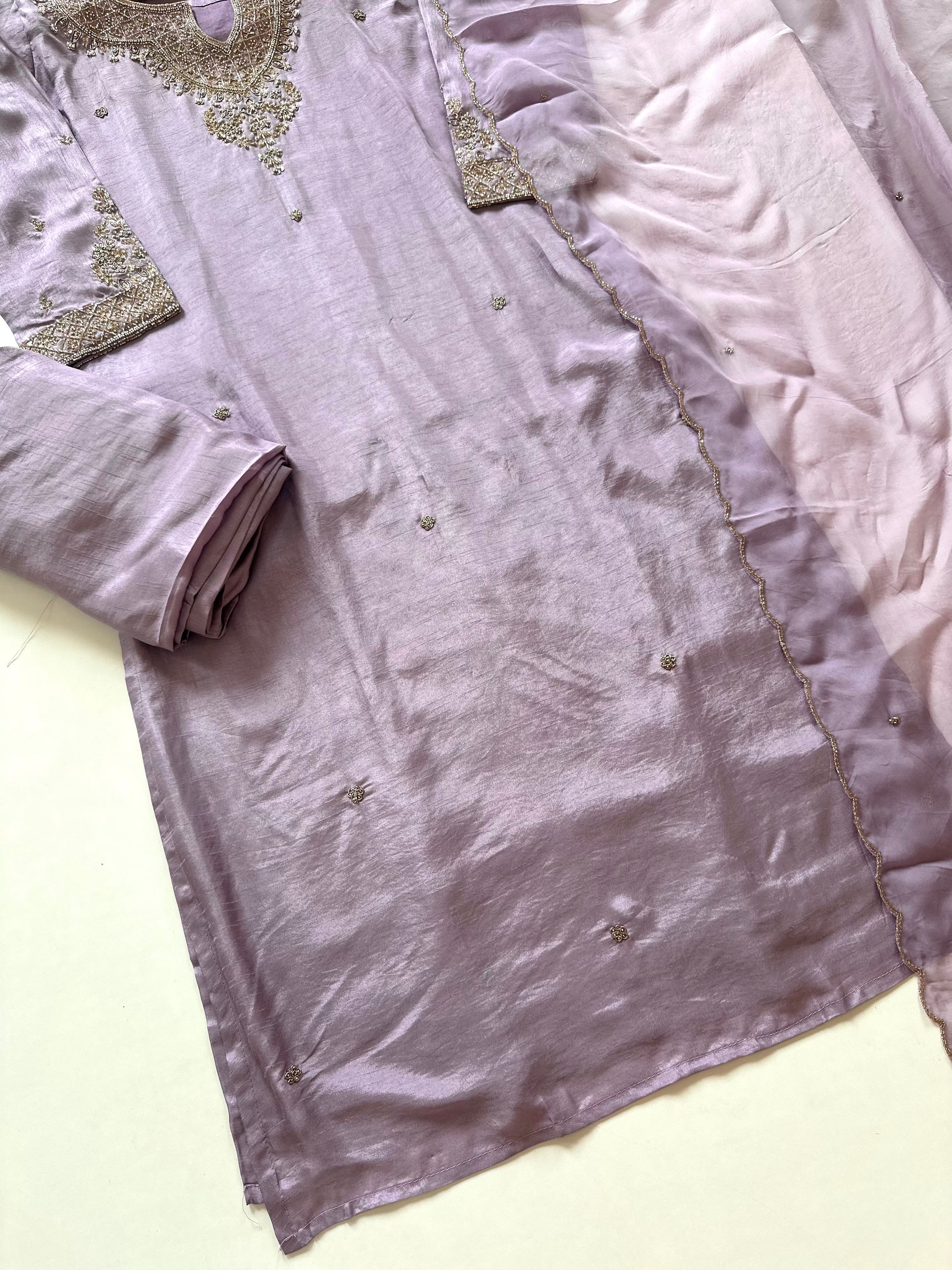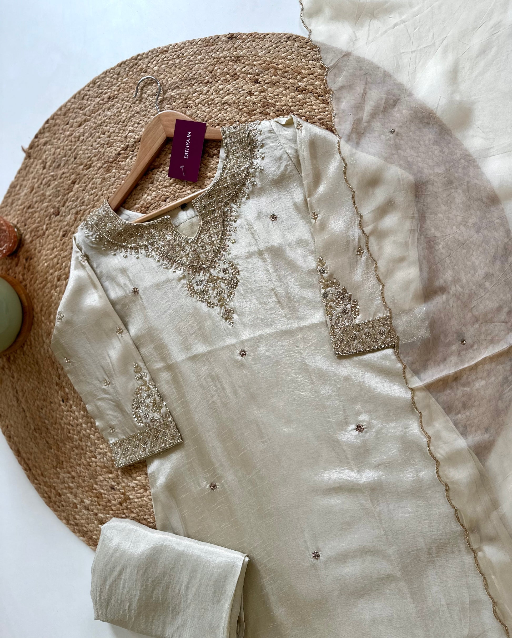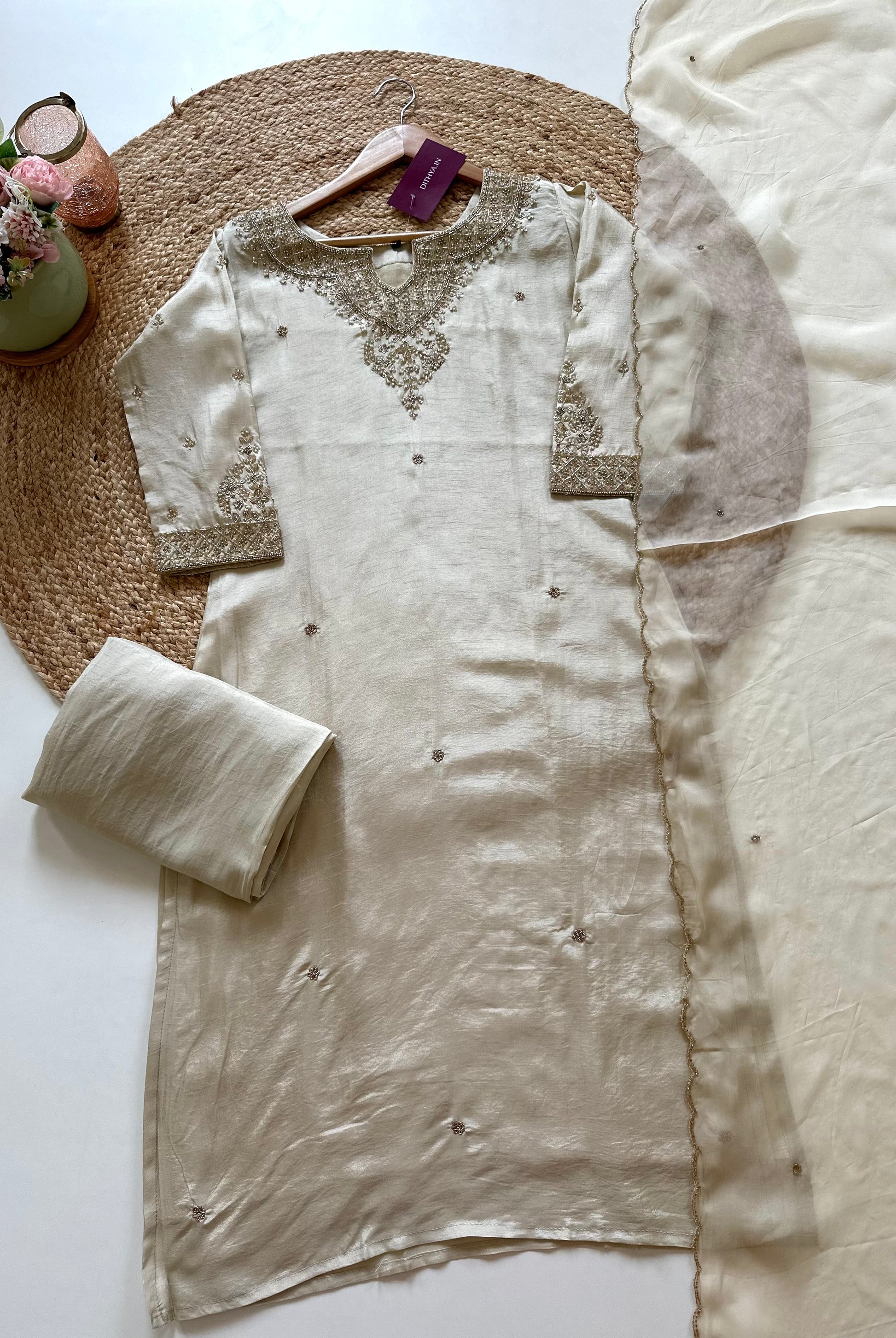 Expertly crafted from Dola silk and adorned with intricate handiwork, this straight kurti comes with a matching palazzo and dupatta. Feel luxurious and elegant with this versatile ensemble, perfect for any occasion.