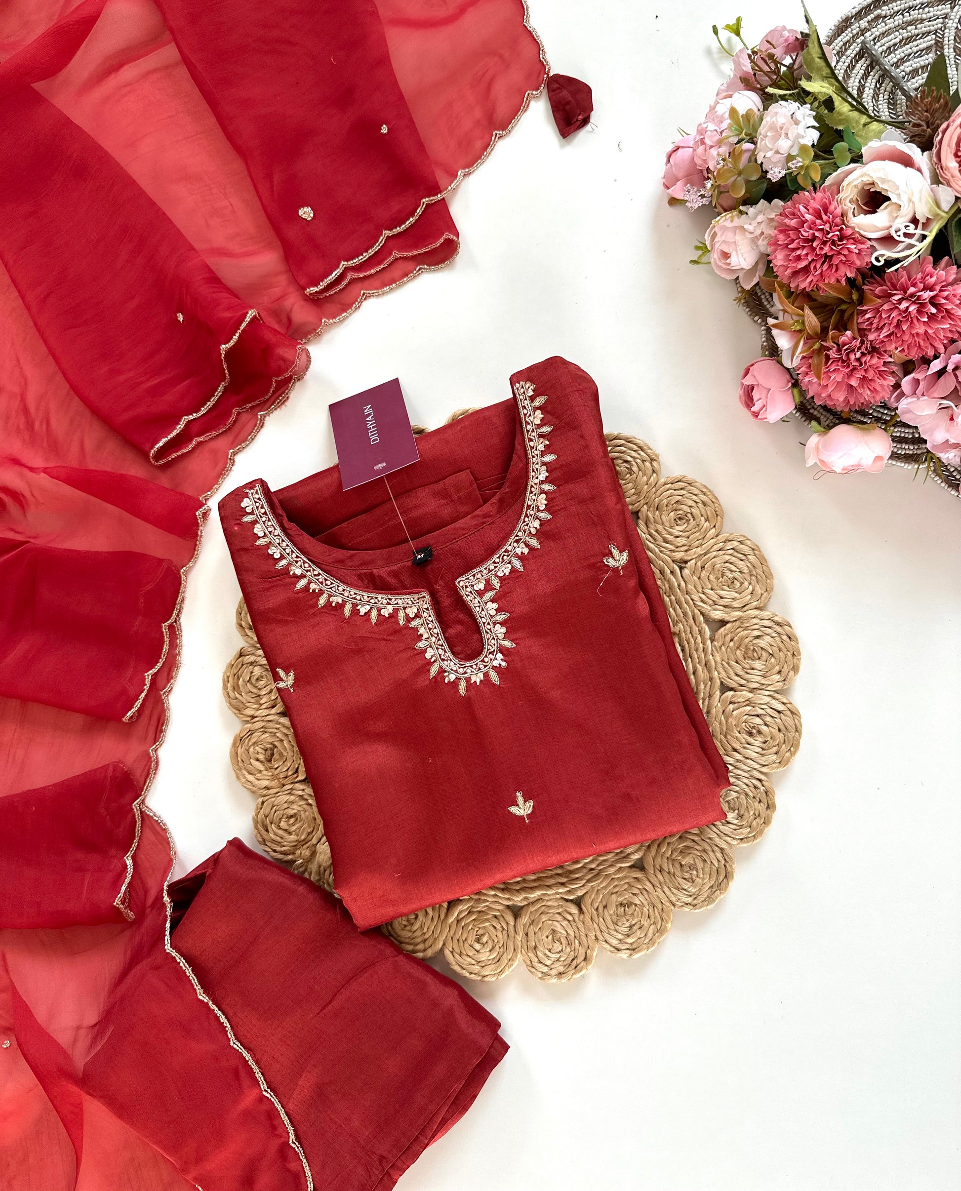 K324 - Russian silk handwork straight Kurti with pants and dupatta