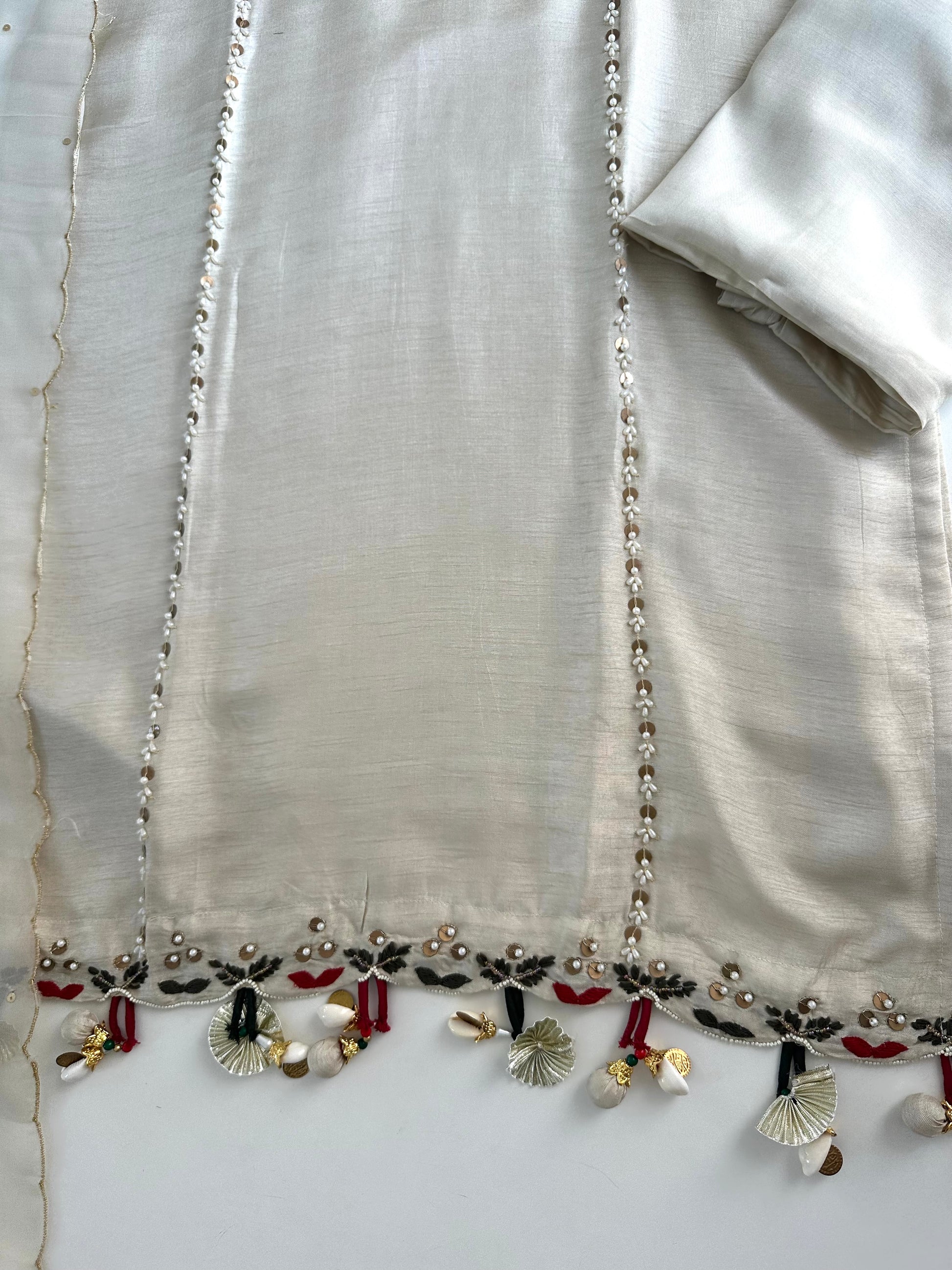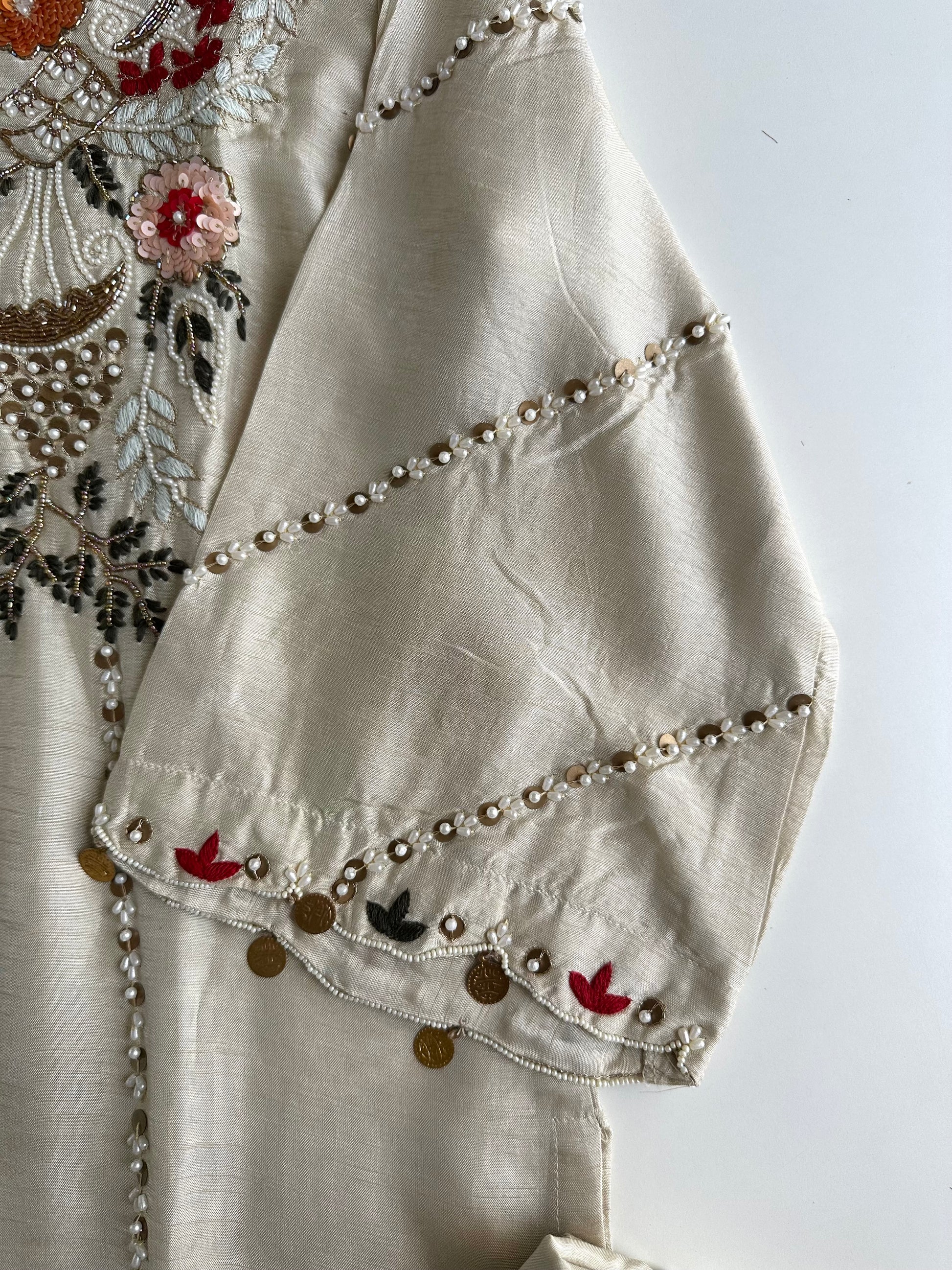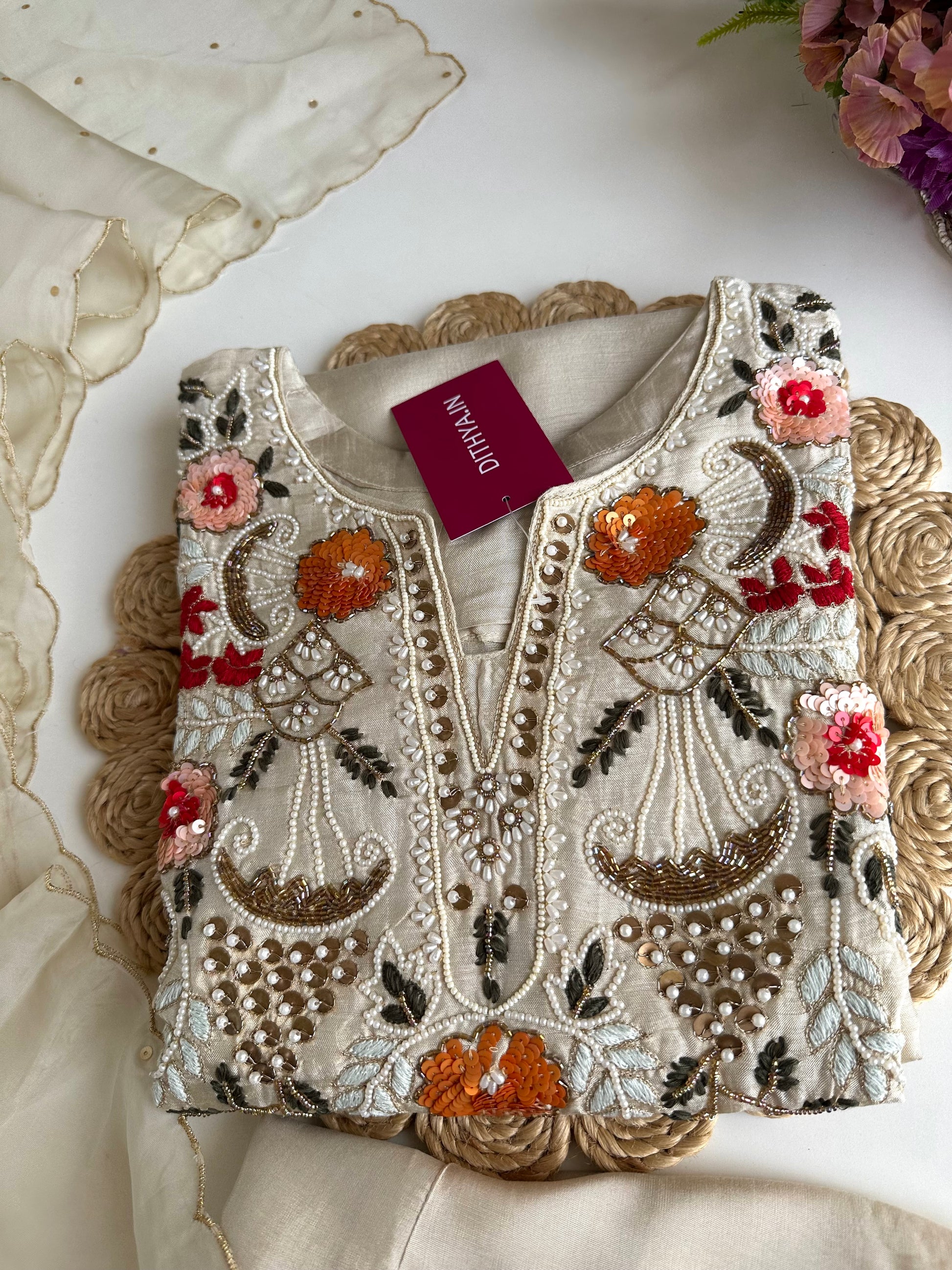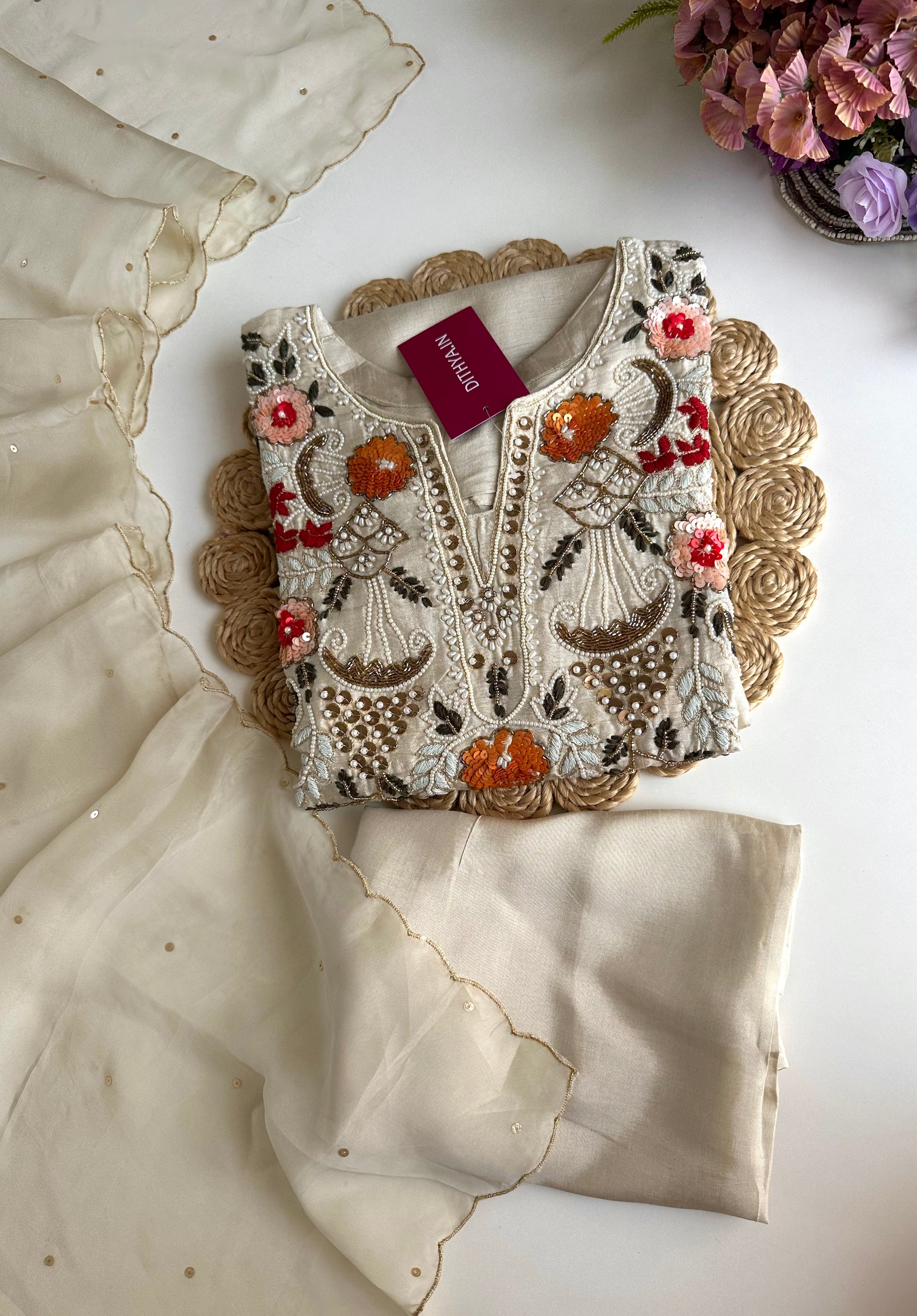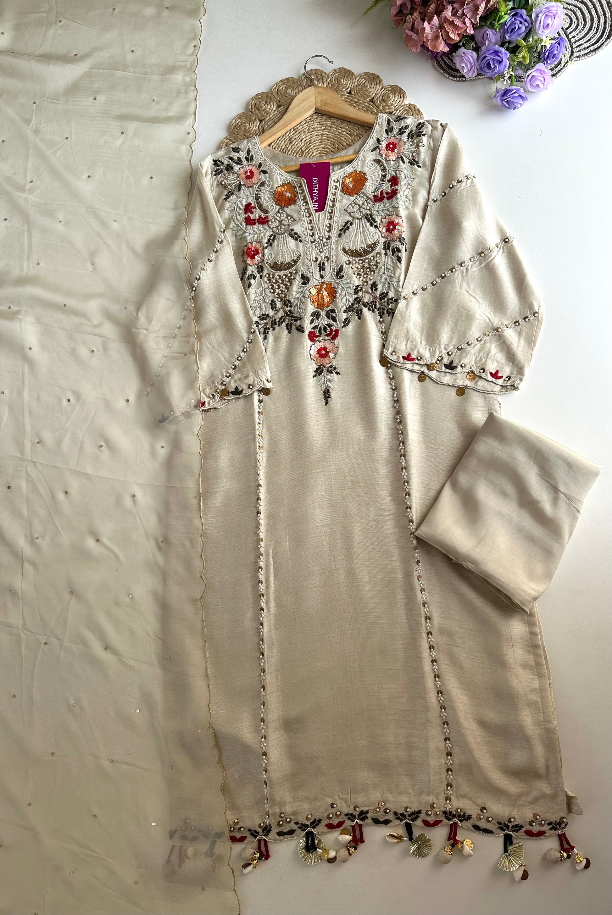 Expertly crafted with luxurious Russian silk, this handwork straight Kurti comes with matching pants and a dupatta for a complete and elegant look. The intricate detailing of the silk adds a touch of sophistication, making it perfect for any occasion. Elevate your wardrobe with this stunning piece.