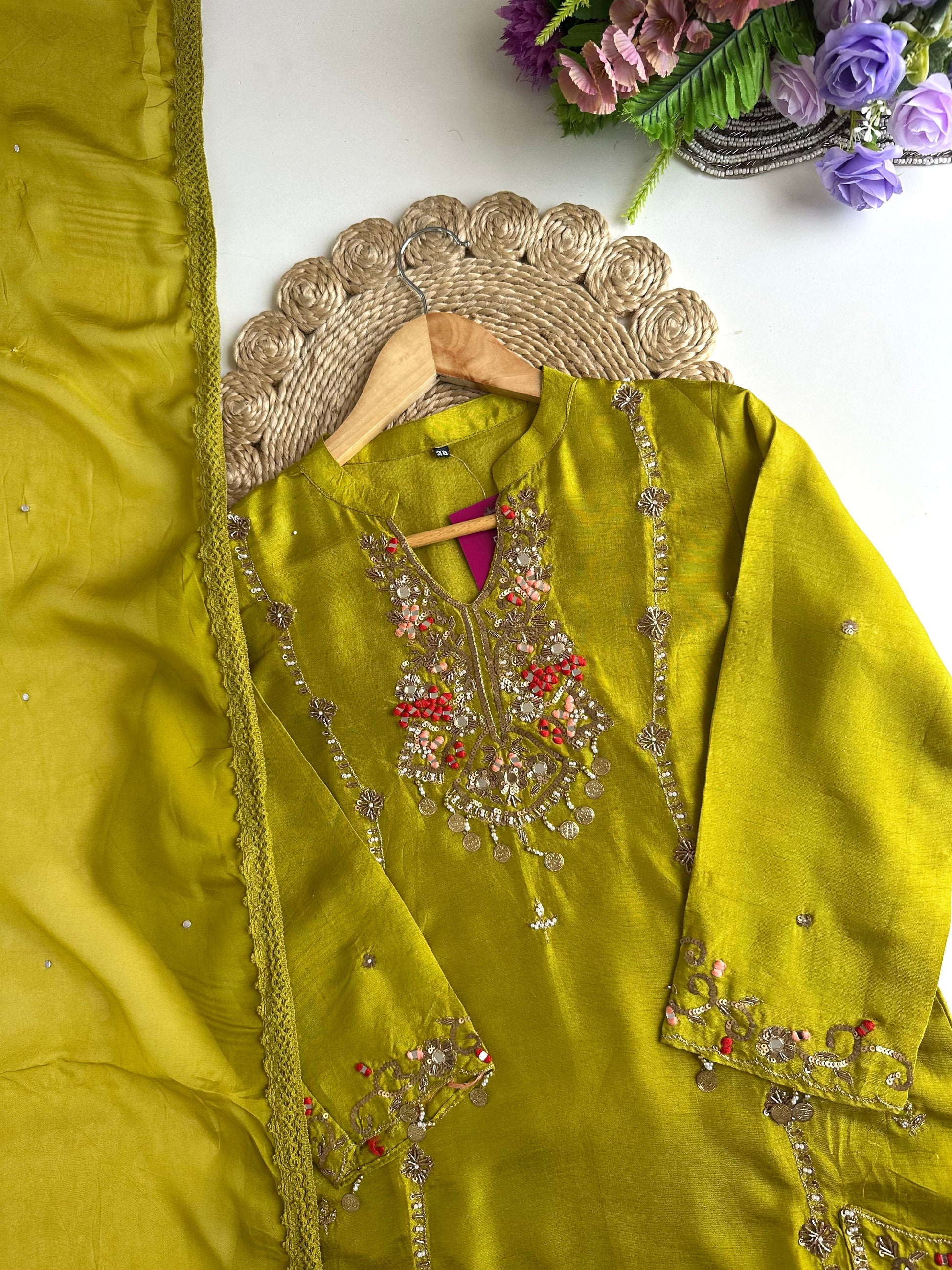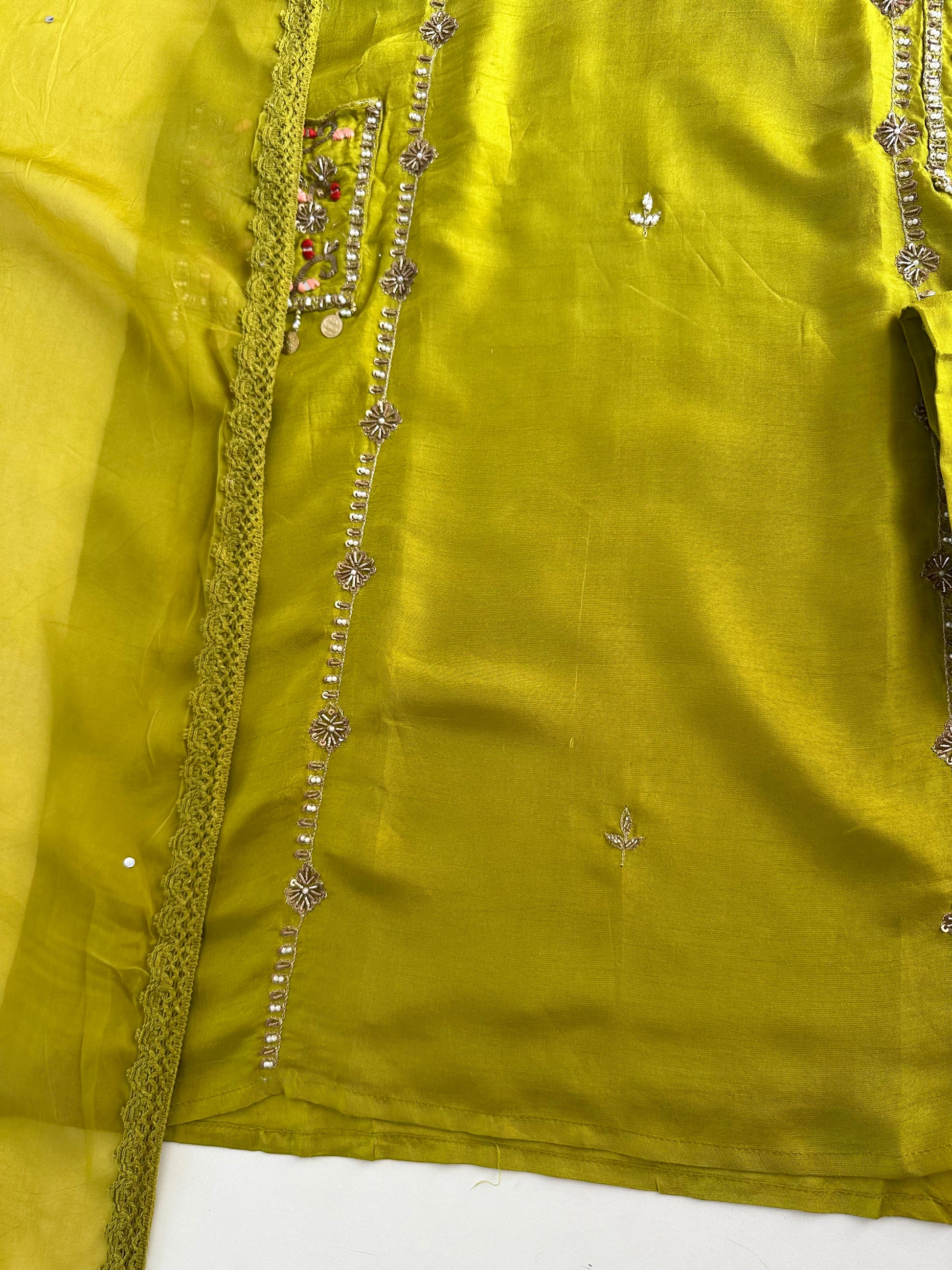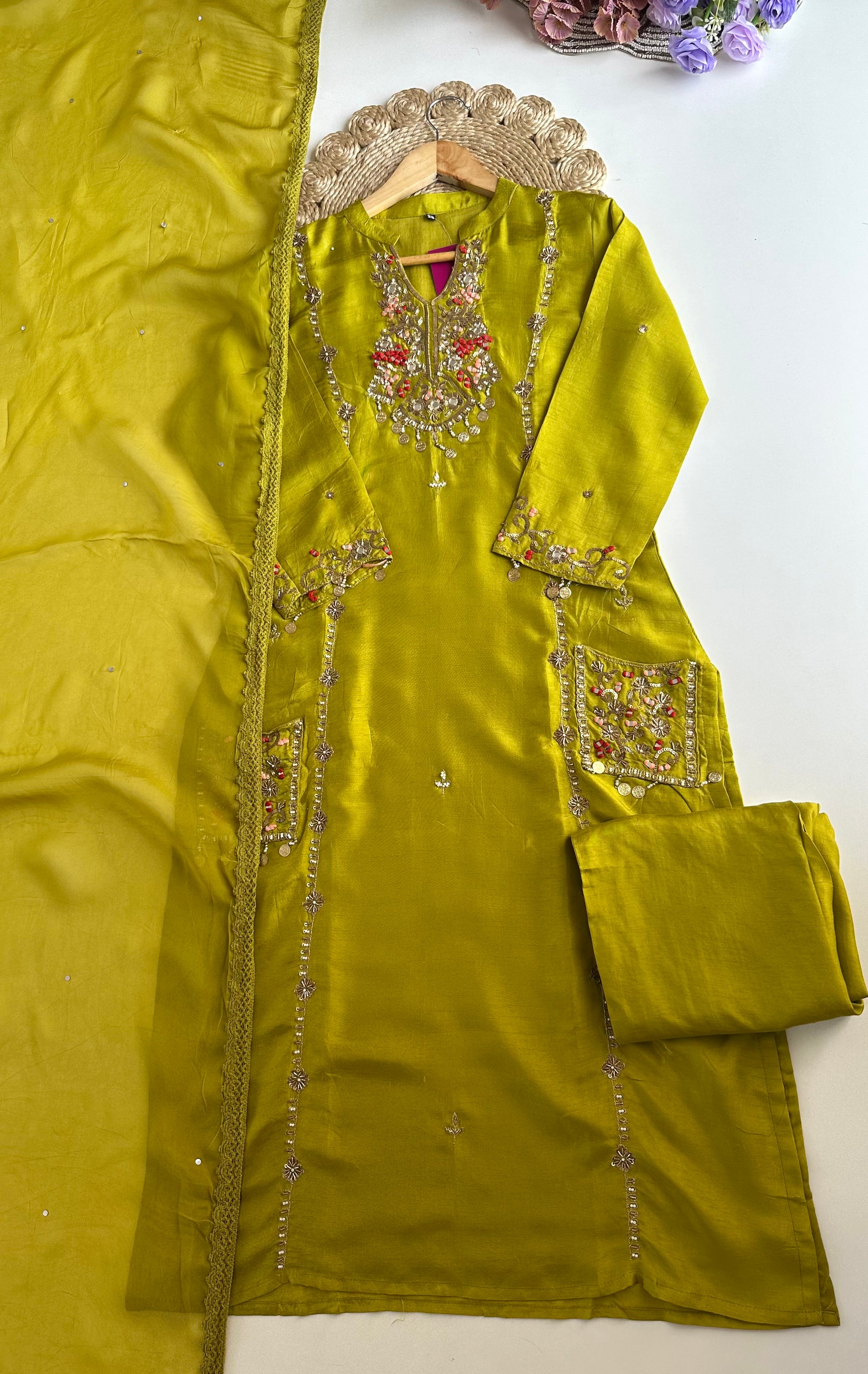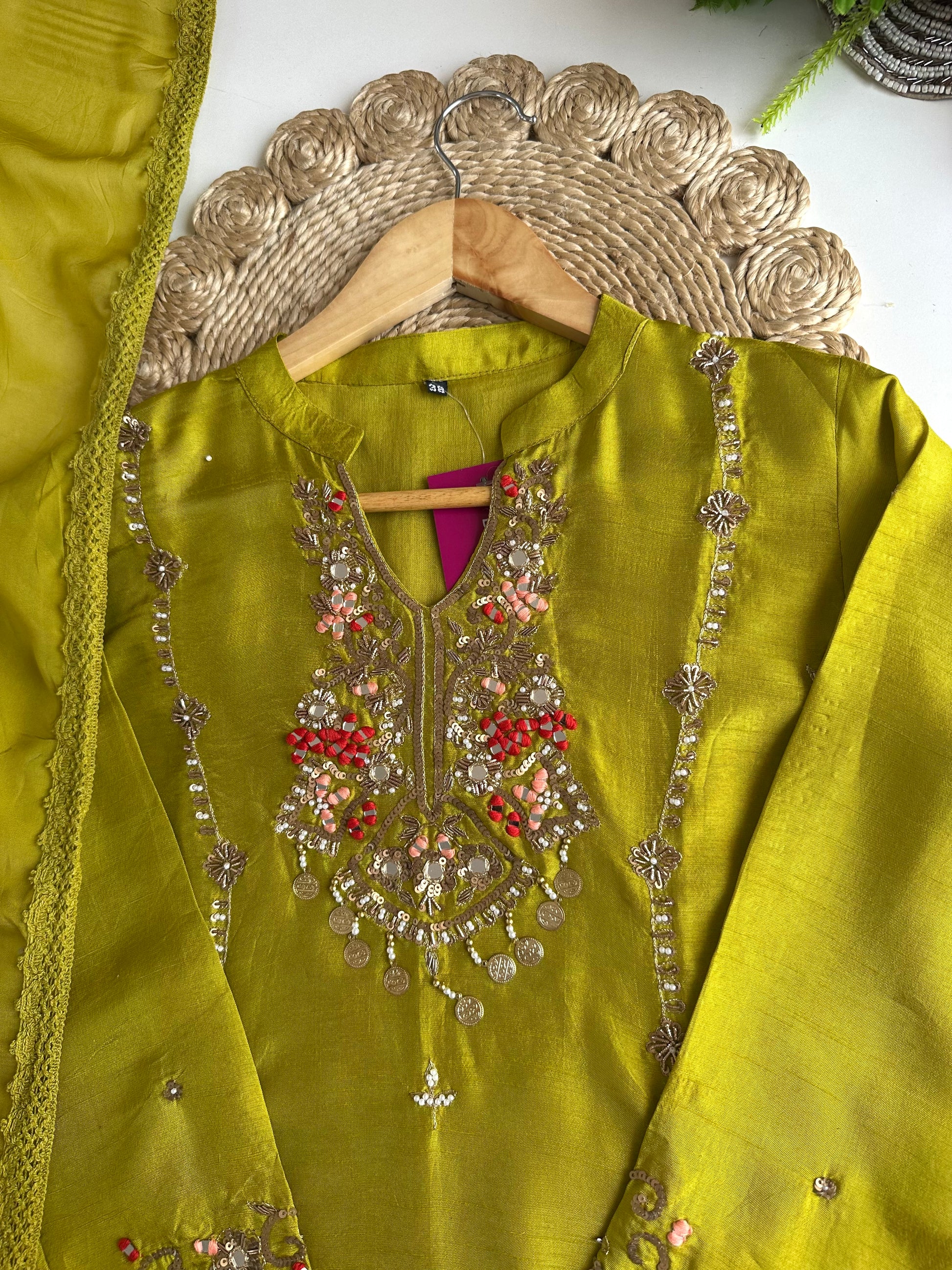 K146 - Russian silk handwork straight Kurti with pants and dupatta
