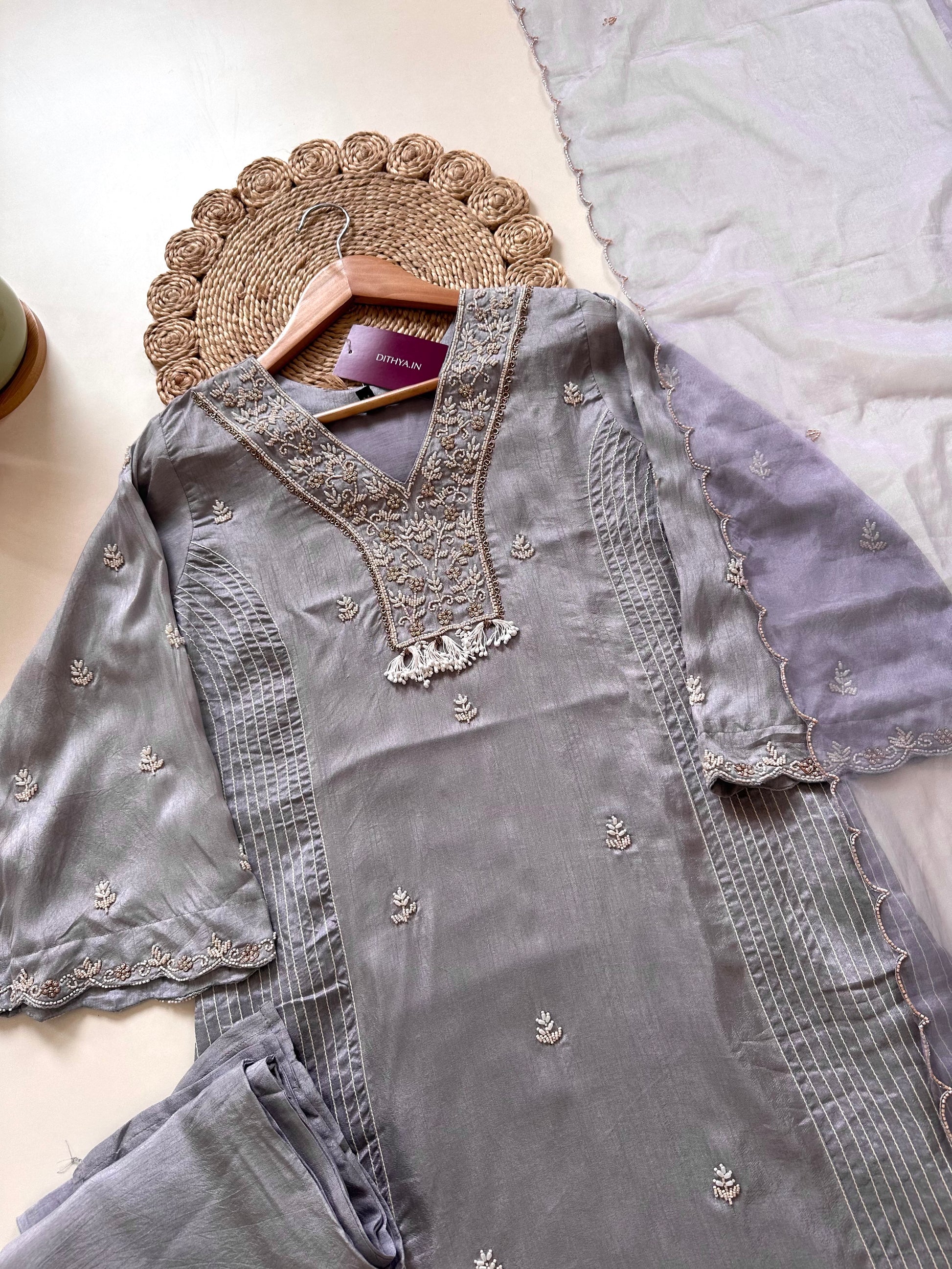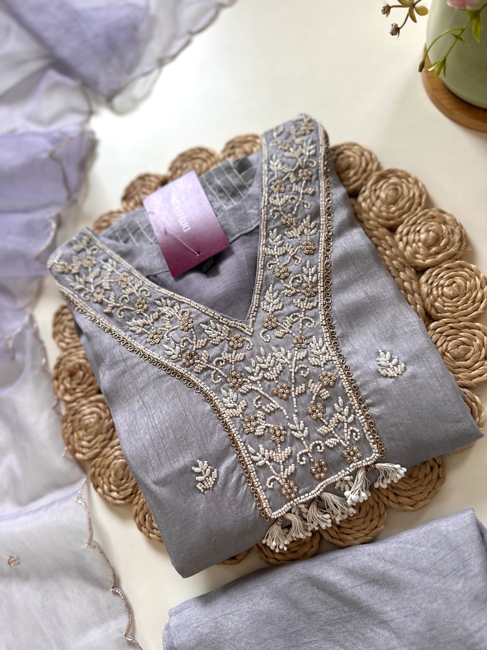 K130 - Russian silk Handwork straight kurti with pants and dupatta