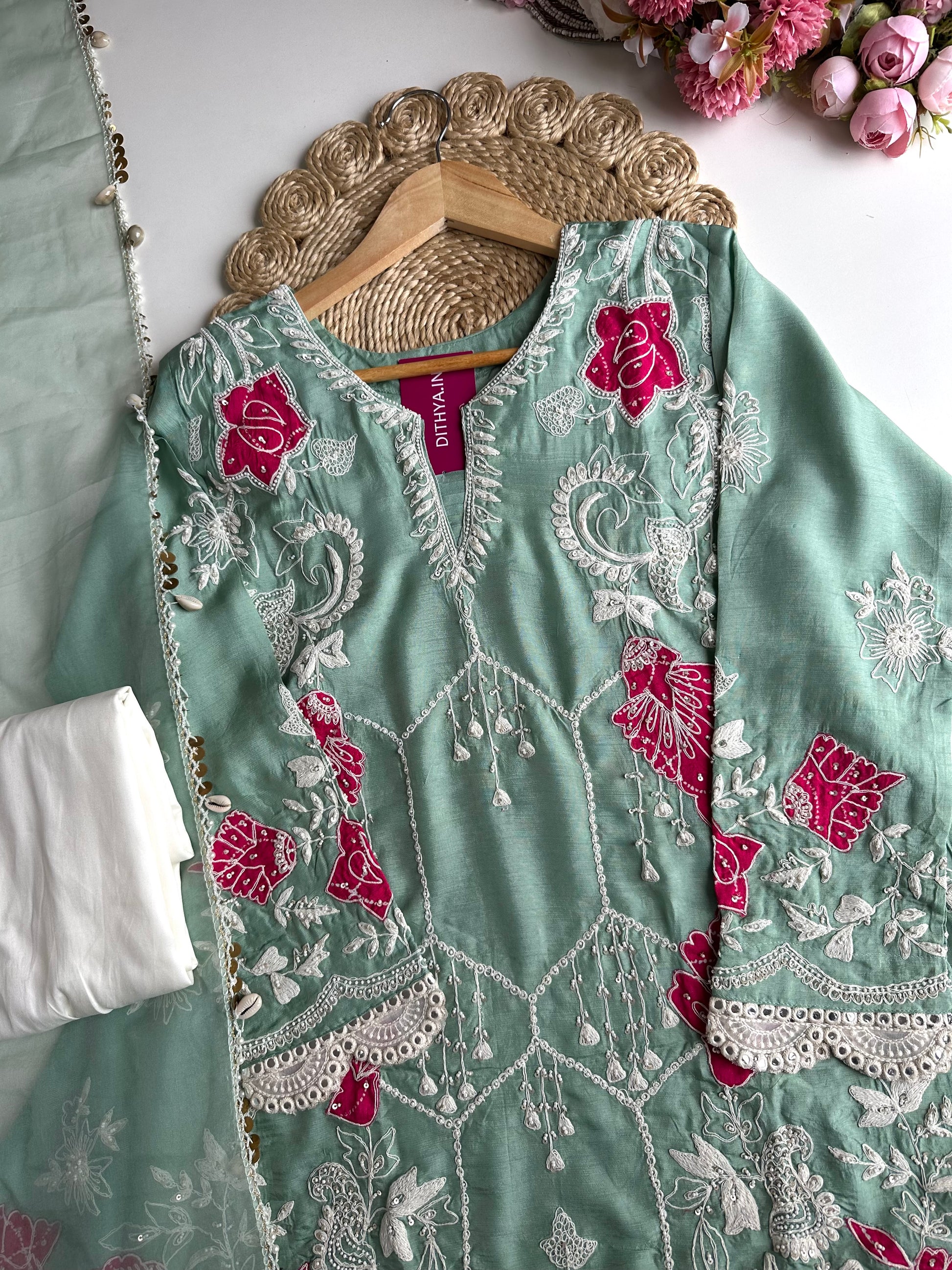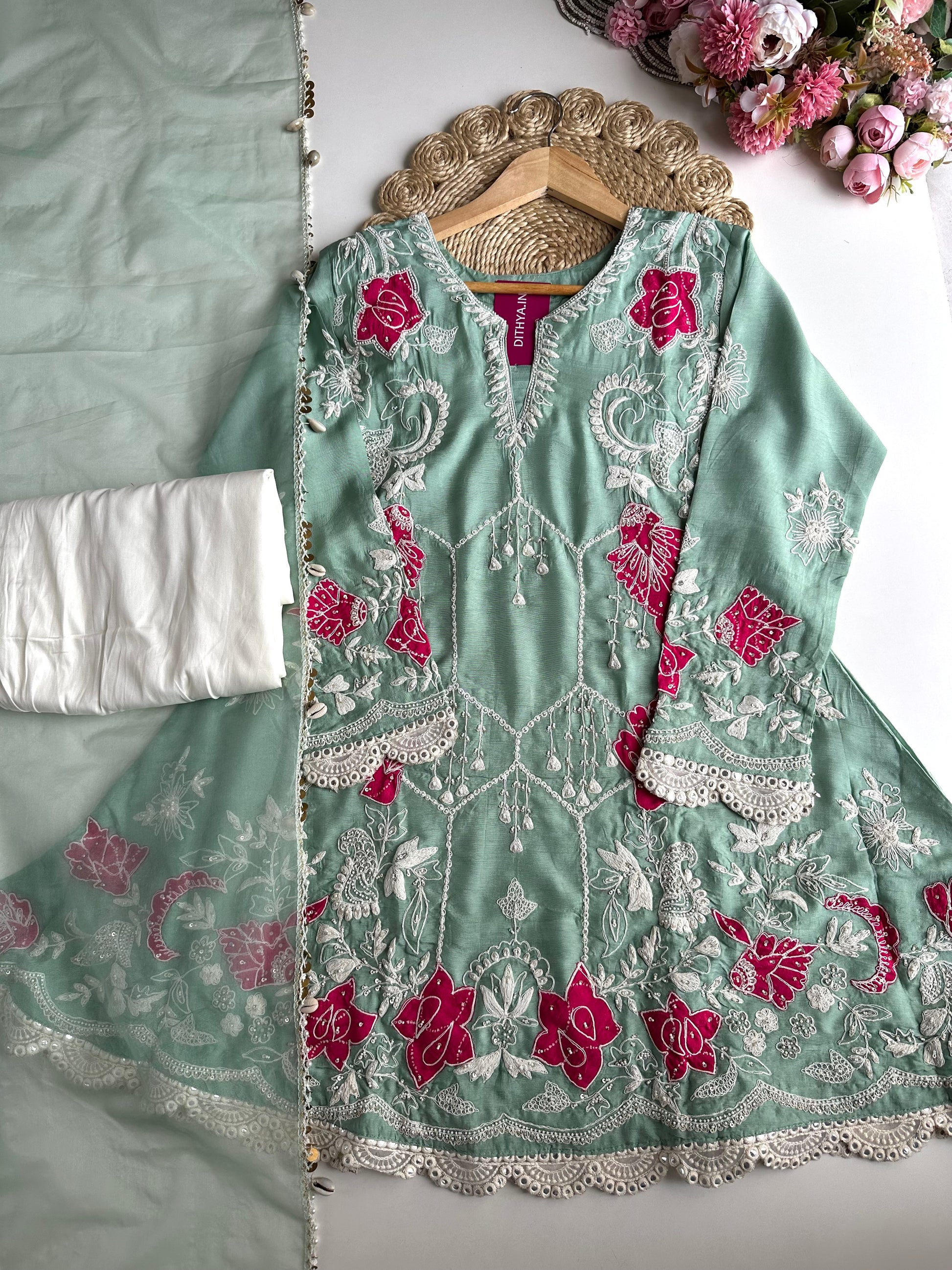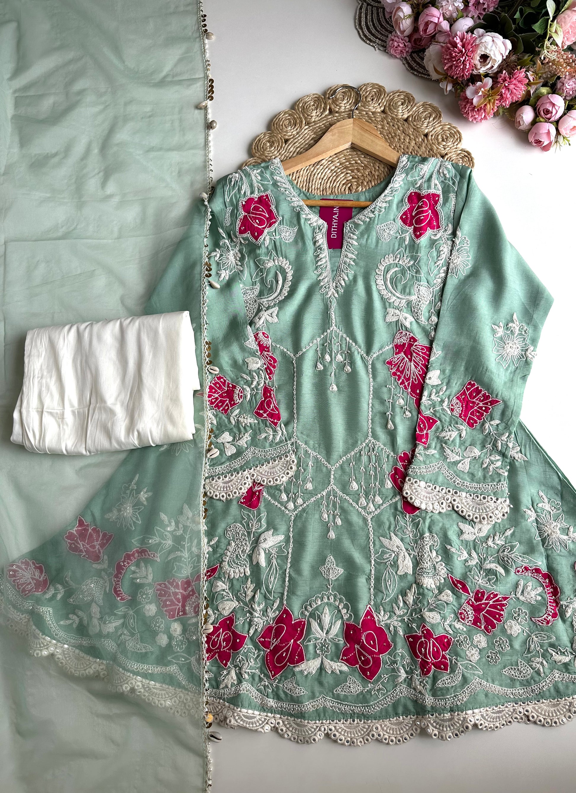 This elegant Kurti set is crafted from premium Russian silk, featuring a beautiful peplum design and paired with comfortable palazzo pants and a coordinating dupatta. Designed for both style and comfort, this outfit is perfect for any occasion. Expertly crafted with quality materials, it exudes luxury and sophistication.