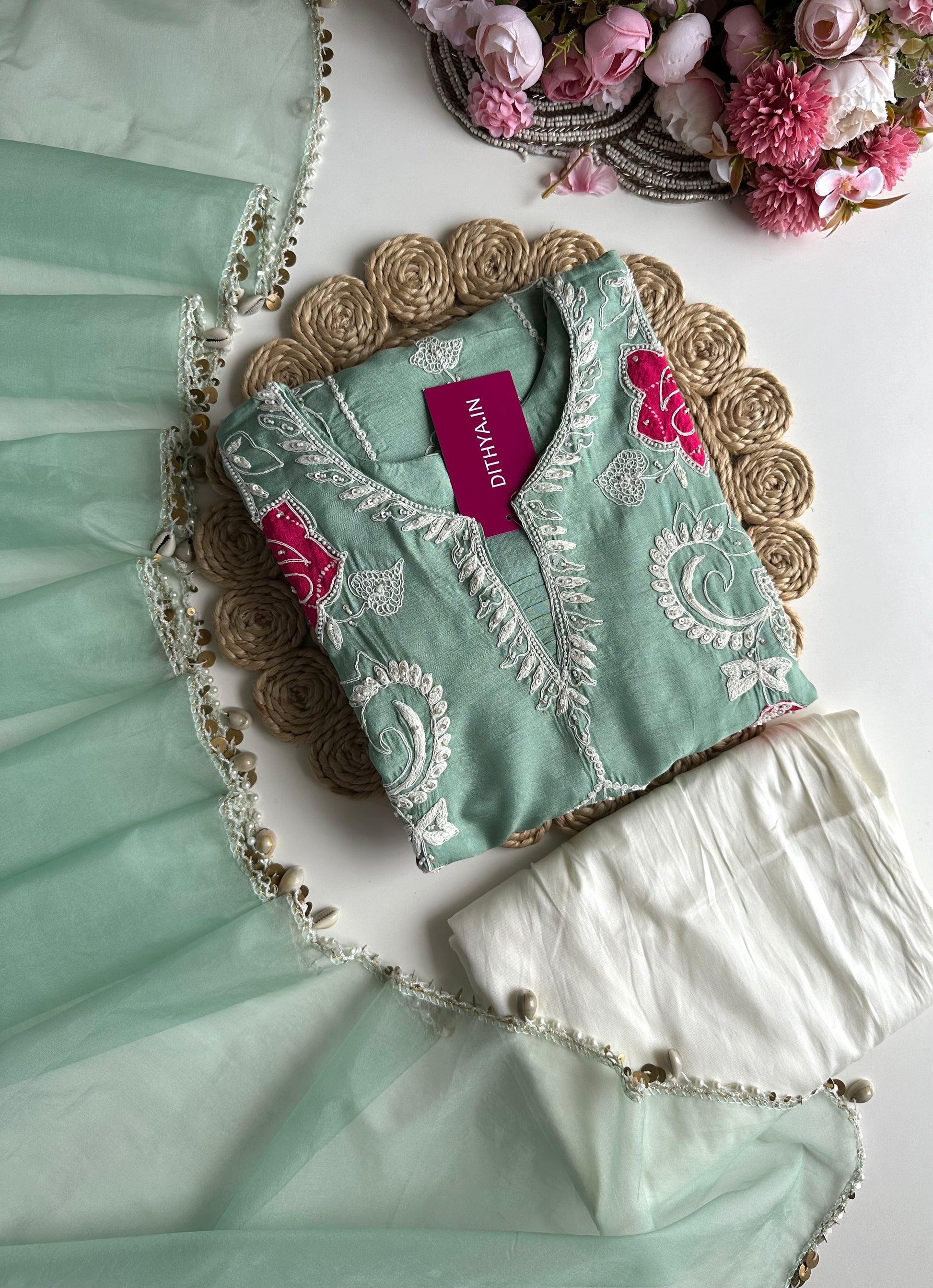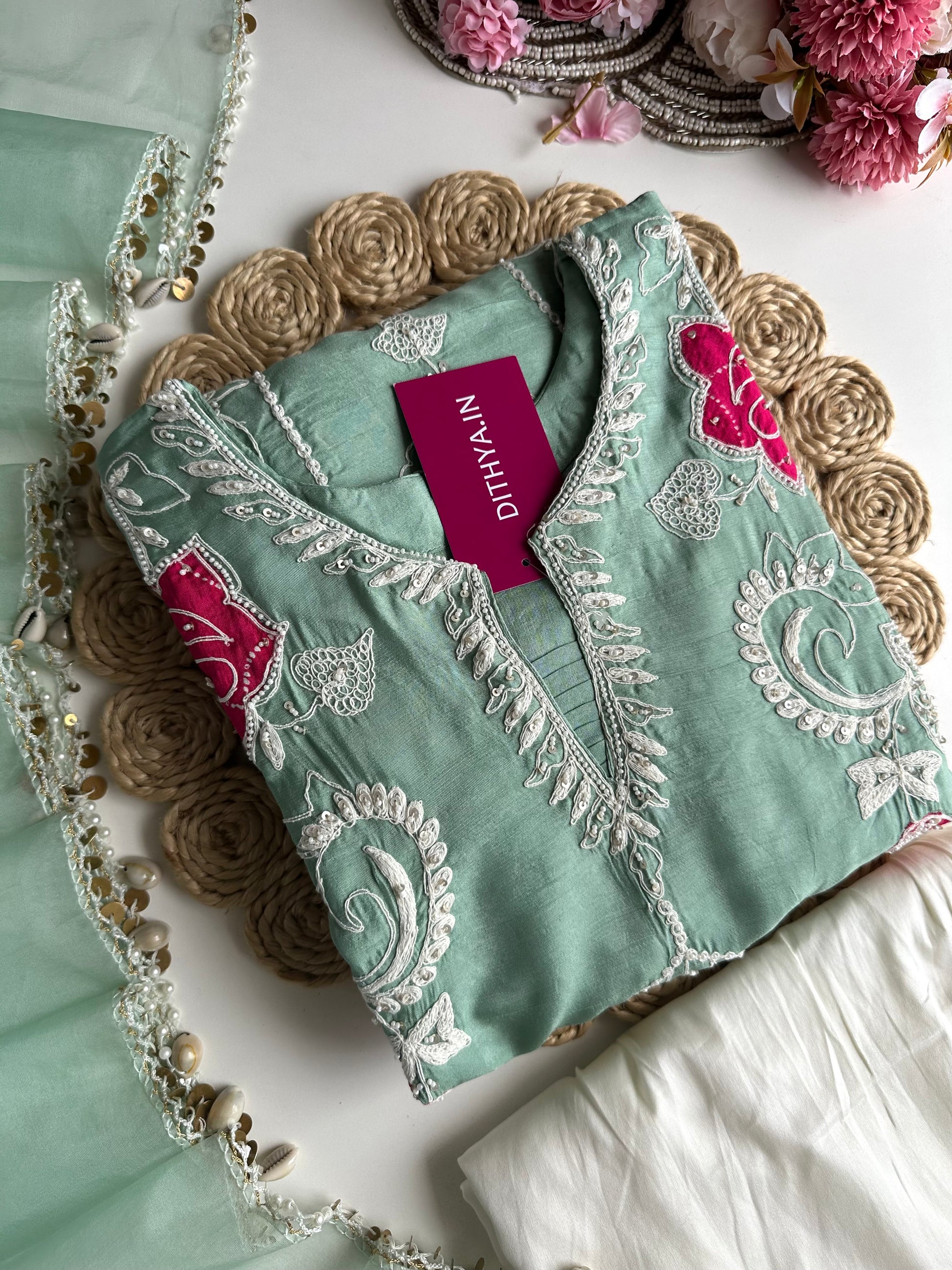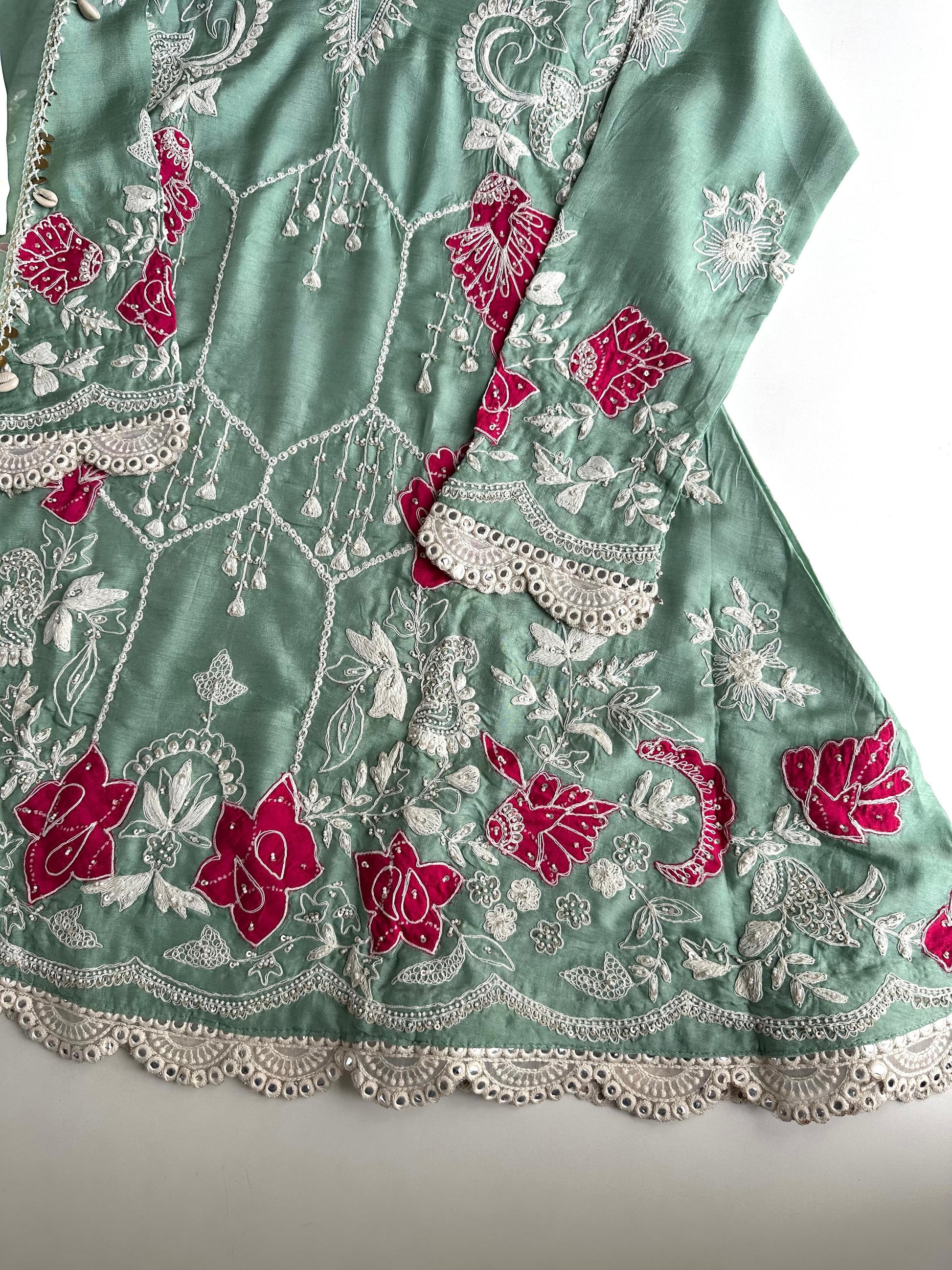 This elegant Kurti set is crafted from premium Russian silk, featuring a beautiful peplum design and paired with comfortable palazzo pants and a coordinating dupatta. Designed for both style and comfort, this outfit is perfect for any occasion. Expertly crafted with quality materials, it exudes luxury and sophistication.