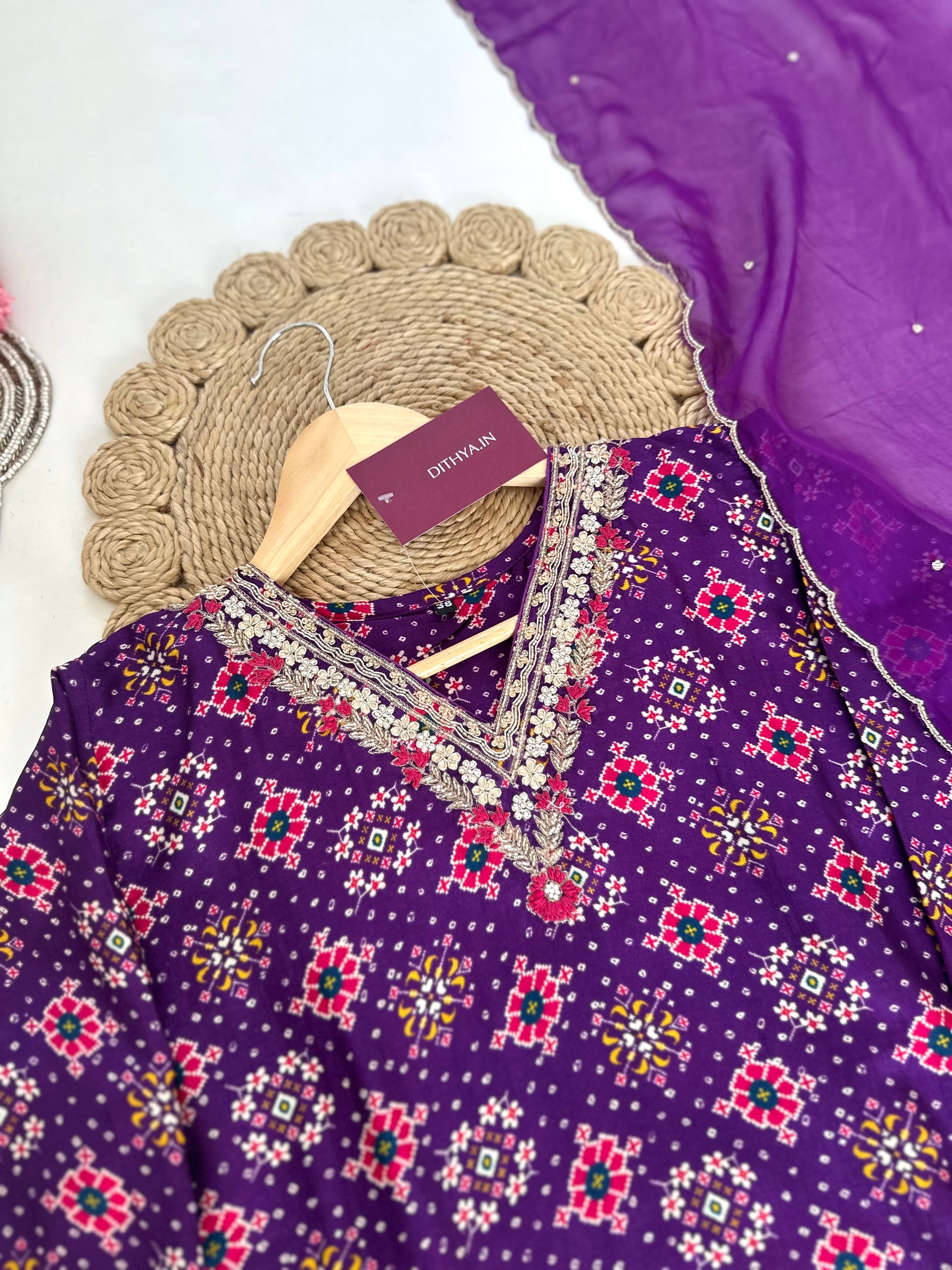 K323 - Russian silk Patola printed straight kurti with pants and dupatta