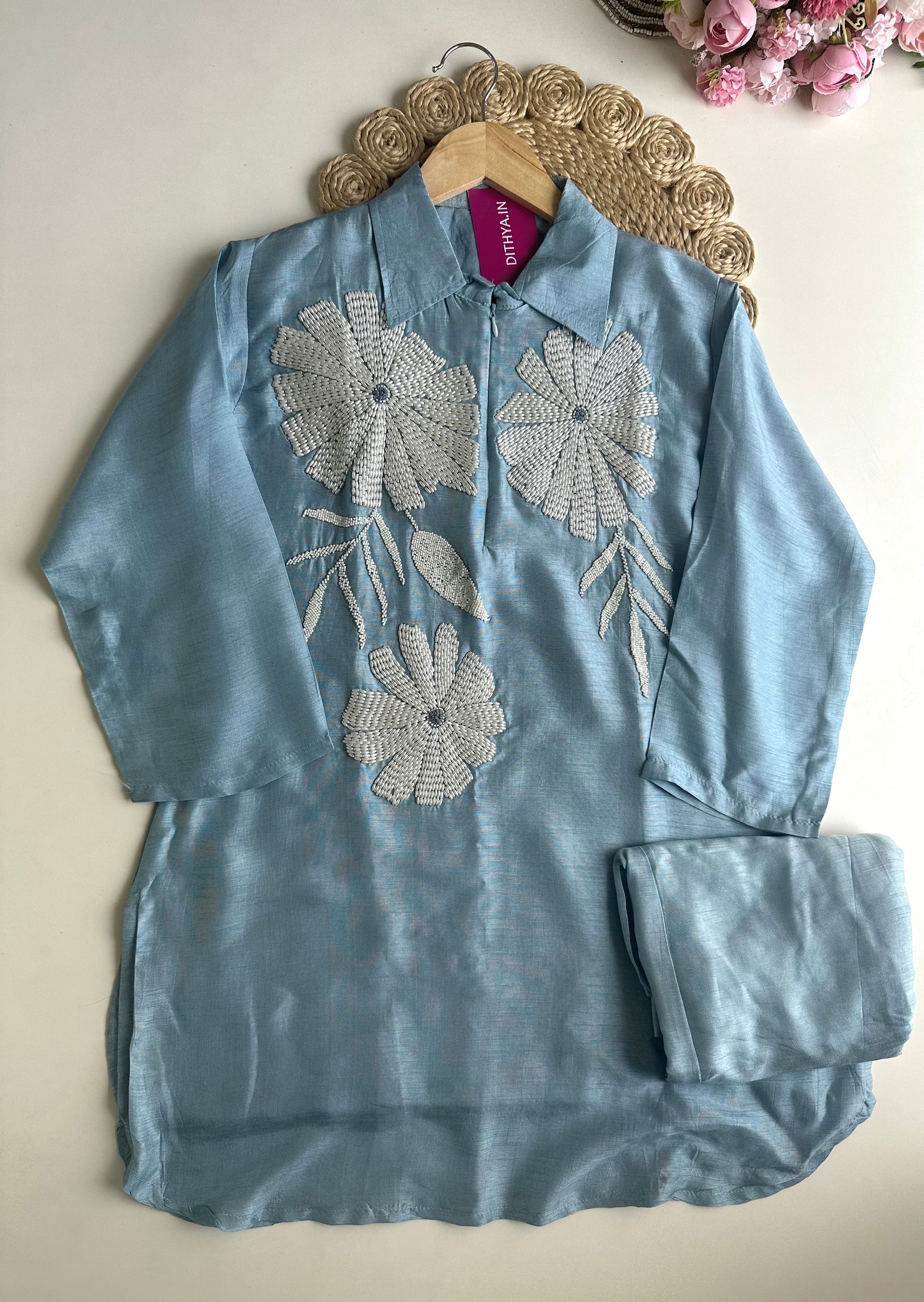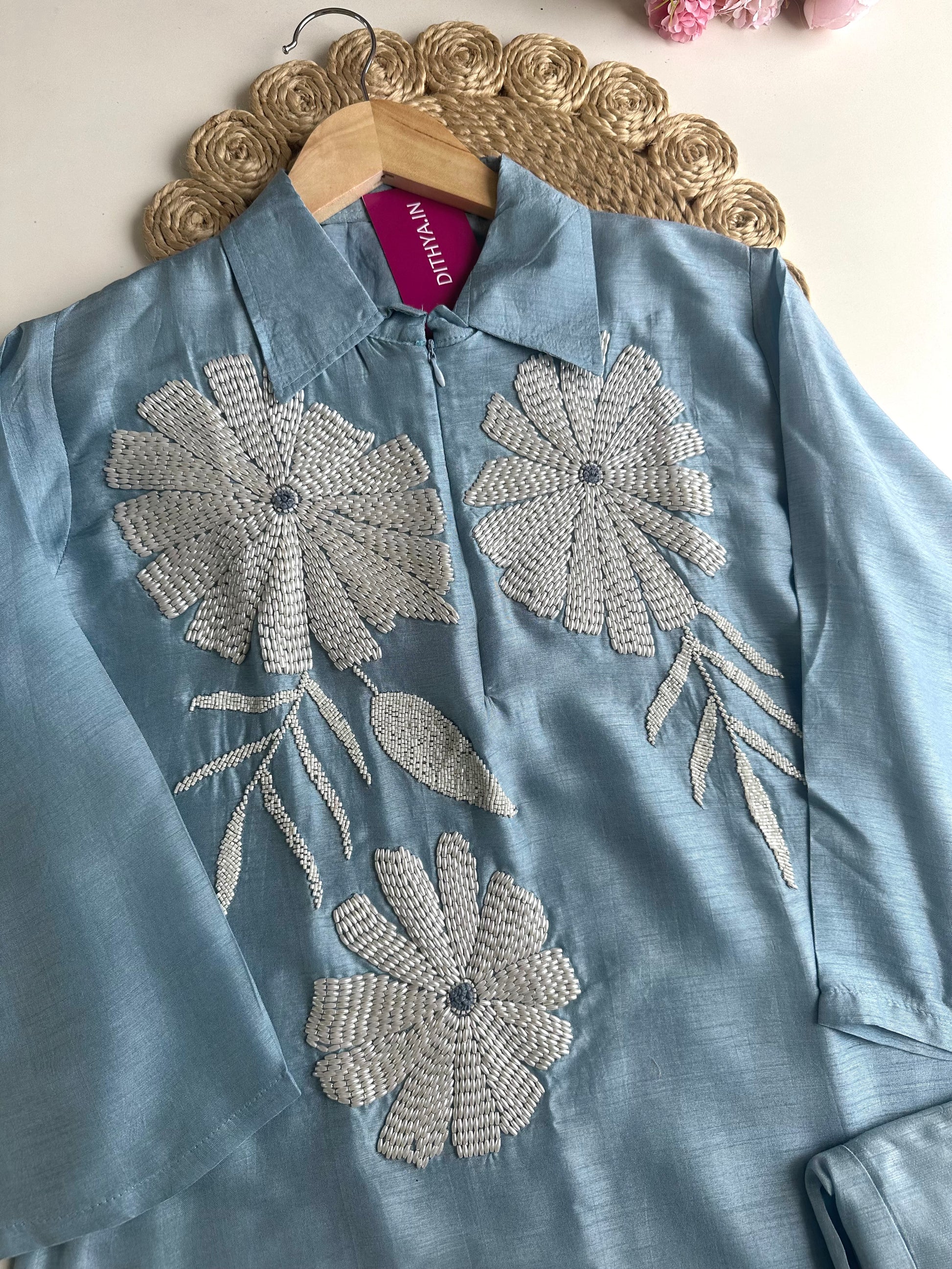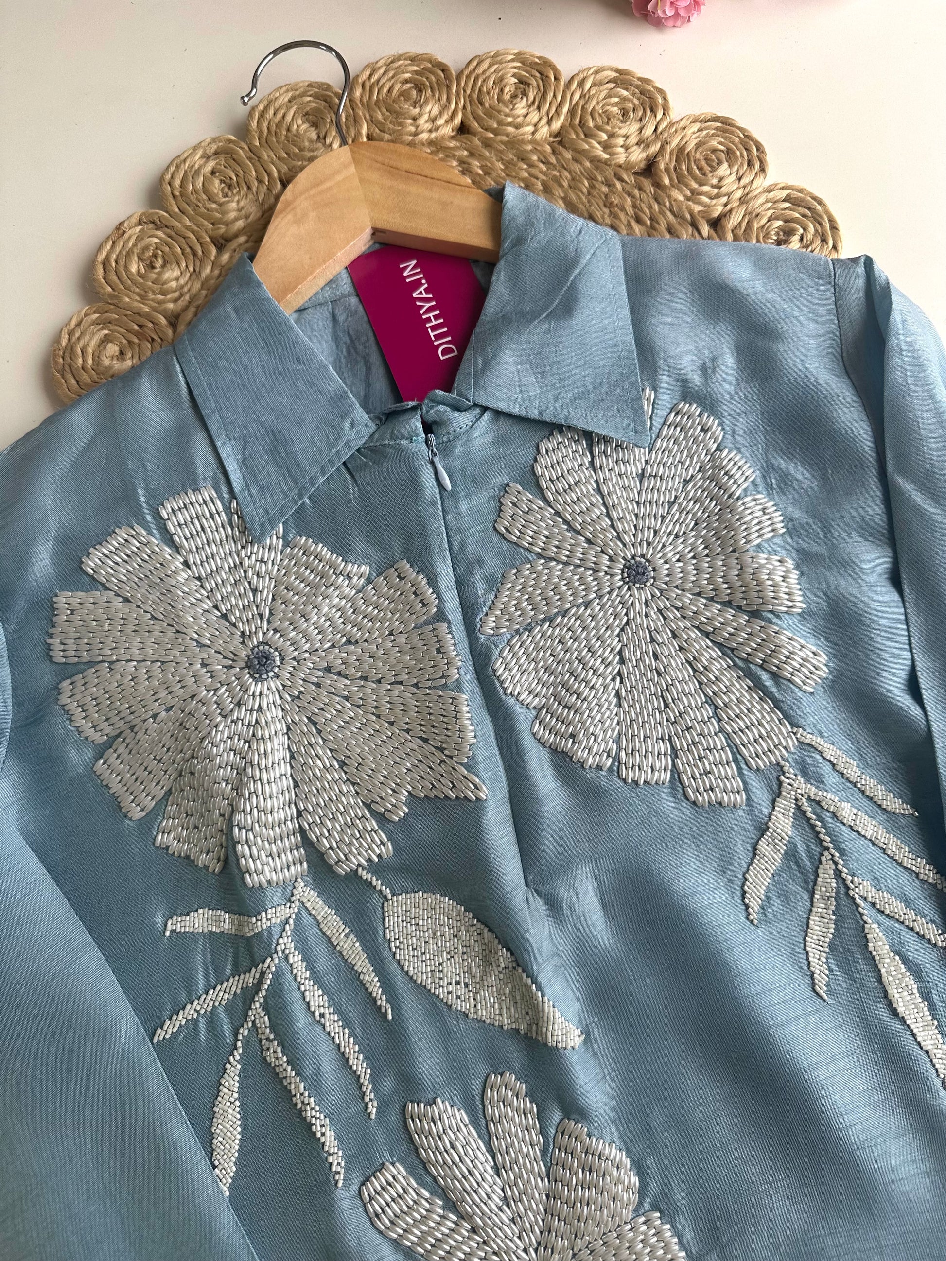 Crafted from luxurious Russian silk, this elegant coord set features exquisite pearl work for a sophisticated touch. Perfect for any occasion, this set is expertly designed for a timeless and polished look. Elevate your style with this stunning addition to your wardrobe.