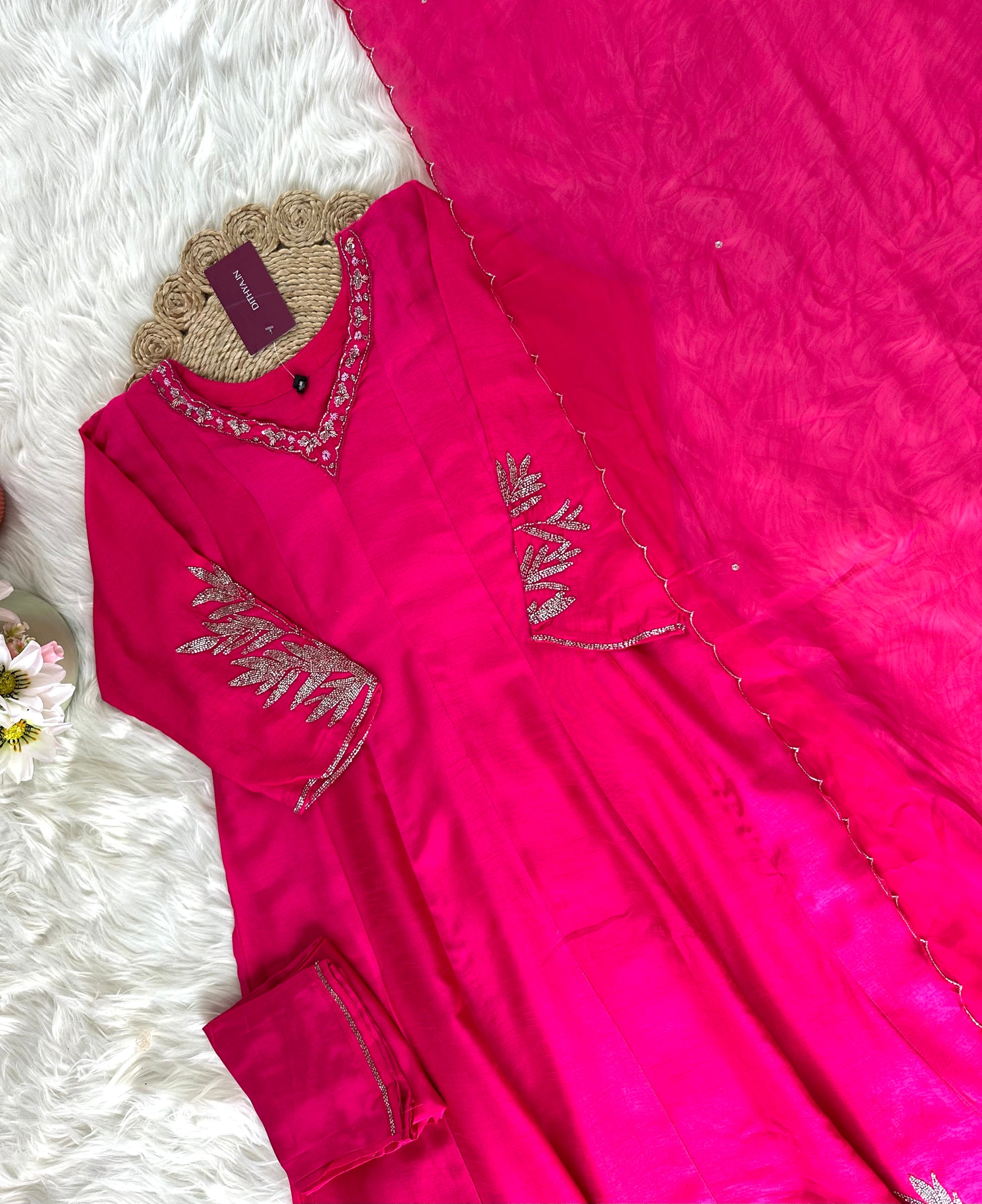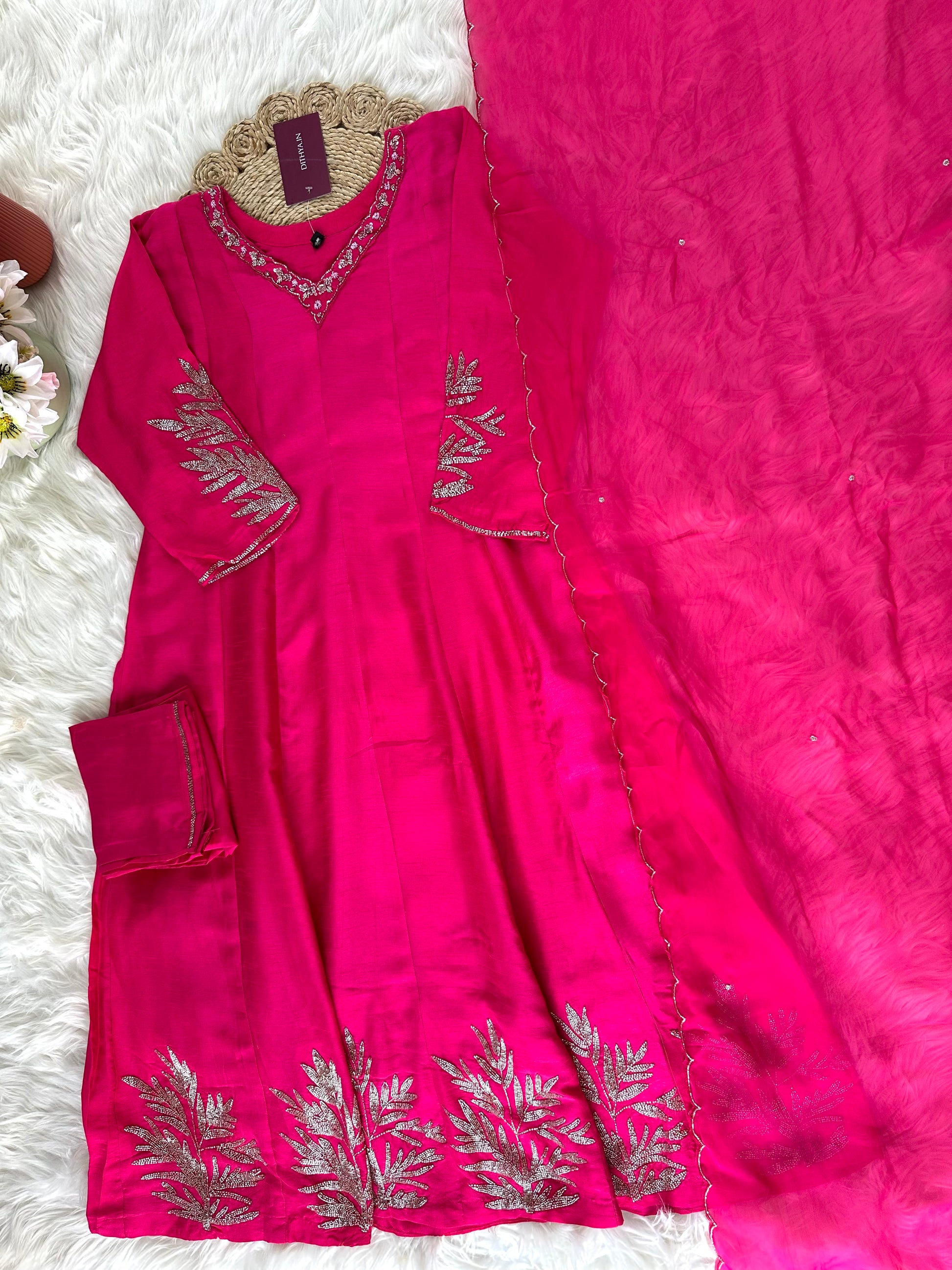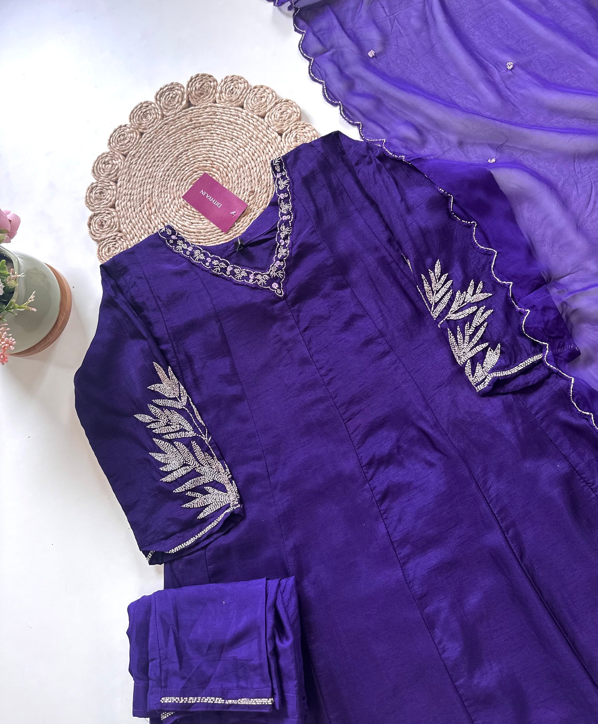 Expertly crafted from luxurious Russian silk, this Anarkali ensemble is adorned with intricate Zardosi work. Its elegant design is paired with comfortable pants and a beautiful dupatta, adding versatility to your wardrobe. Elevate your style with this timeless piece.