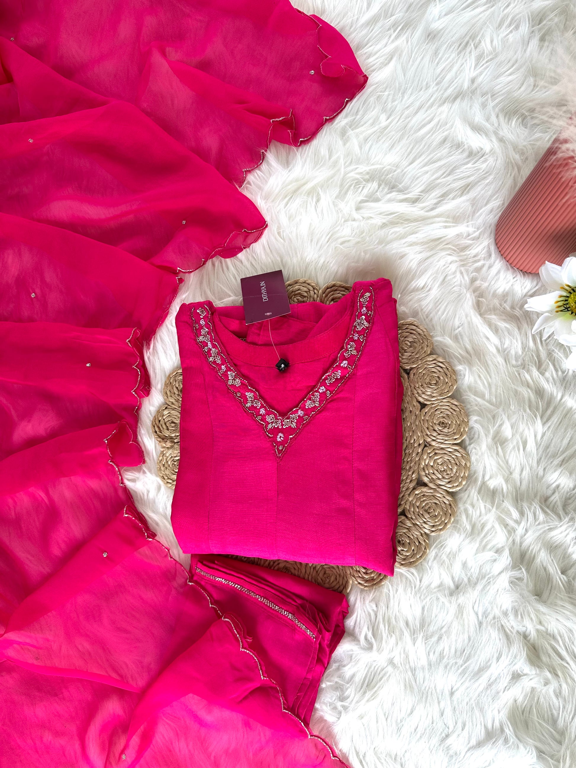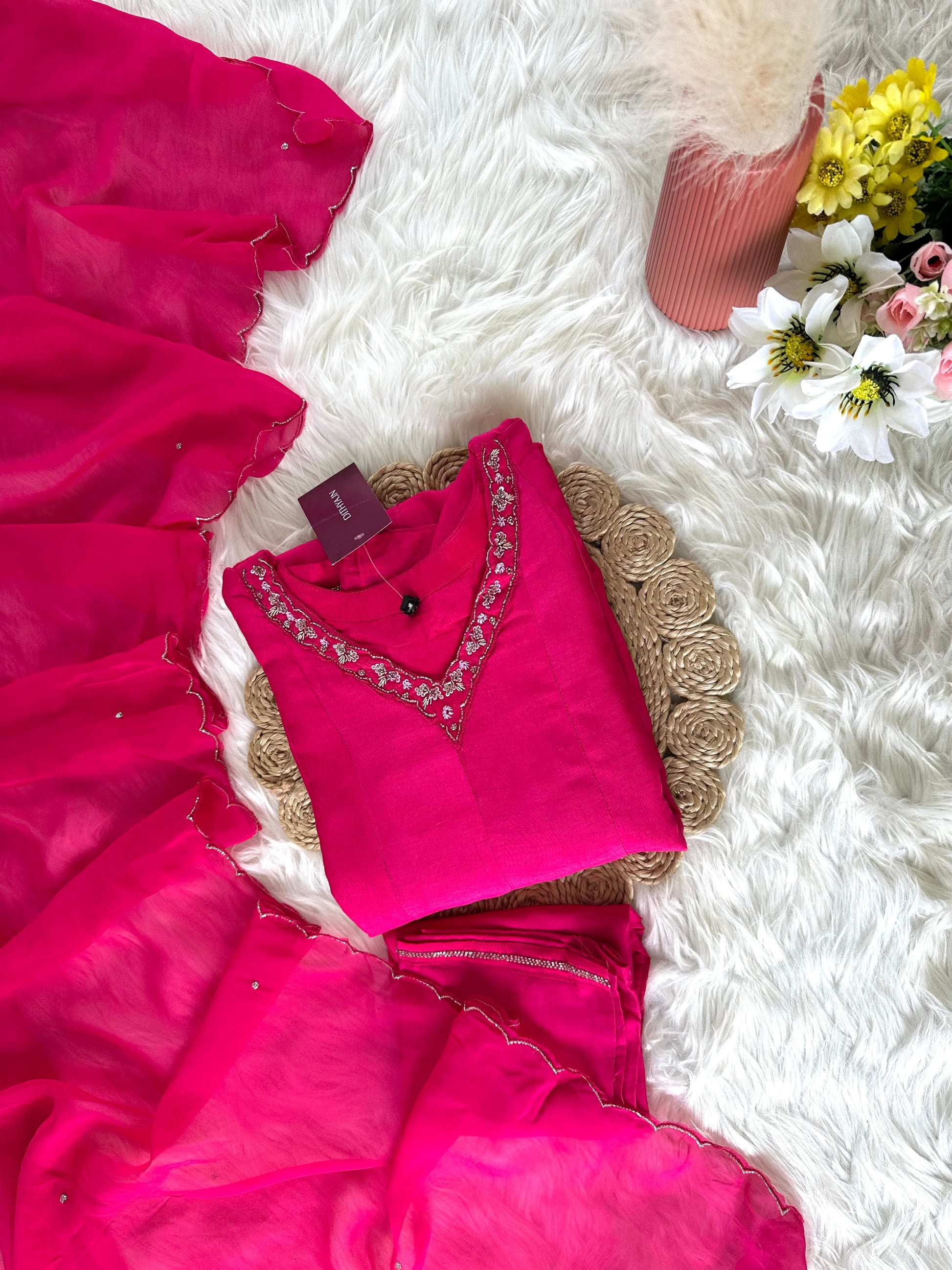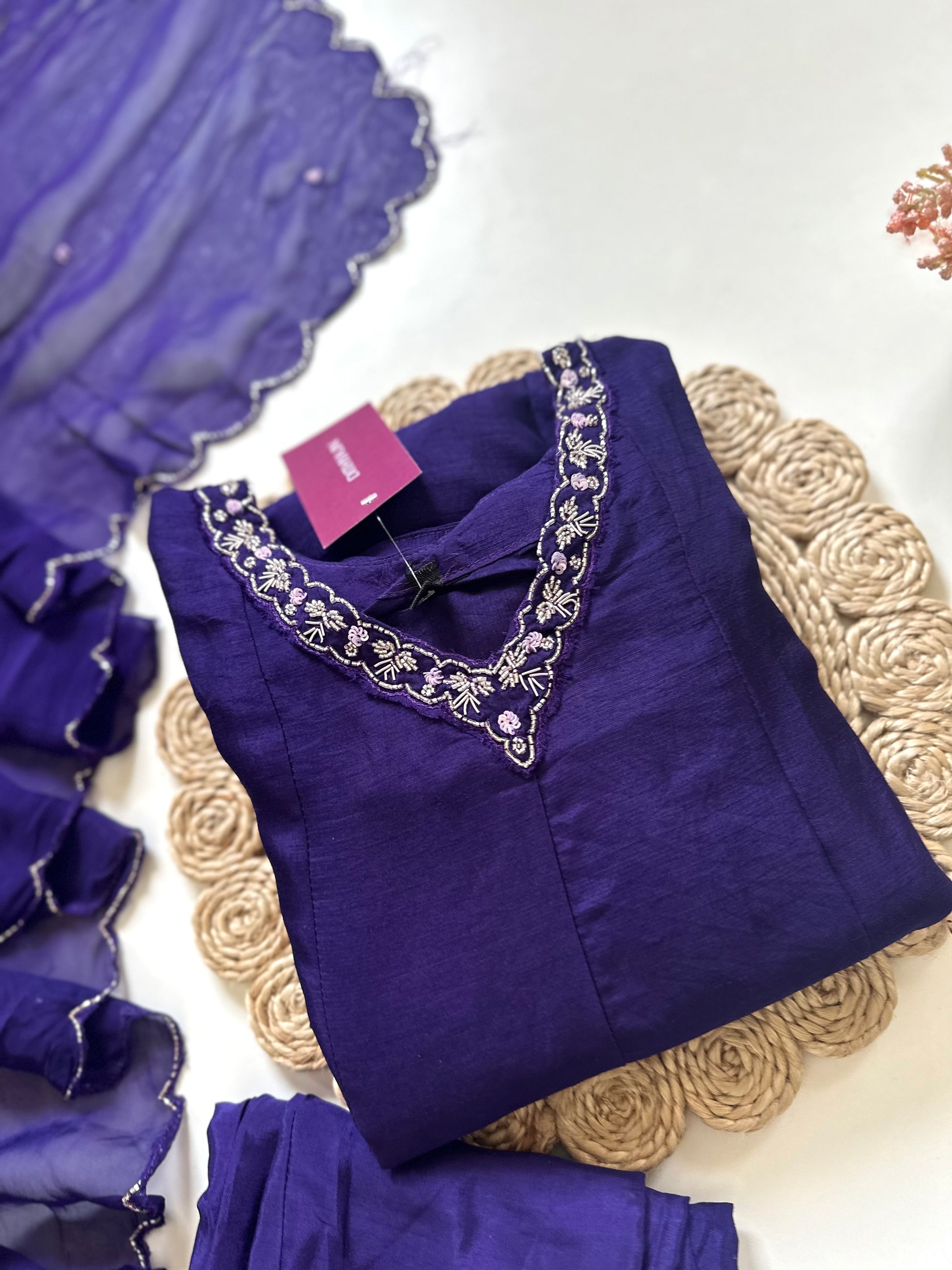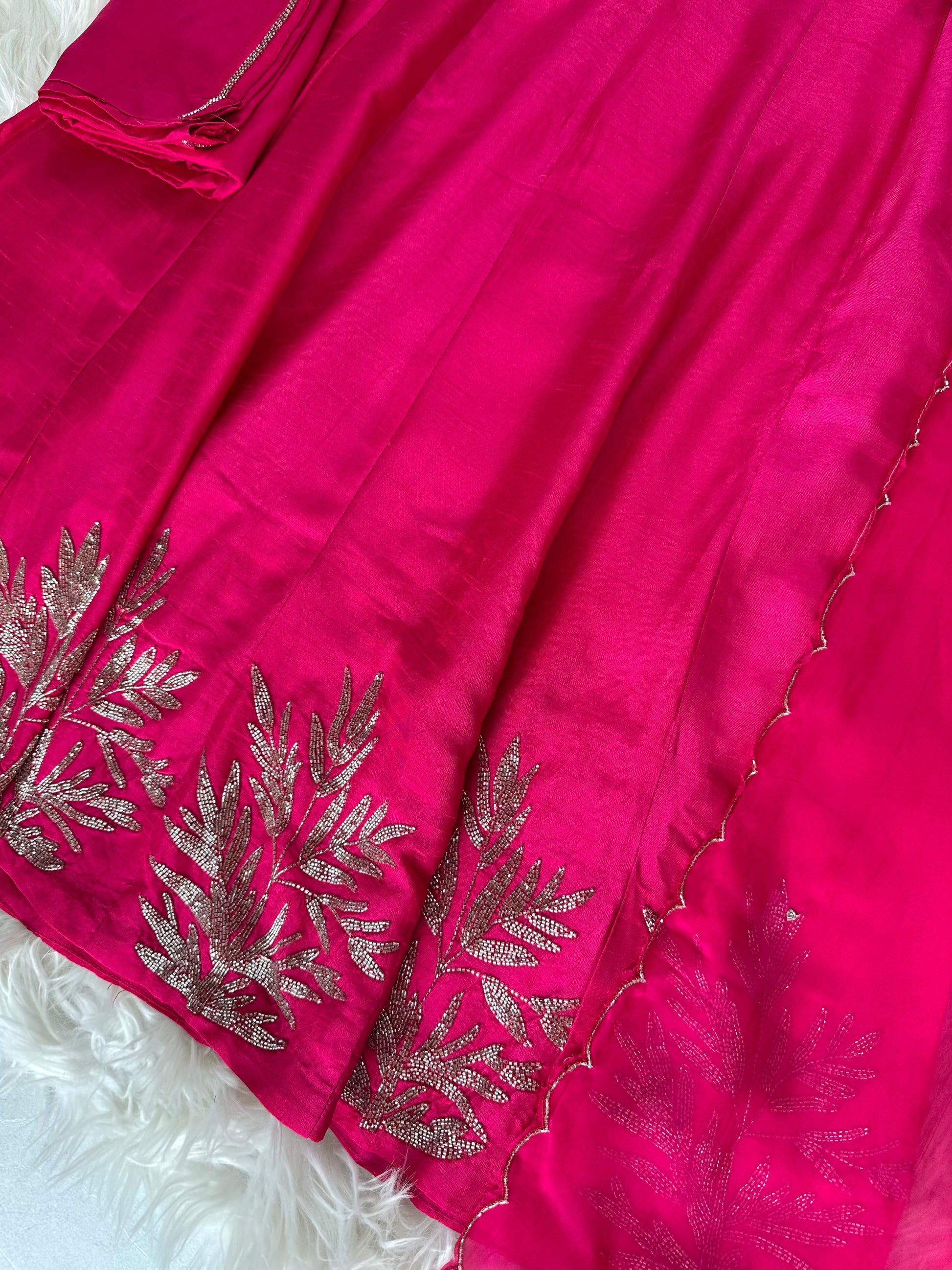 Expertly crafted from luxurious Russian silk, this Anarkali ensemble is adorned with intricate Zardosi work. Its elegant design is paired with comfortable pants and a beautiful dupatta, adding versatility to your wardrobe. Elevate your style with this timeless piece.