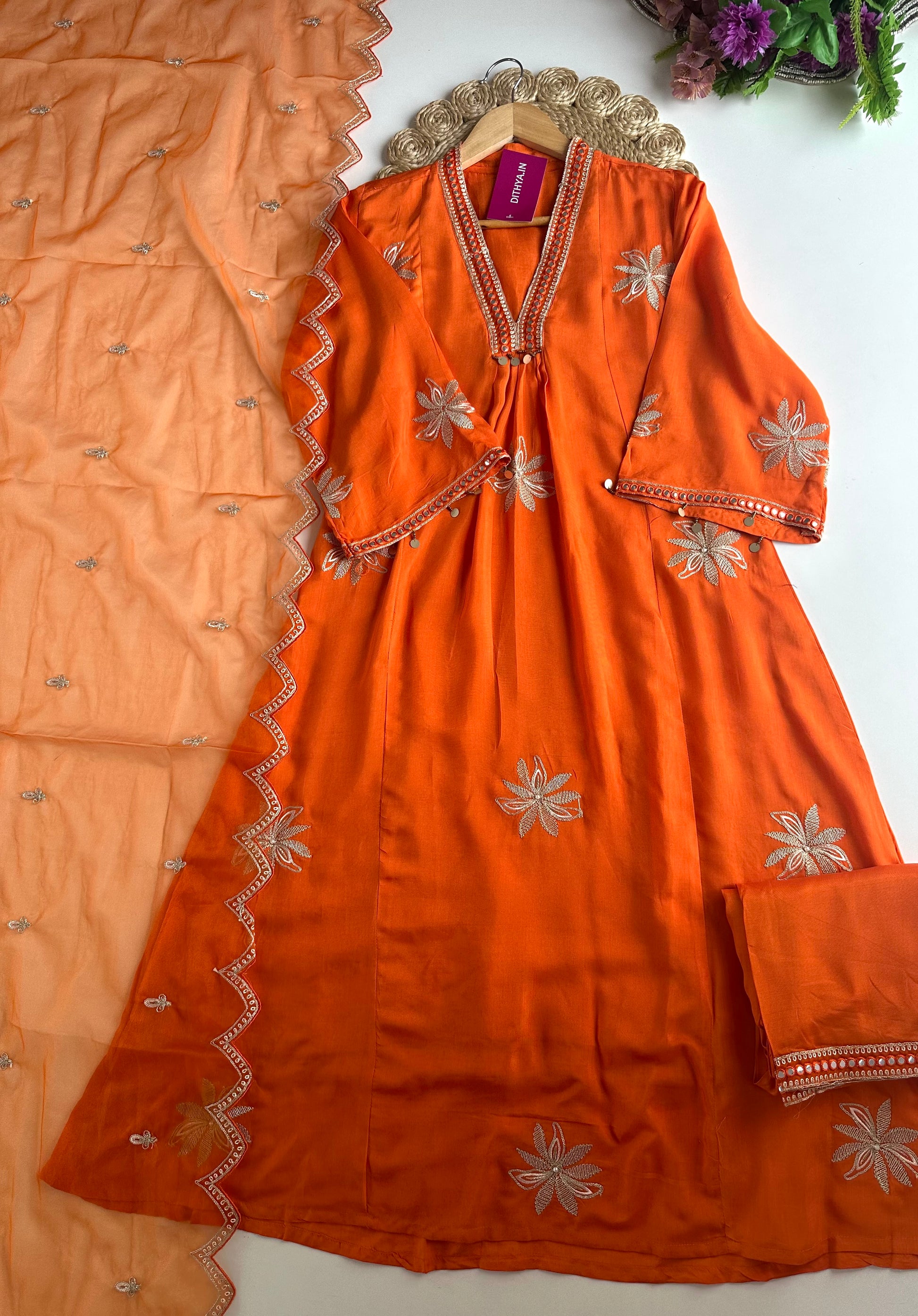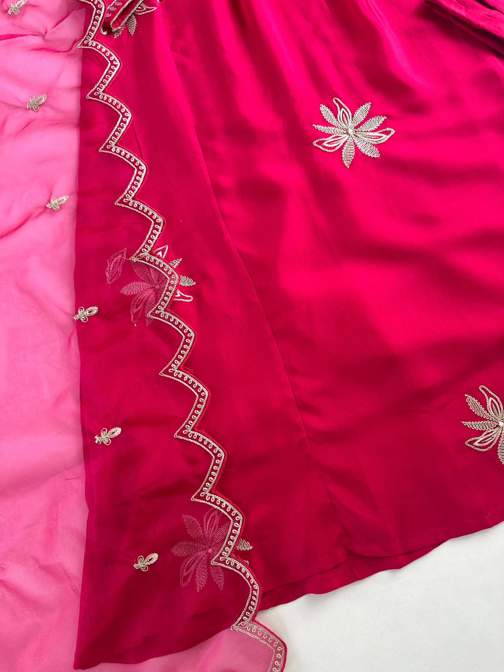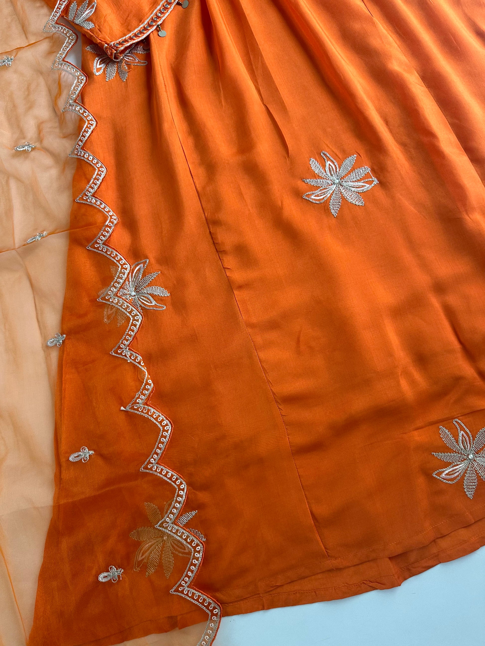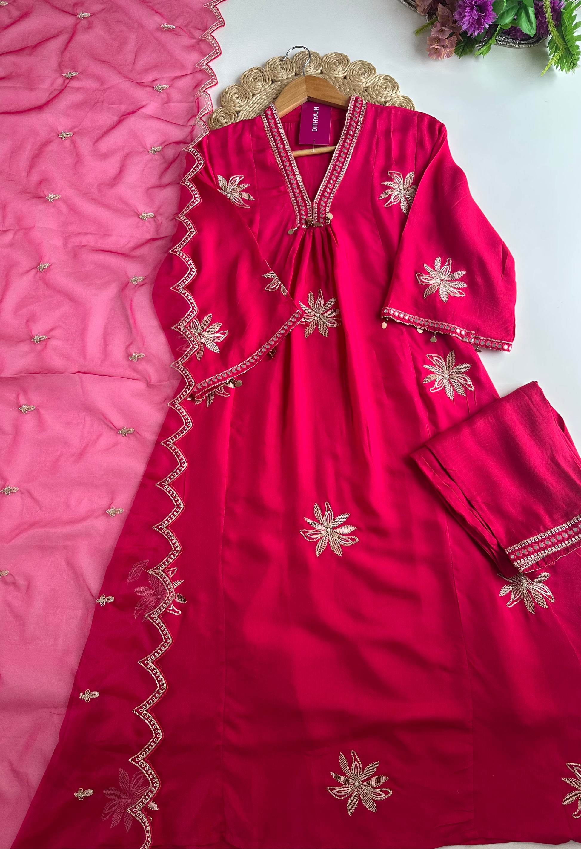 This exquisite Russian silk zari Anarkali comes with a matching pair of pants and dupatta, available in two stunning colours. The intricate zari work adds a touch of elegance to this traditional ensemble. Perfect for special occasions, this outfit is designed to make you stand out in a crowd.