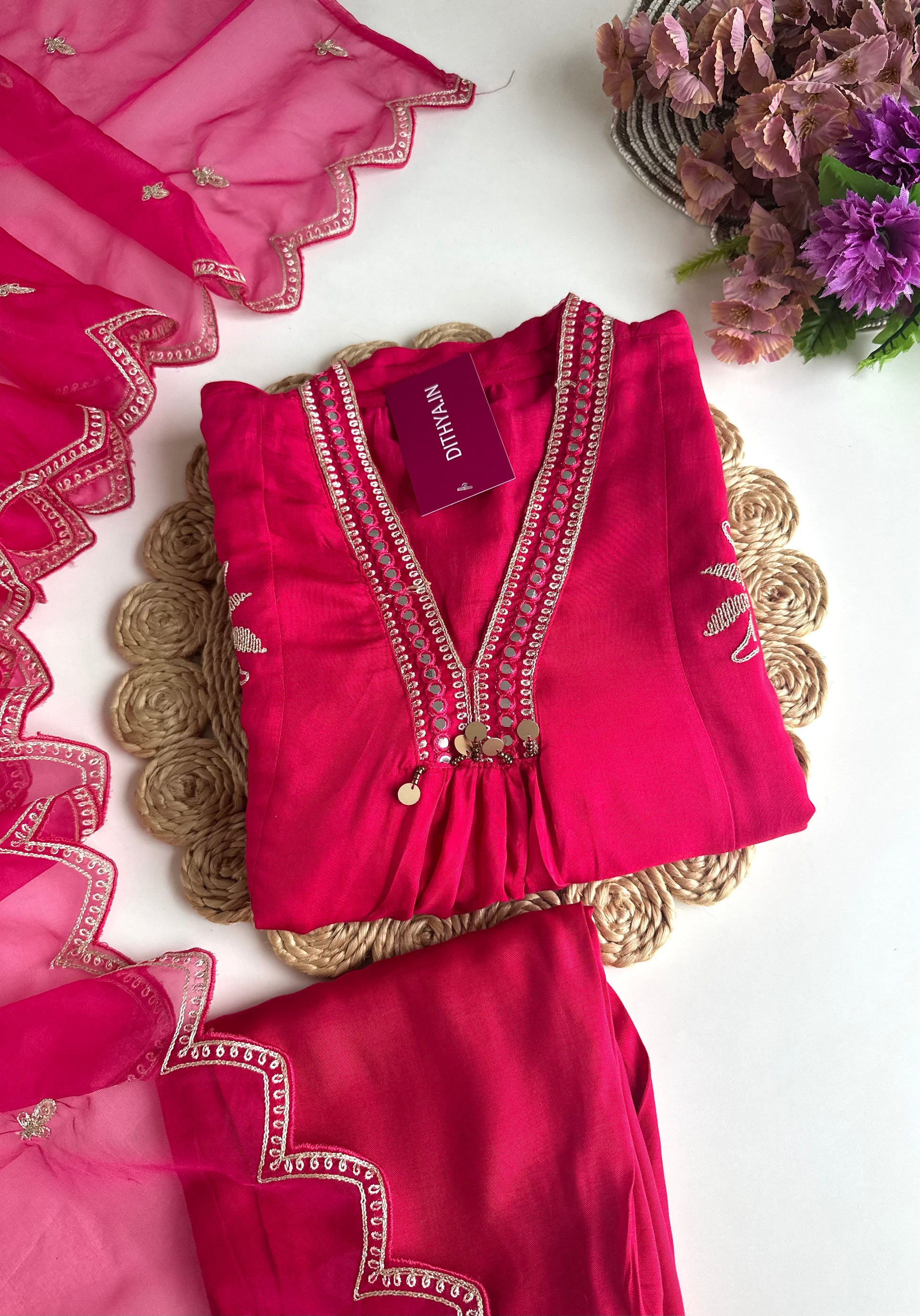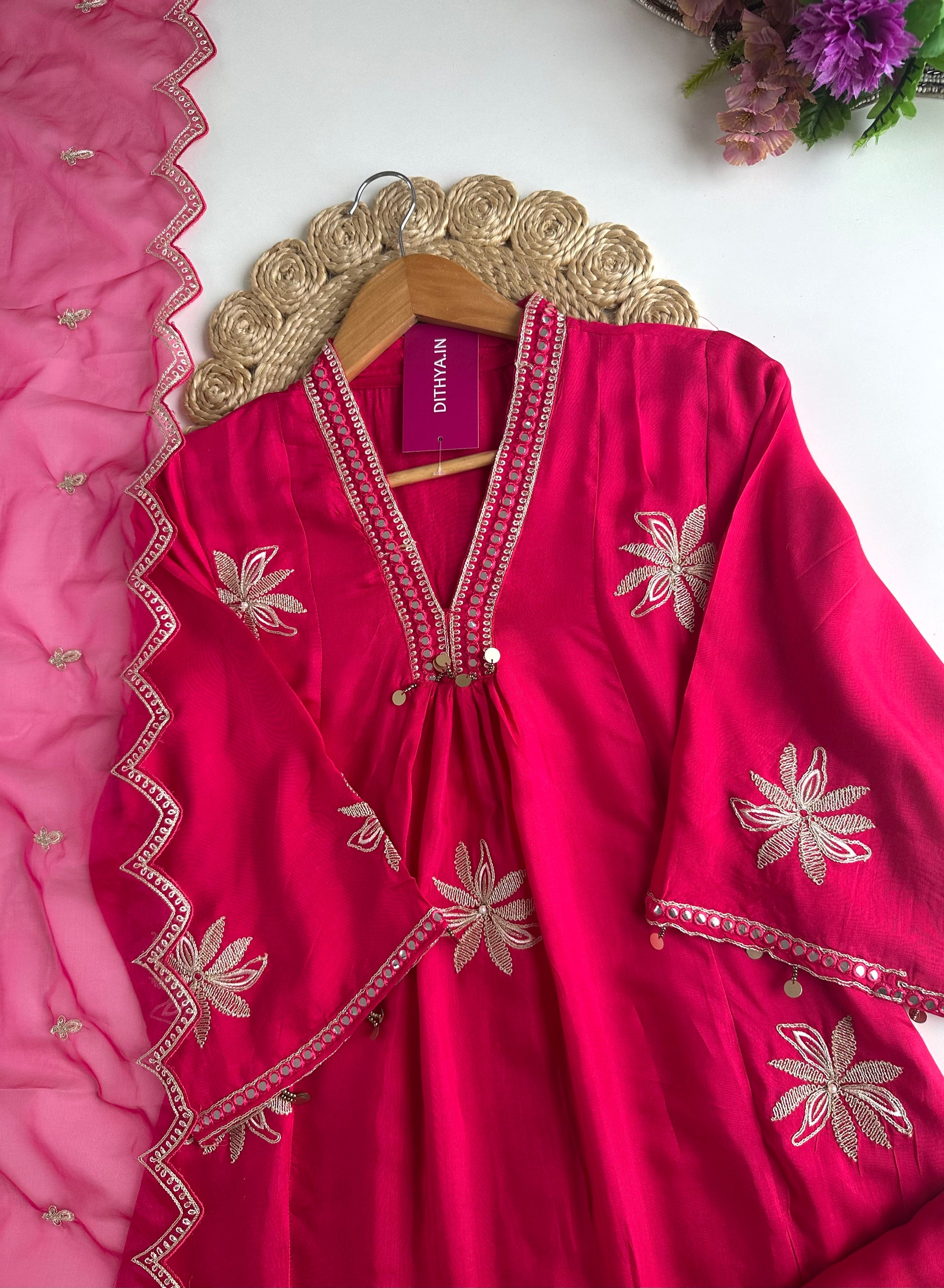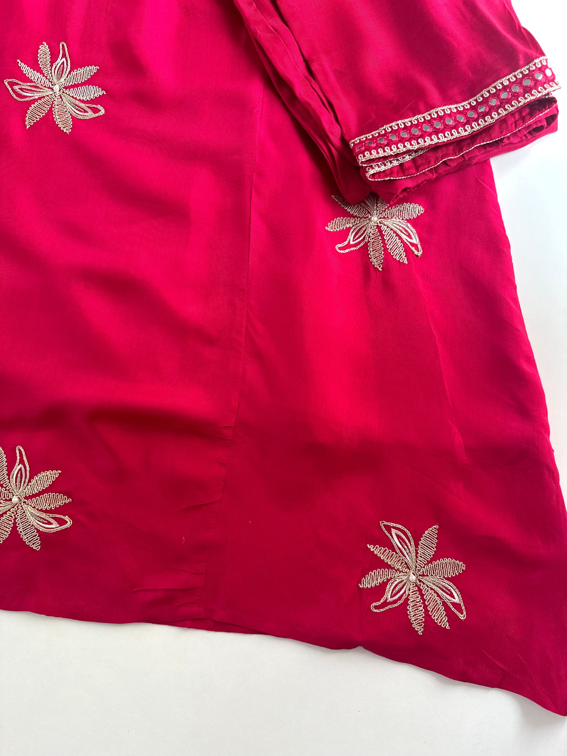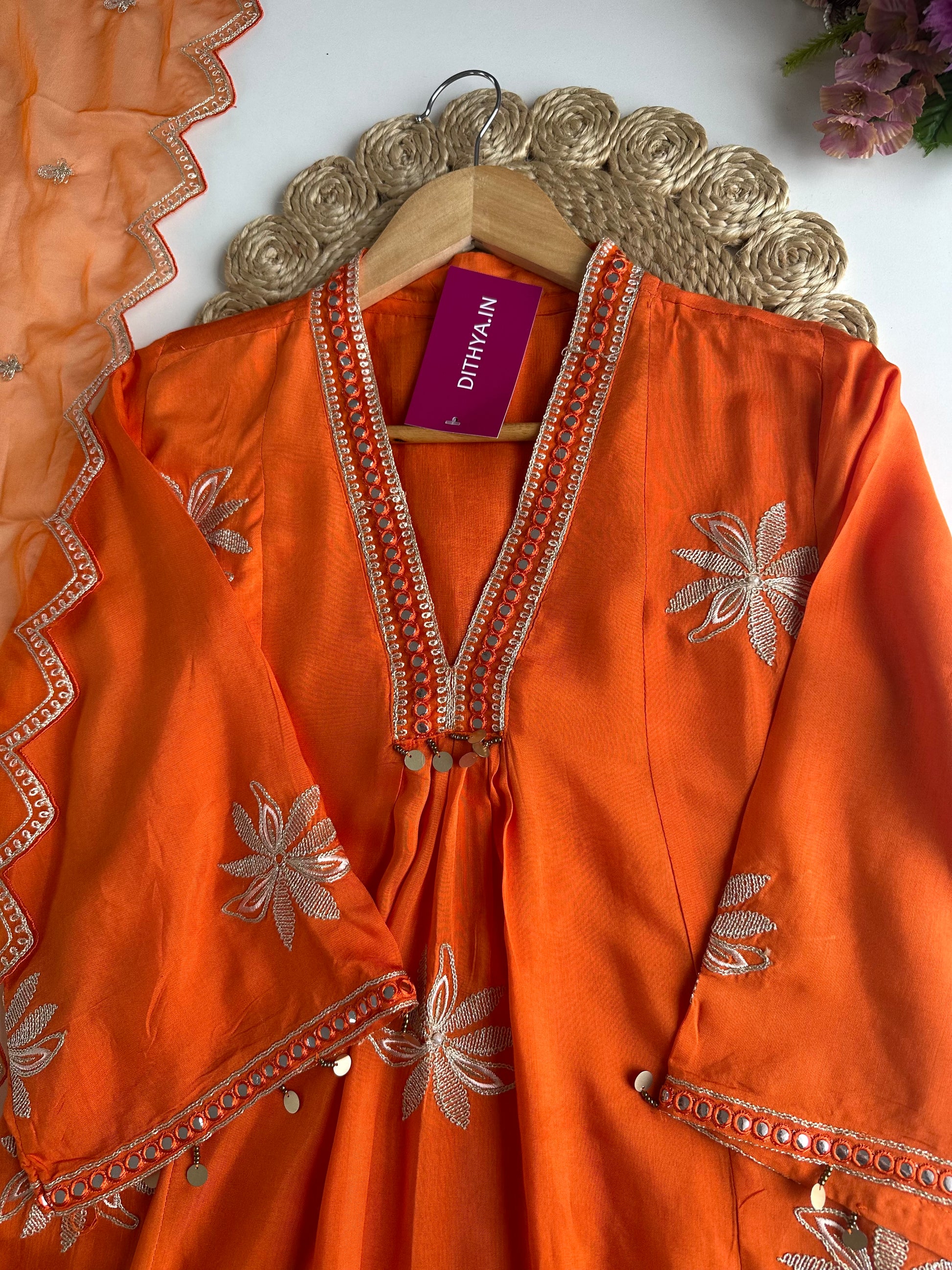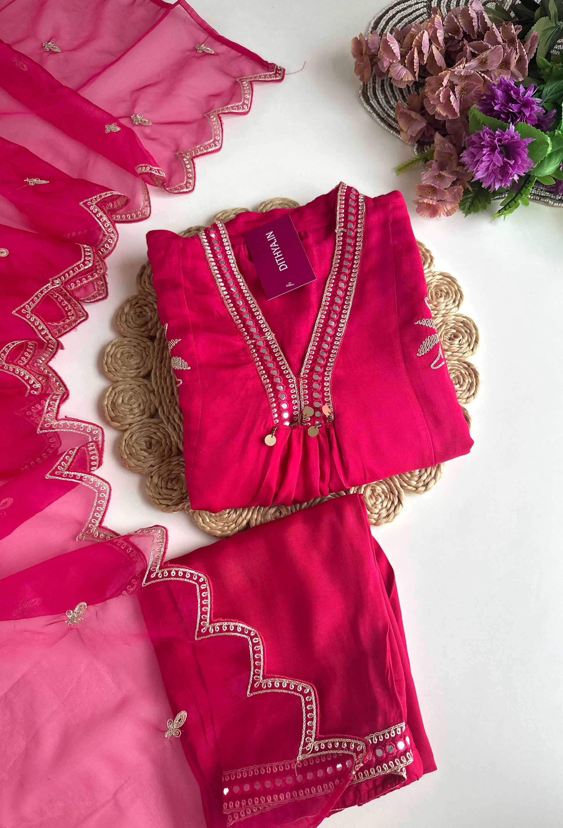This exquisite Russian silk zari Anarkali comes with a matching pair of pants and dupatta, available in two stunning colours. The intricate zari work adds a touch of elegance to this traditional ensemble. Perfect for special occasions, this outfit is designed to make you stand out in a crowd.