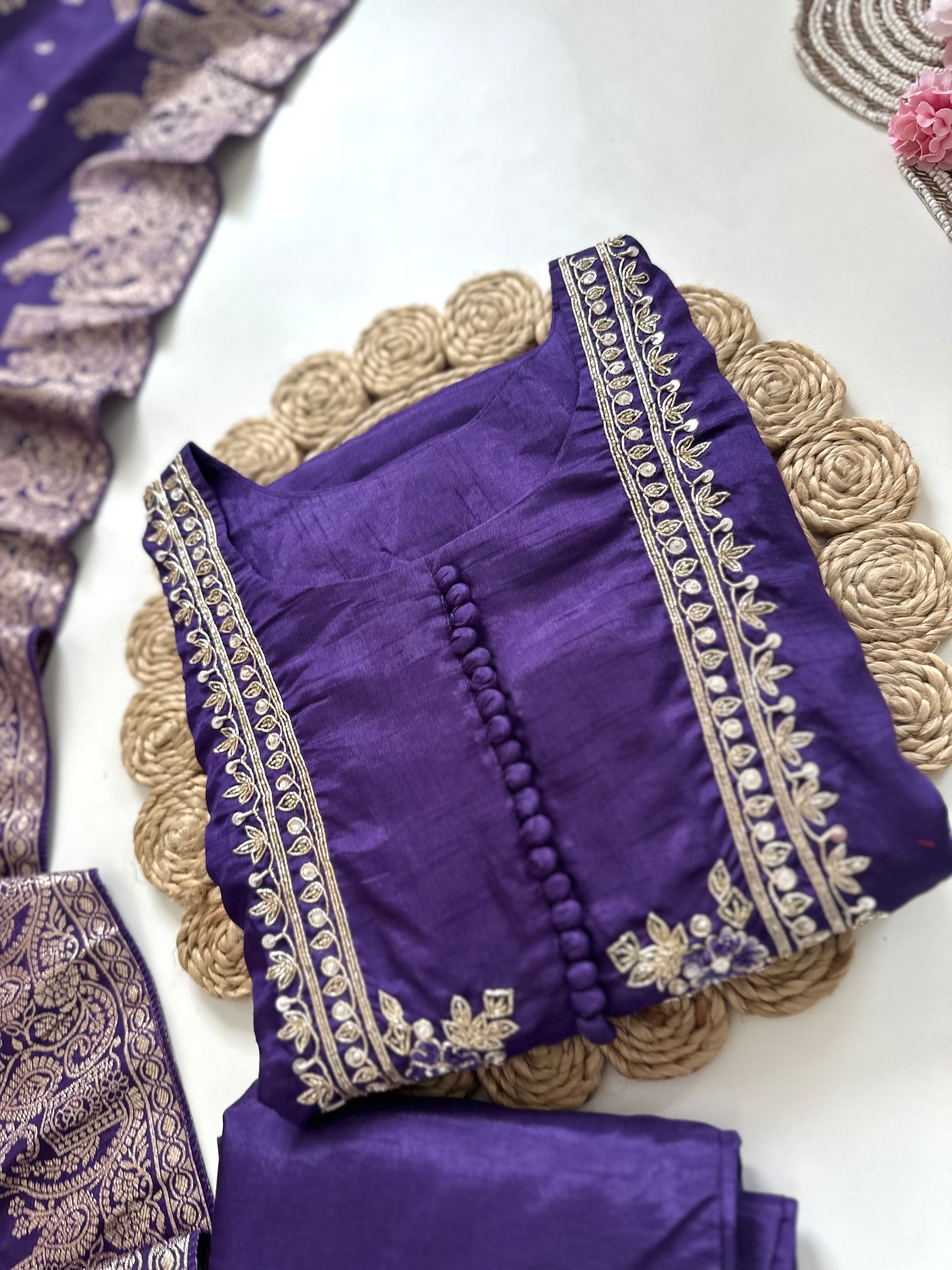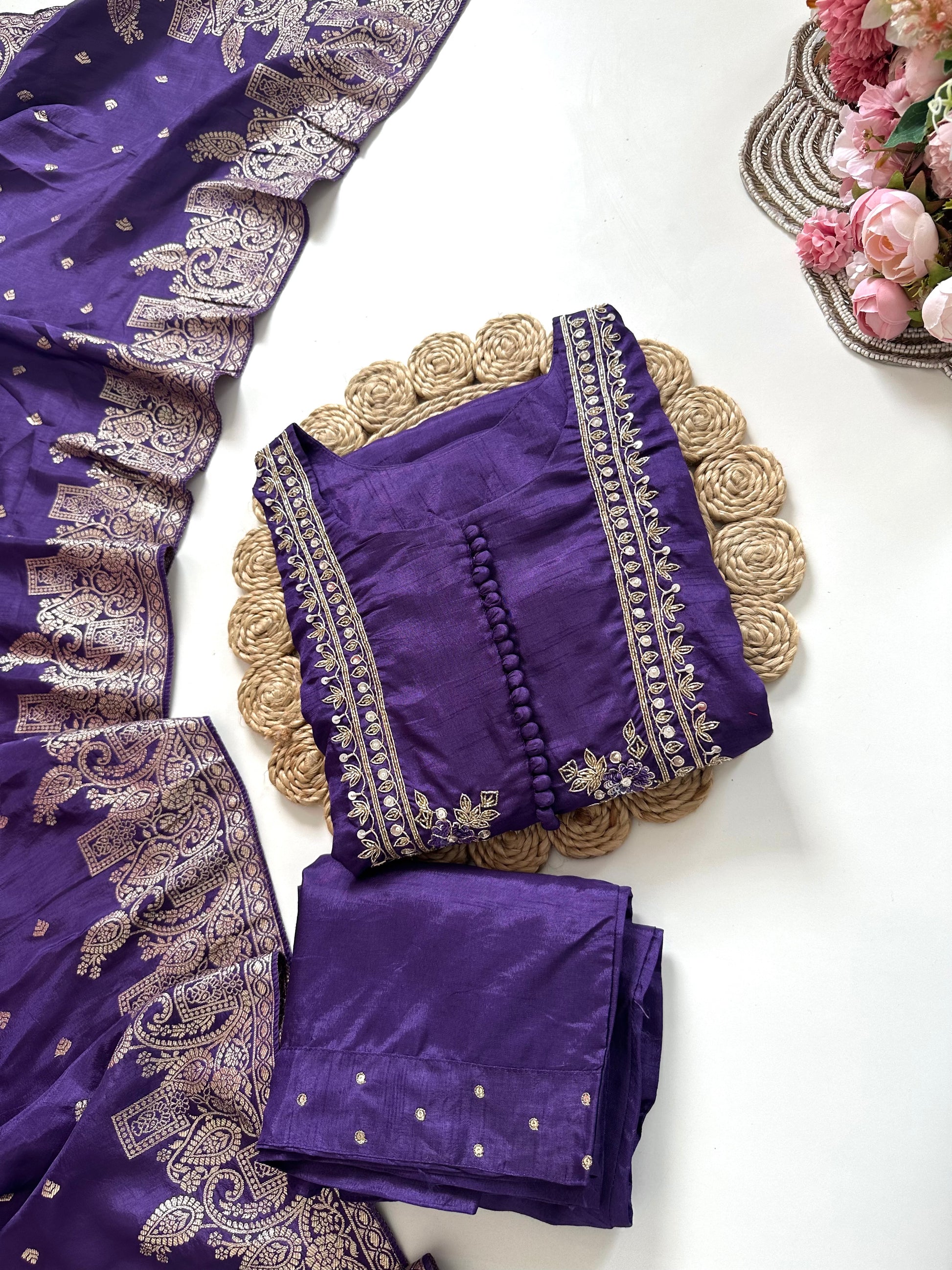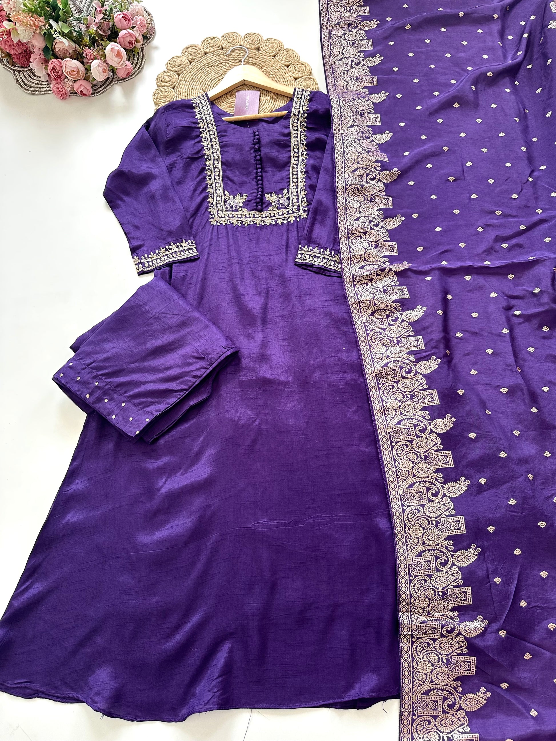 Expertly crafted from luxurious Russian silk, this Aline Kurti features intricate Zari work for a touch of elegance. Paired with comfortable pants and a beautiful dupatta, this set is perfect for any occasion. Elevate your wardrobe with this timeless and stylish ensemble.