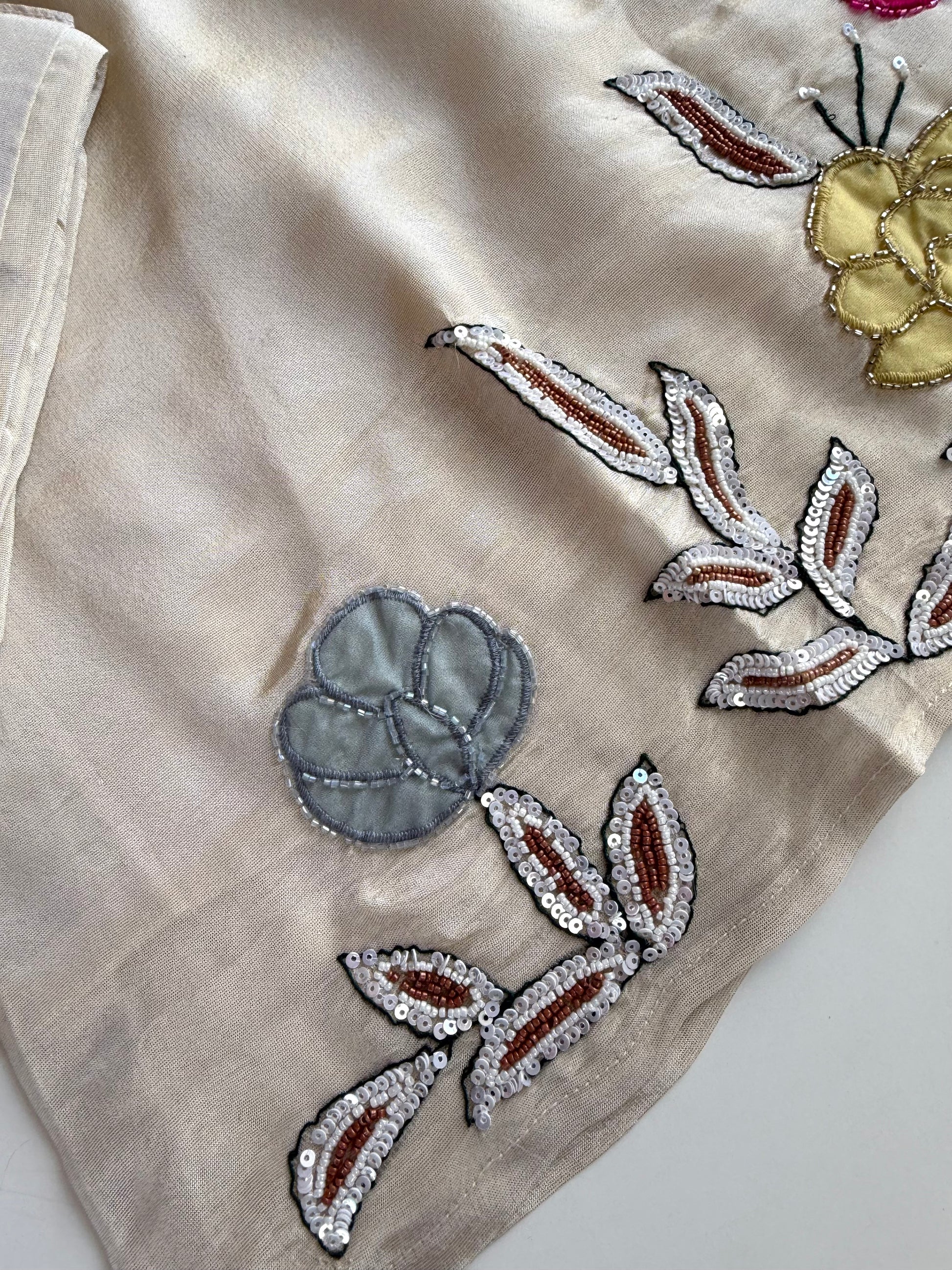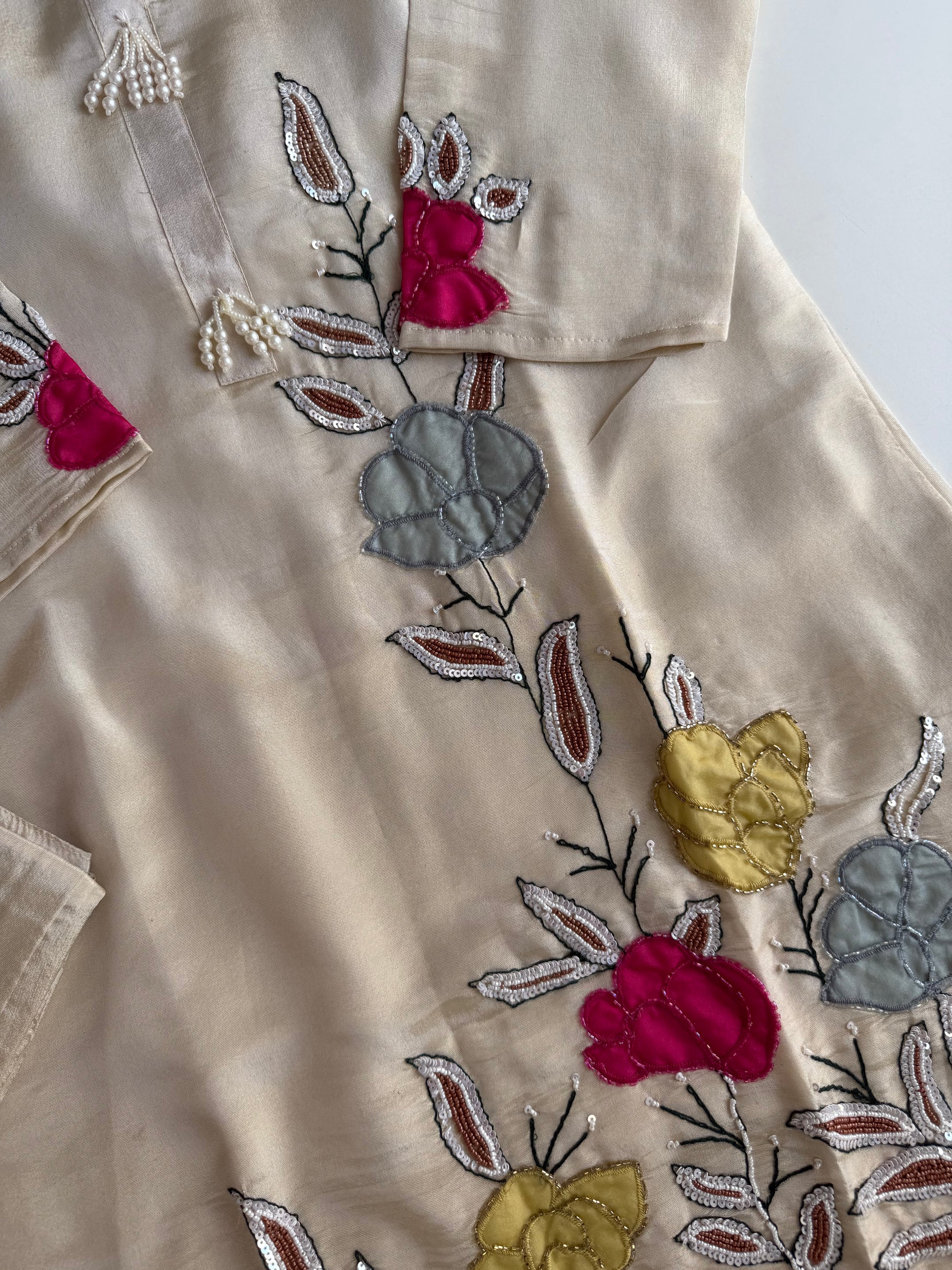 Elevate your style with our Tissue silk appliqué handwork coord set. This stunning set showcases intricate handwork and delicate tissue silk appliqué for a luxurious touch. Perfect for any occasion, this set exudes elegance and sophistication. Elevate your wardrobe with this statement piece.