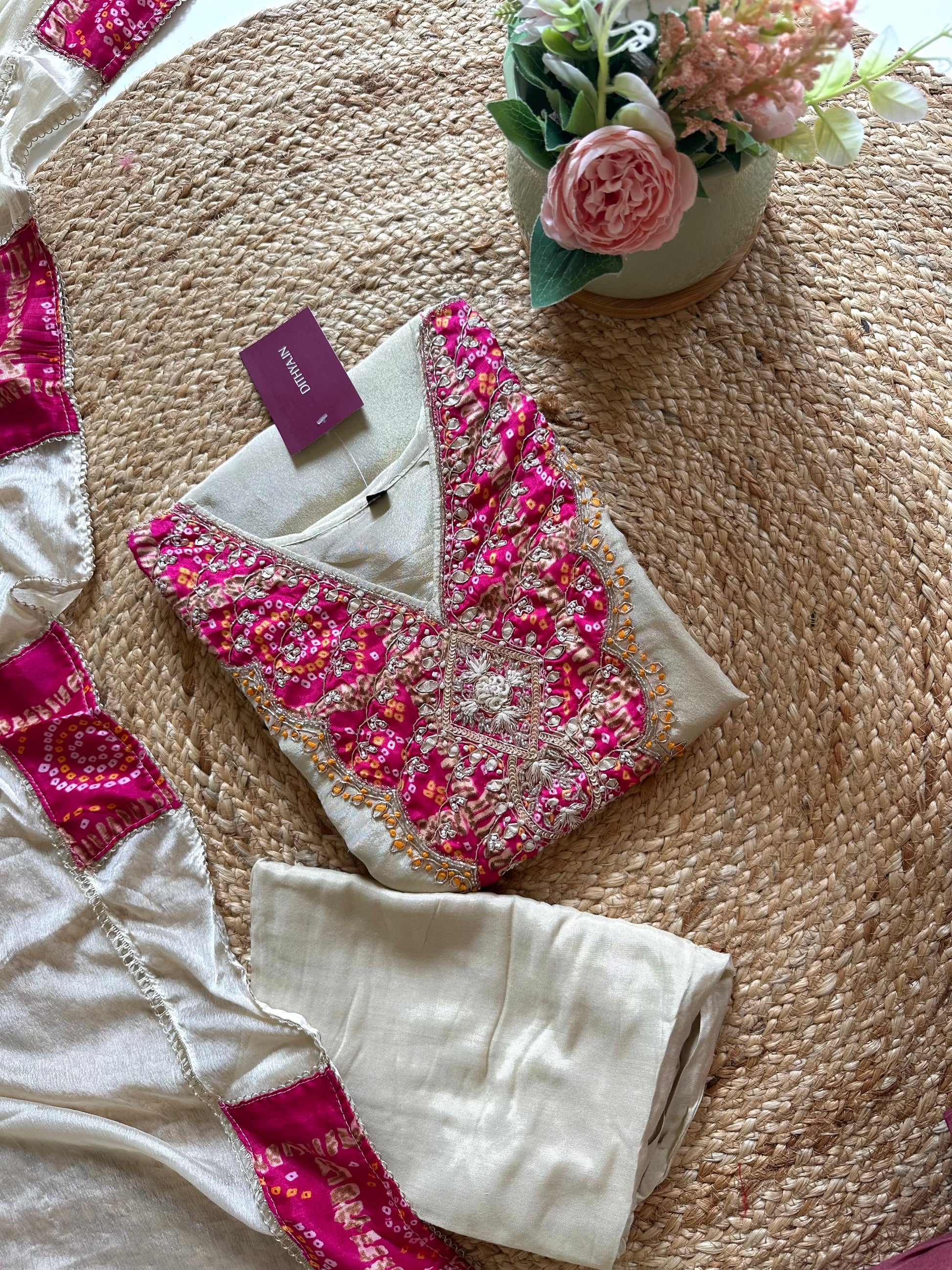 K047 - Tissue silk Bandhini Print straight kurti with parallel pants and dupatta