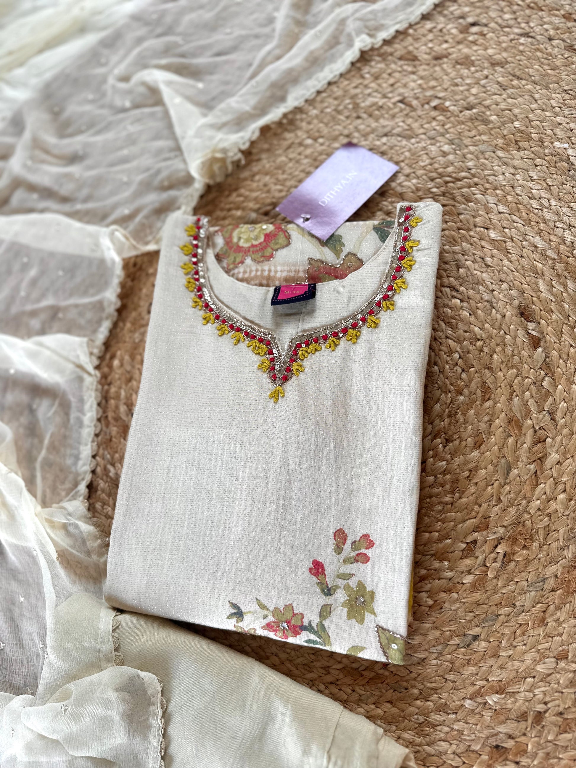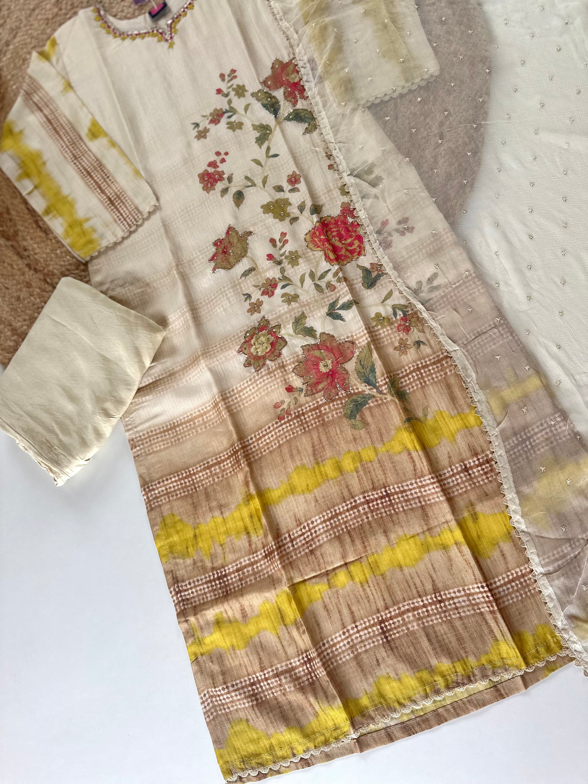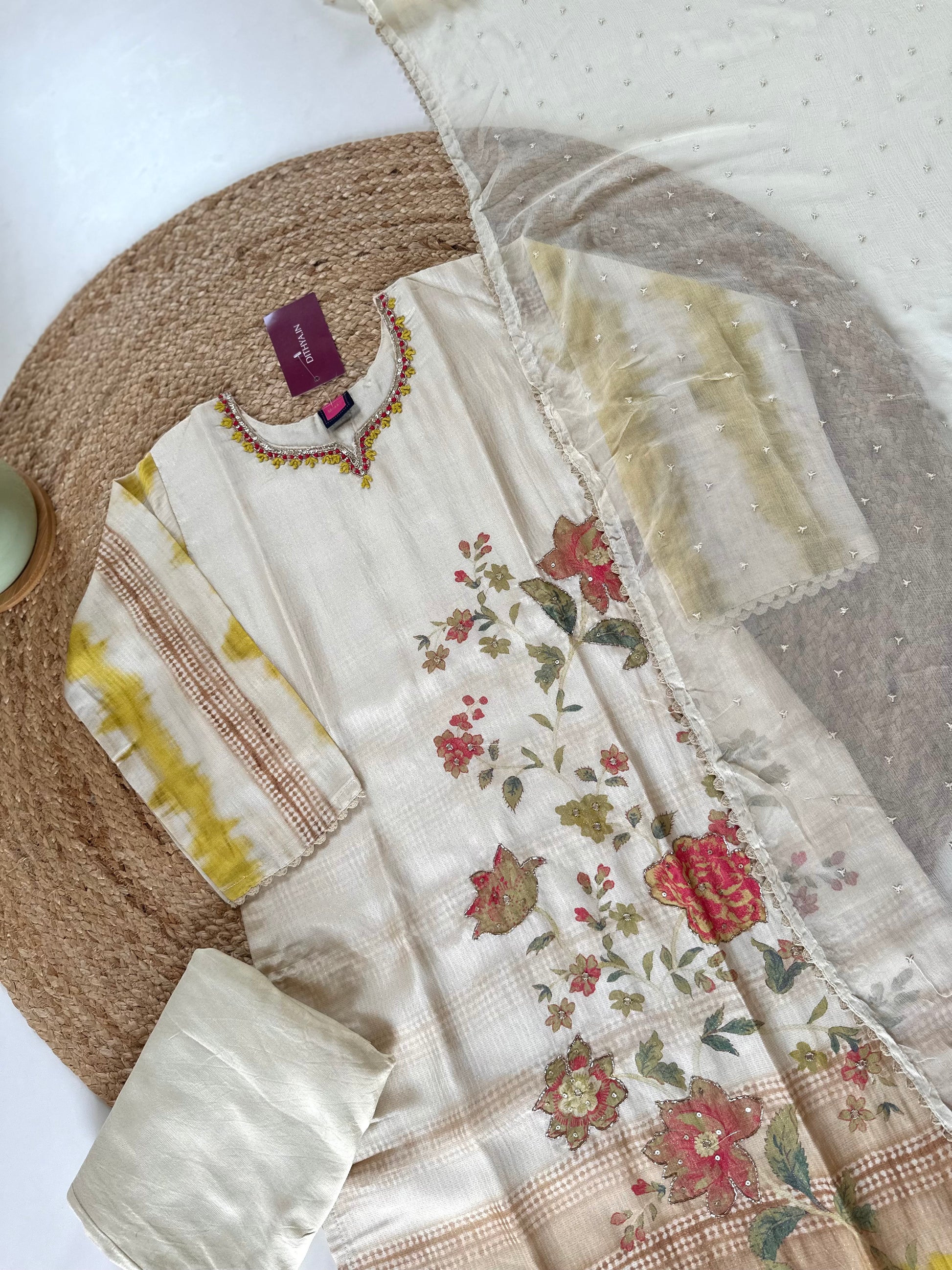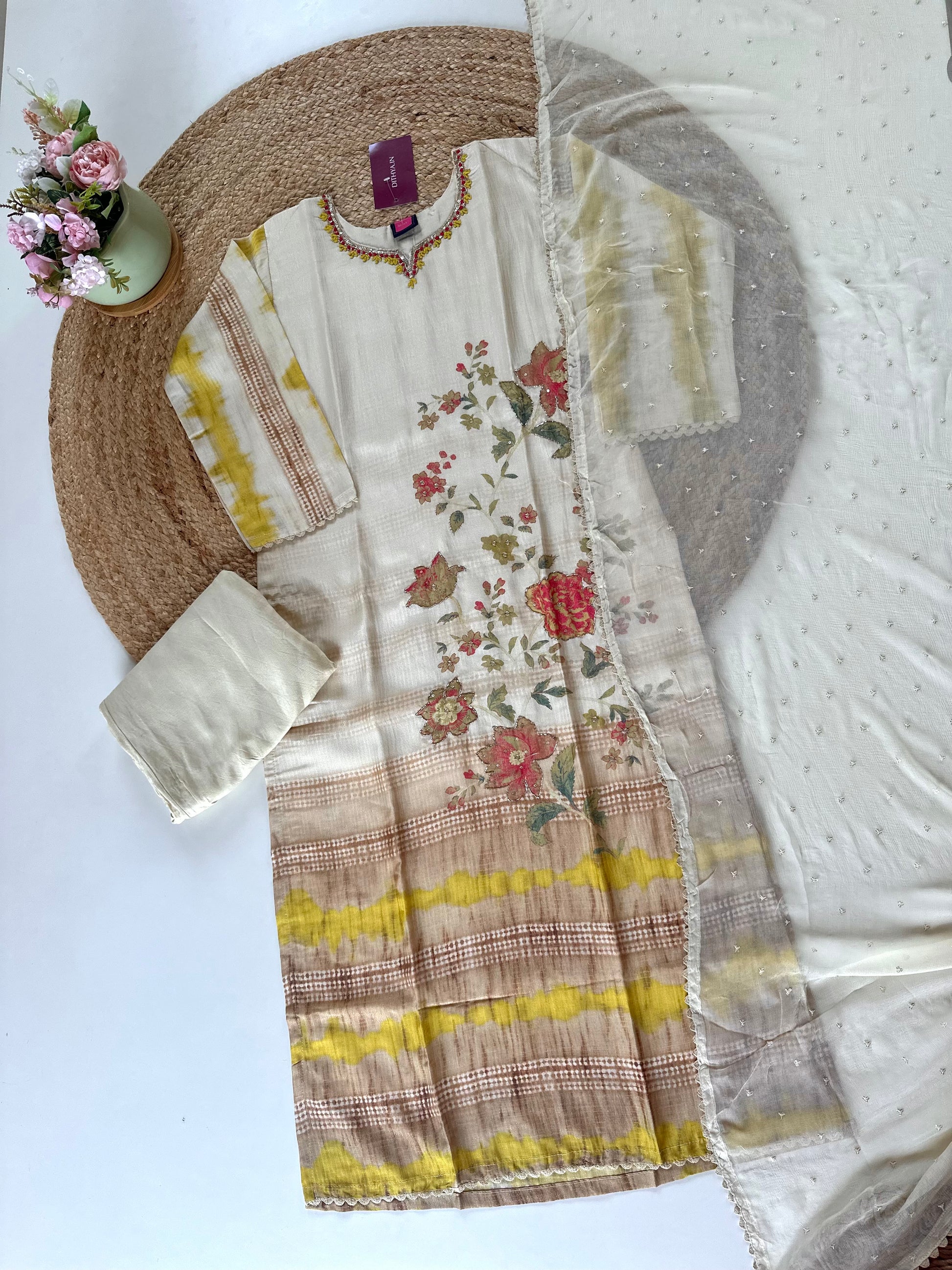 K315 - Tissue silk floral straight kurti with pants and chiffon dupatta