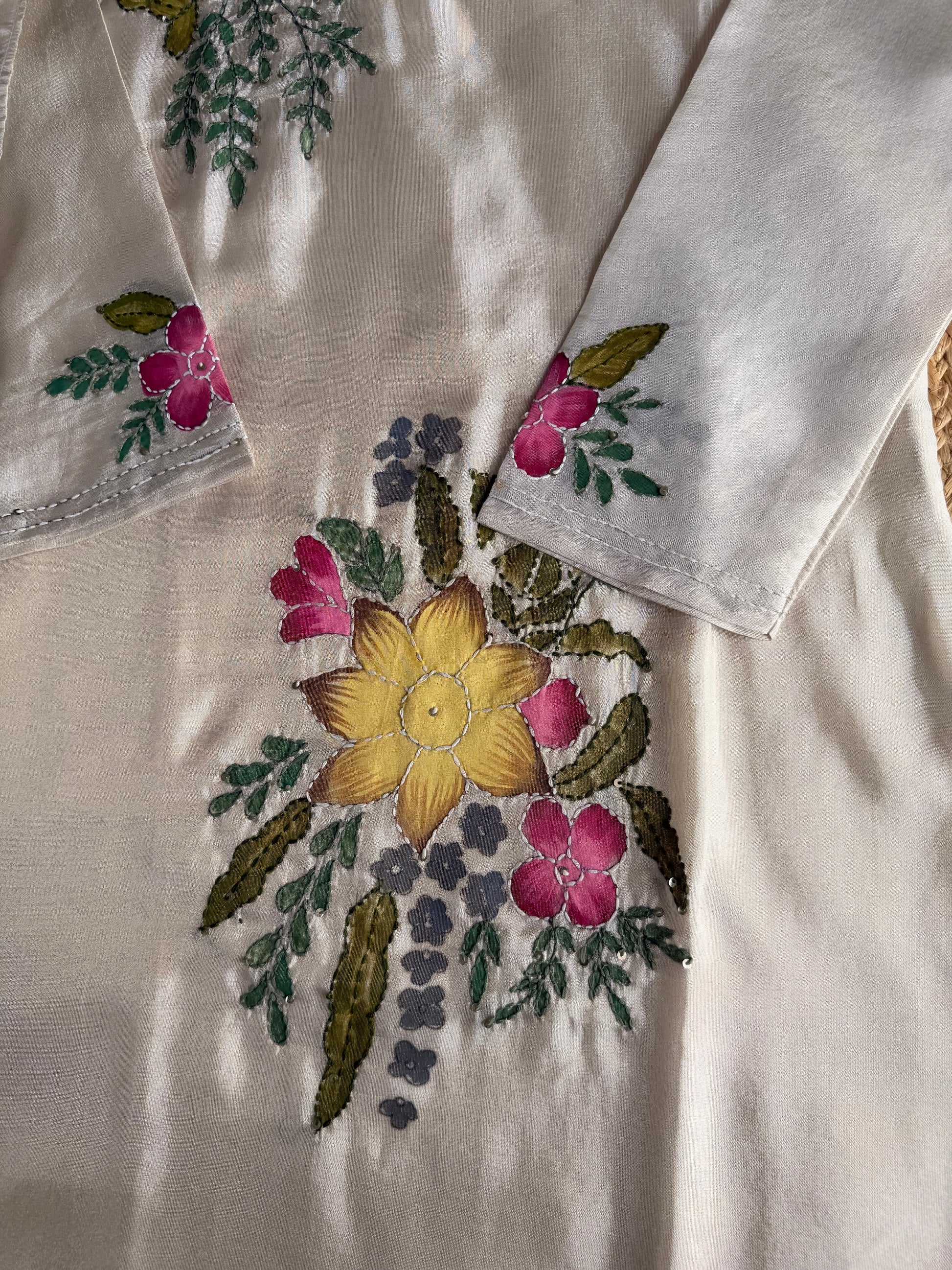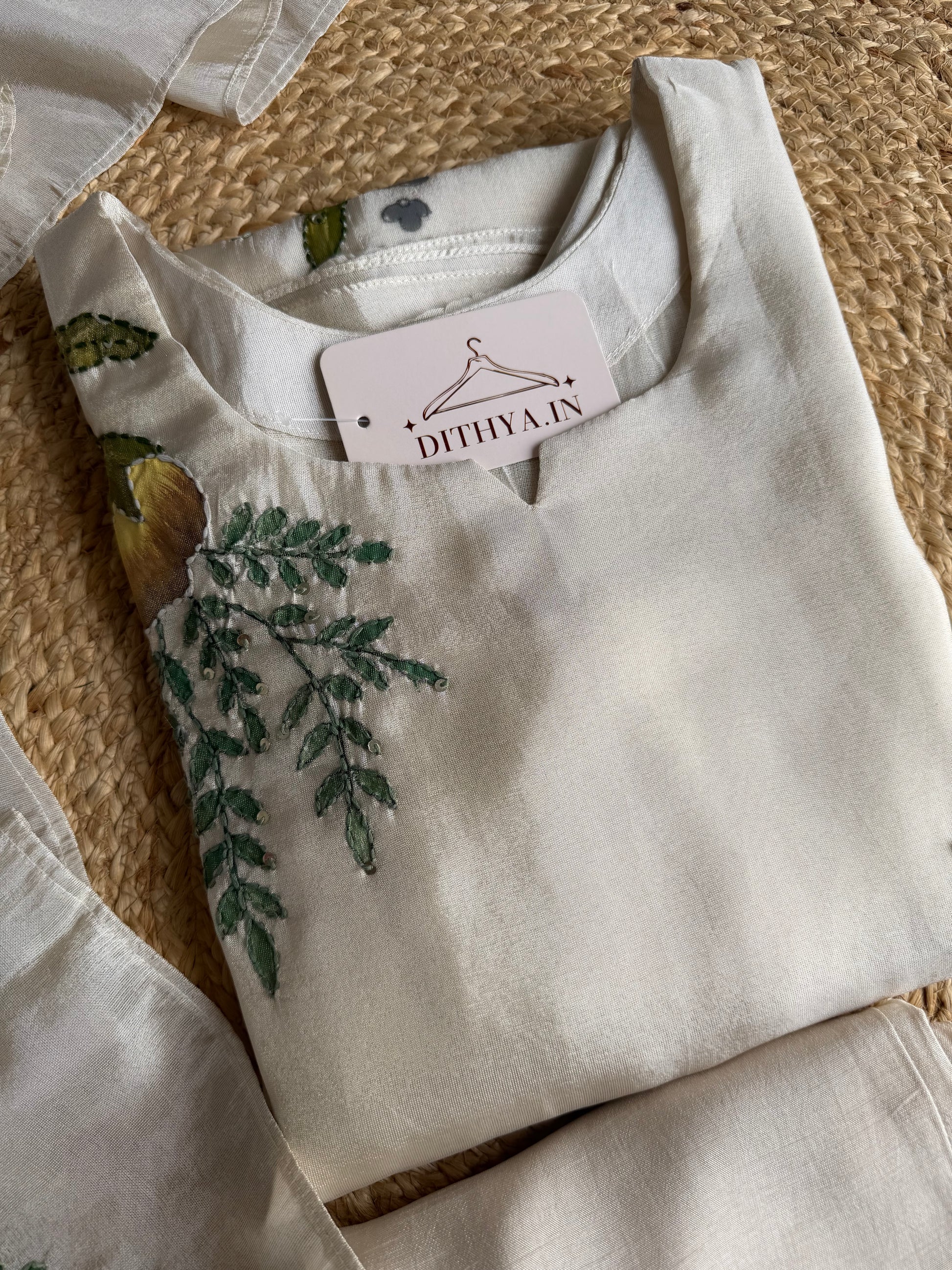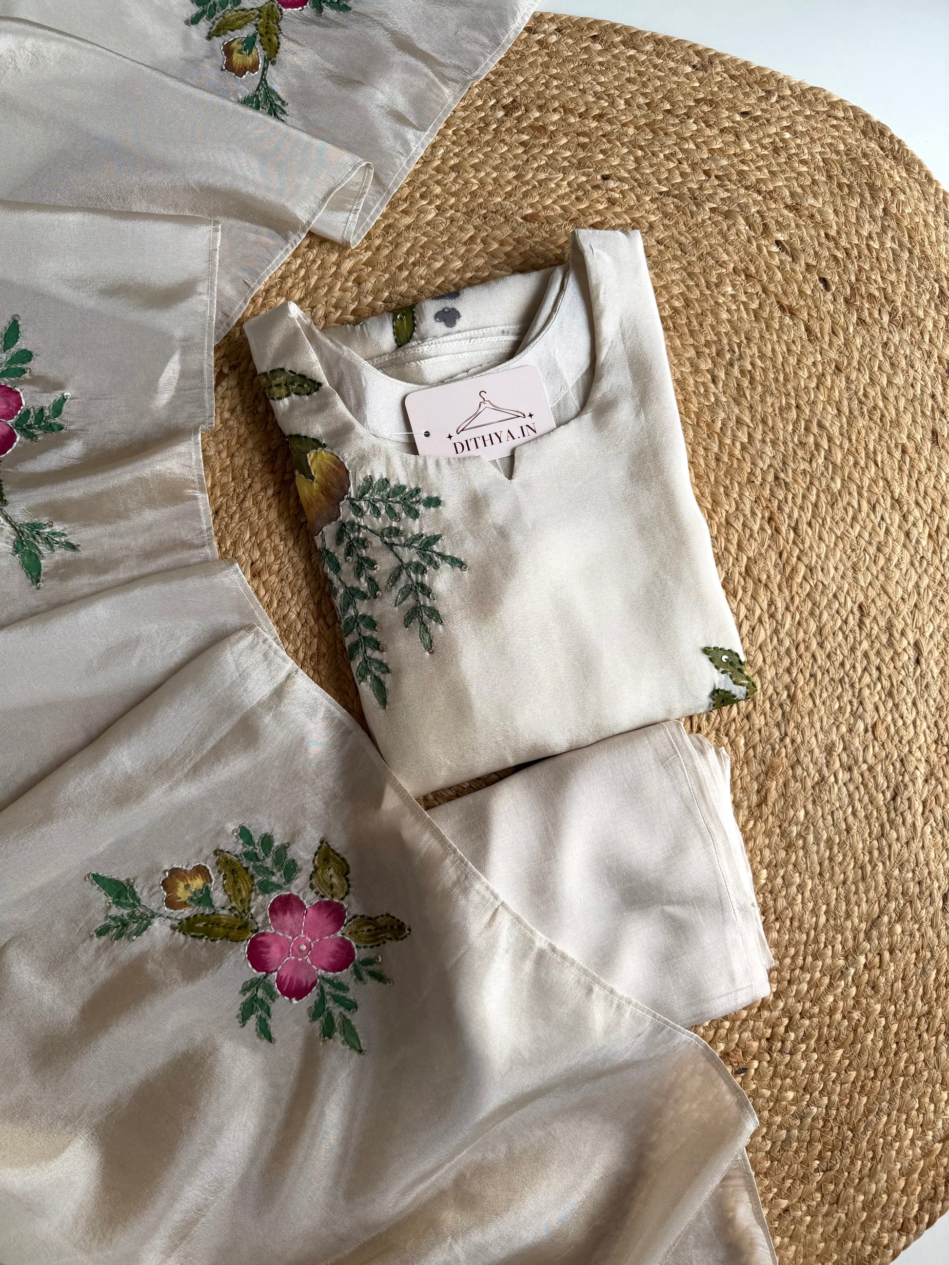 K543 - Tissue silk handwork Aline Kurti with pants and dupatta
