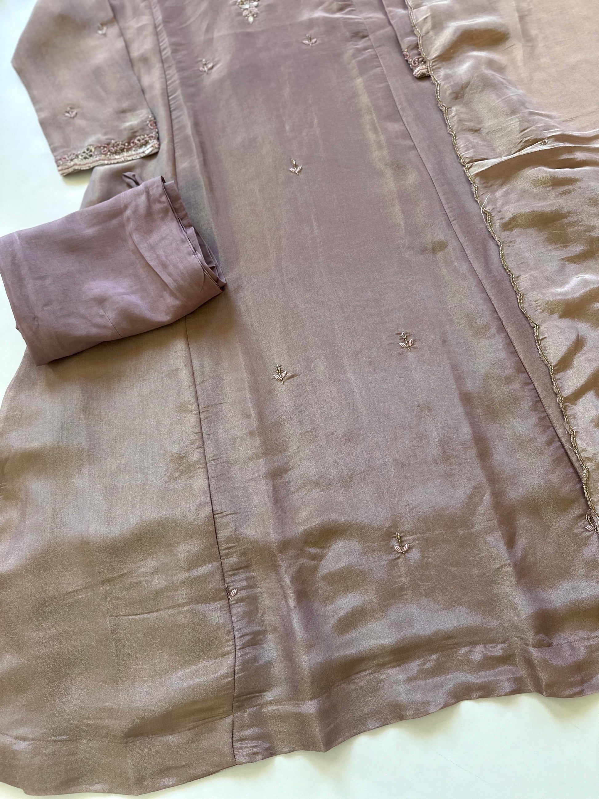 Expertly crafted from luxurious tissue silk, the Anarkali ensemble boasts delicate handwork details on the anarkali, pants, and dupatta. Elevate any occasion with this stunning and versatile set.