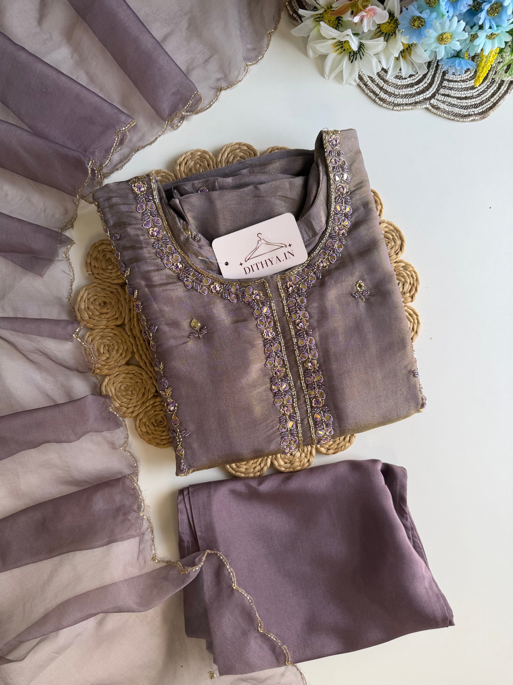 Elevate your ethnic wardrobe with this exquisite tissue silk Anarkali ensemble. Crafted with meticulous handwork detailing, this three-piece set features a gracefully flowing Anarkali kurta paired with coordinating pants and a delicate dupatta. The lightweight tissue silk fabric drapes beautifully while maintaining its structure, making it ideal for festive occasions, celebrations, and formal gatherings. The intricate hand embellishments showcase traditional craftsmanship, adding timeless elegance to your collection. Perfect for those who appreciate refined artistry and authentic Indian fashion.