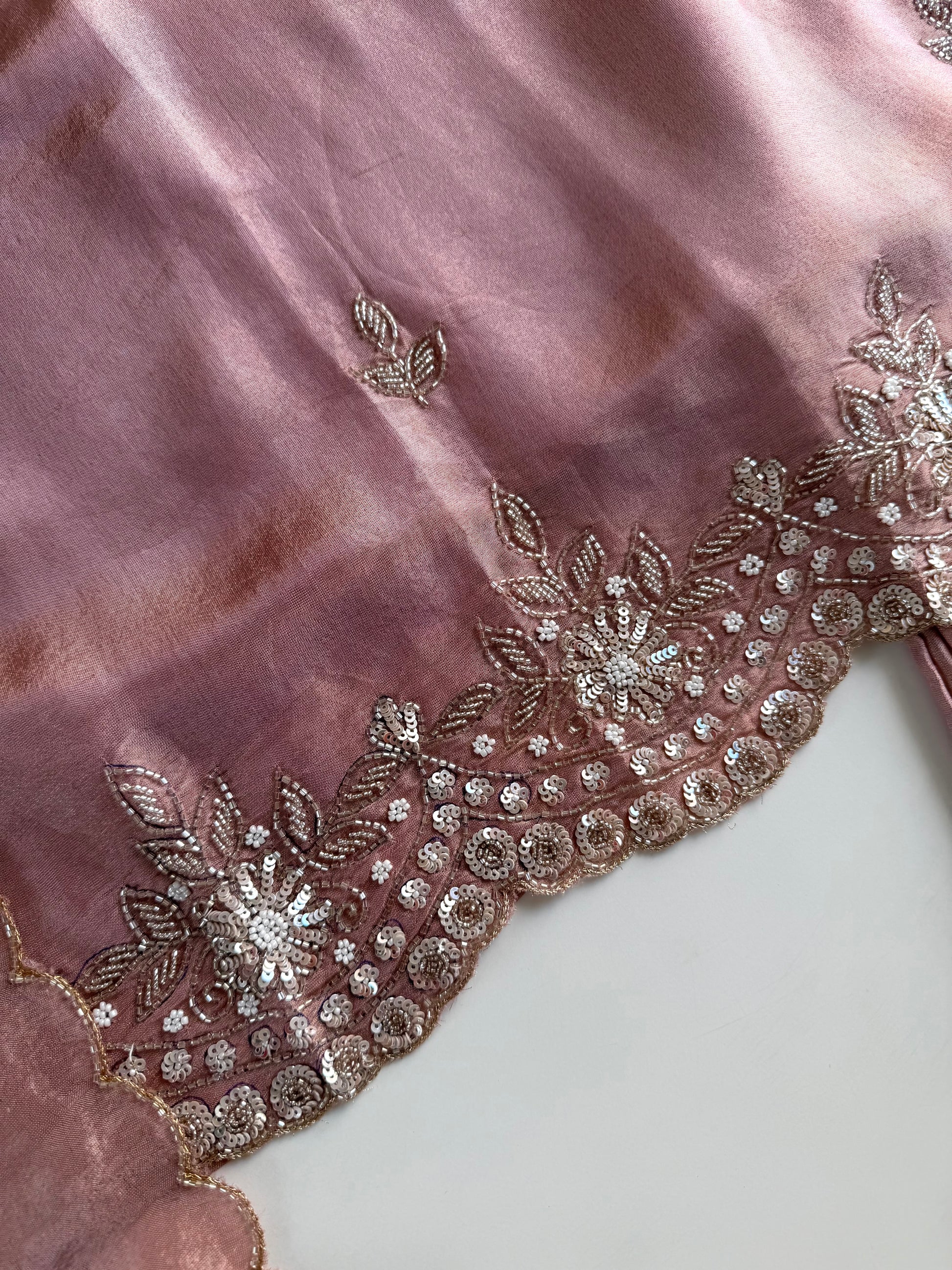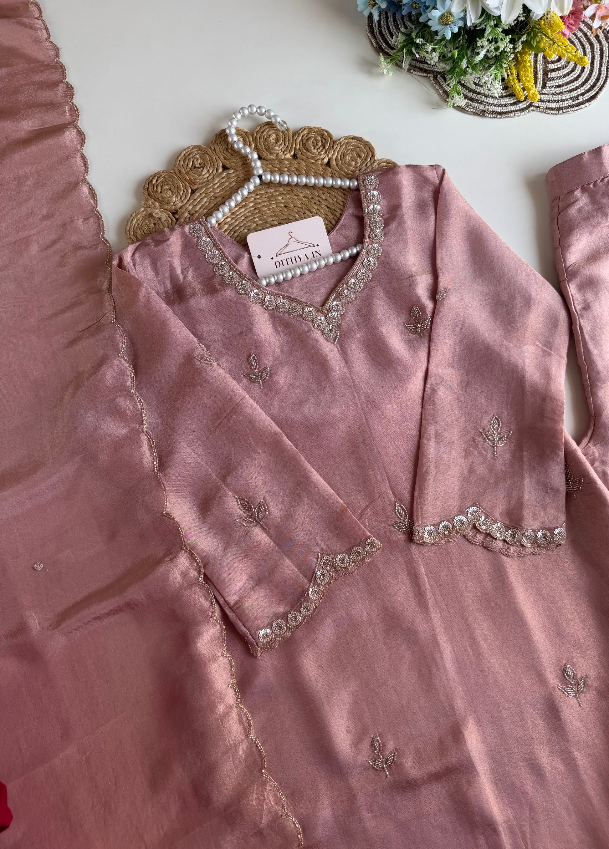 K203 - Tissue silk handwork short Kurti with divider pants and dupatta