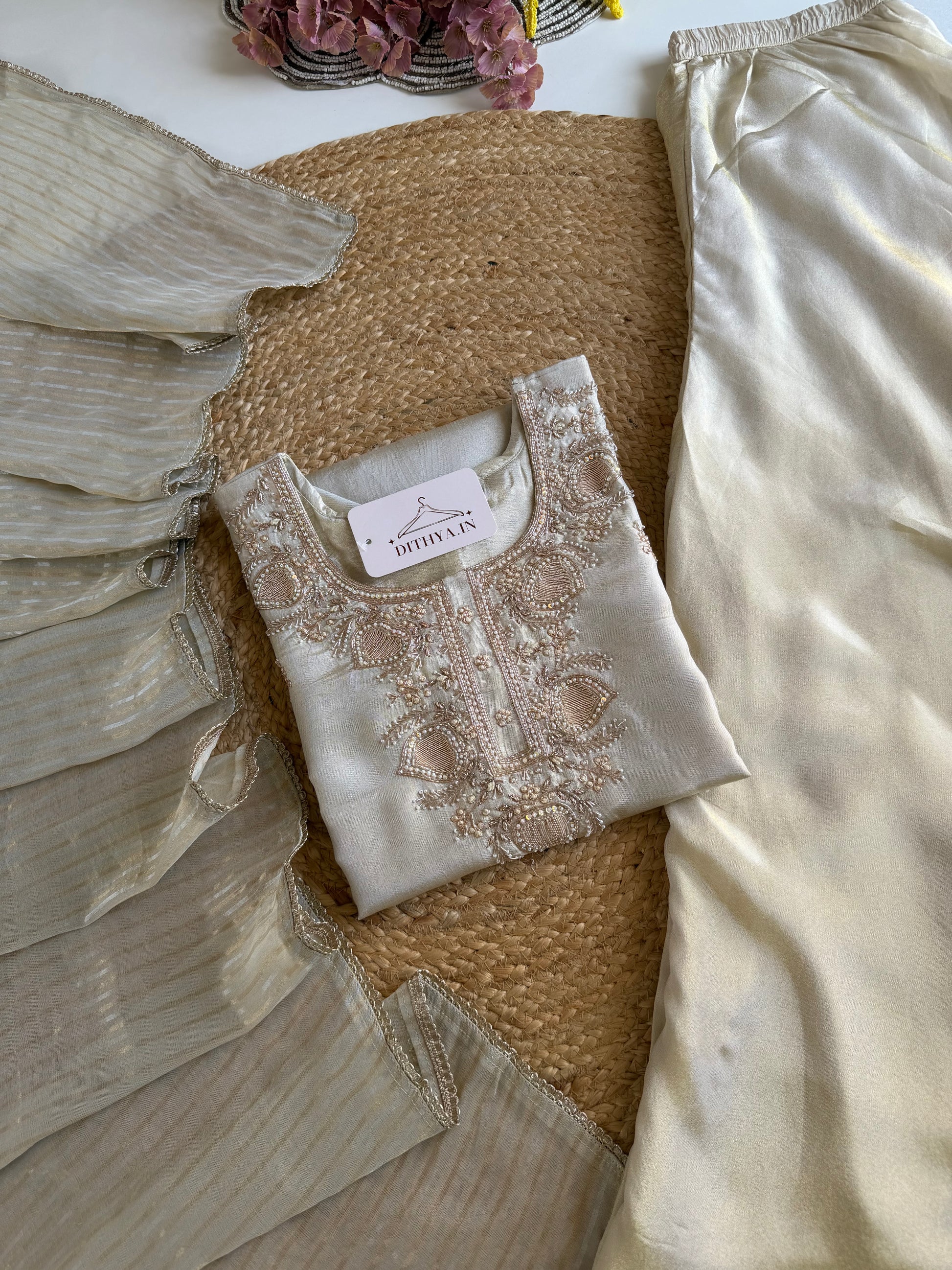 K157 - Tissue silk handwork short Kurti with divider pants and dupatta