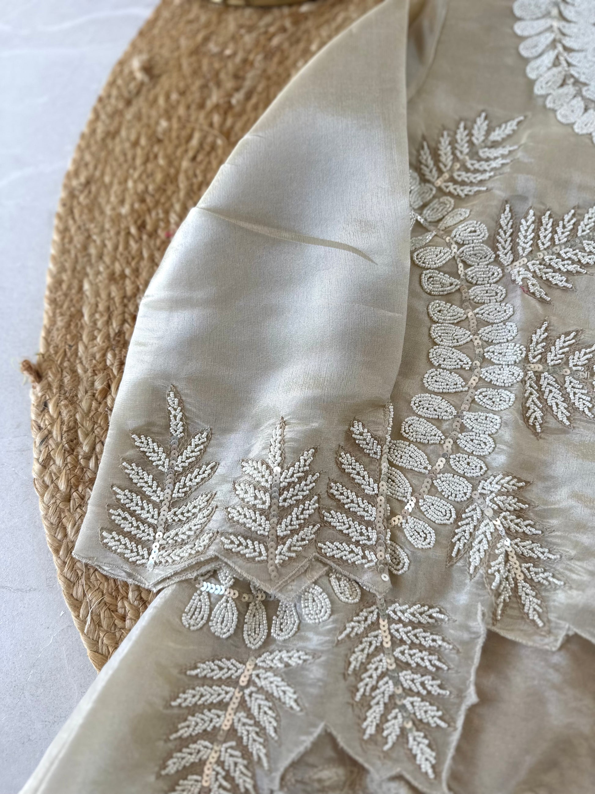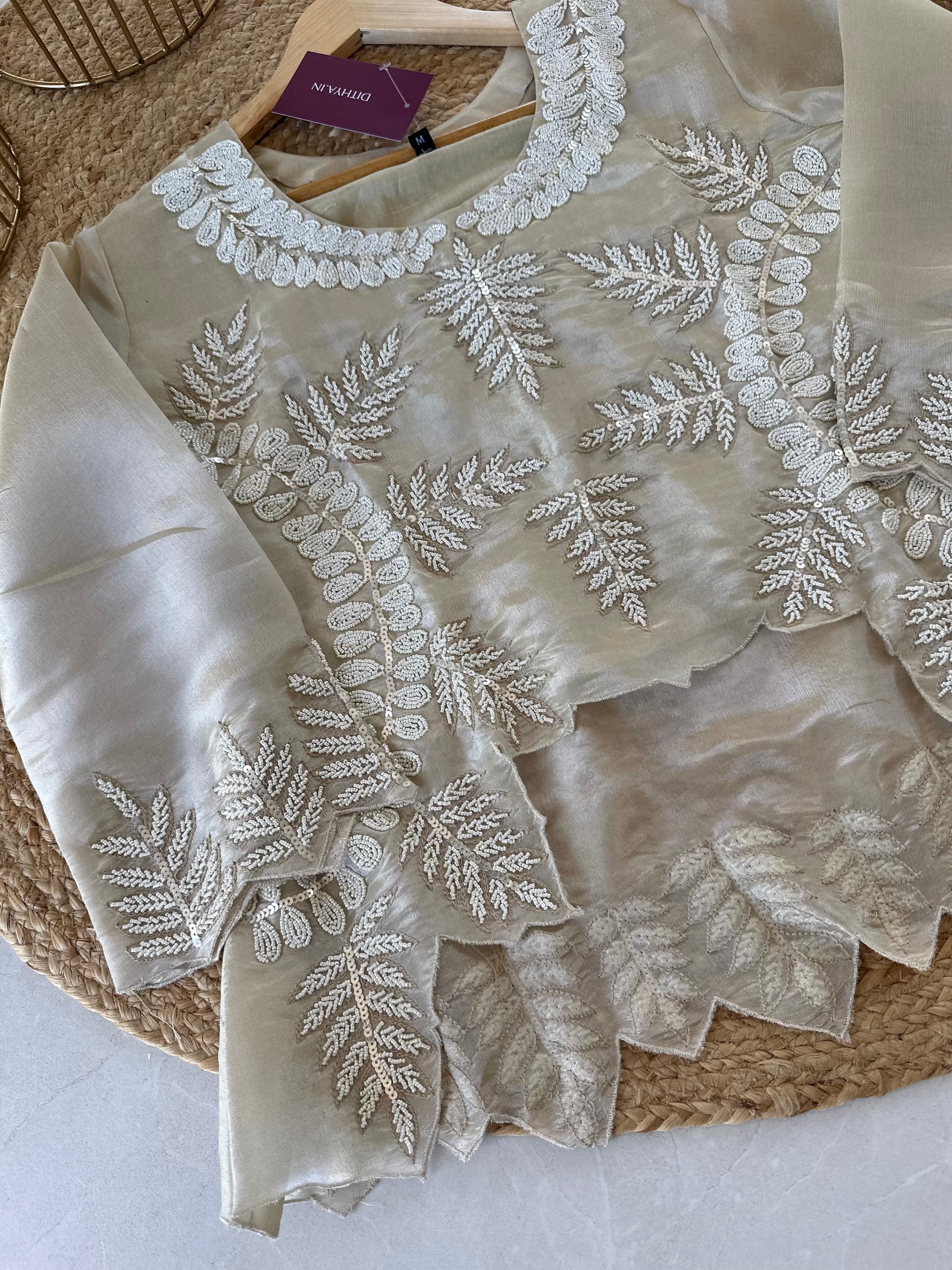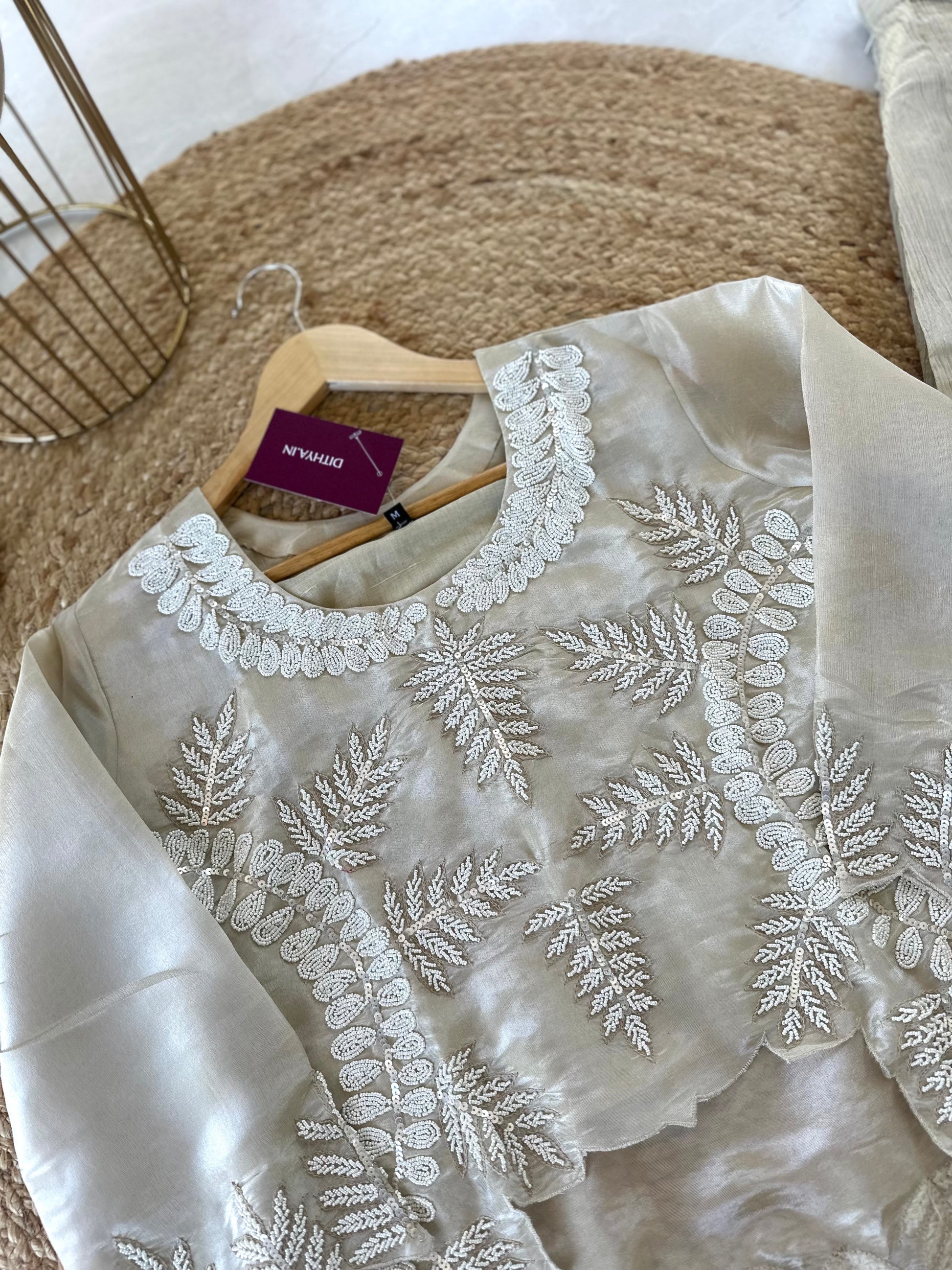 This K045 set is perfect for those looking for a combination of comfort and style. Made with luxurious tissue silk and intricate handiwork, the short top and palazzo provide a breezy feel while maintaining an elegant look. Elevate your wardrobe with this versatile and sophisticated ensemble.