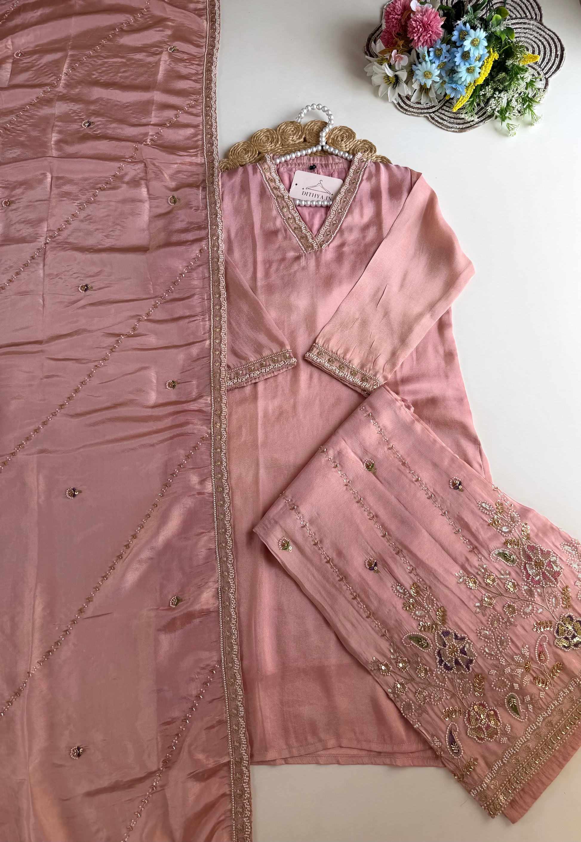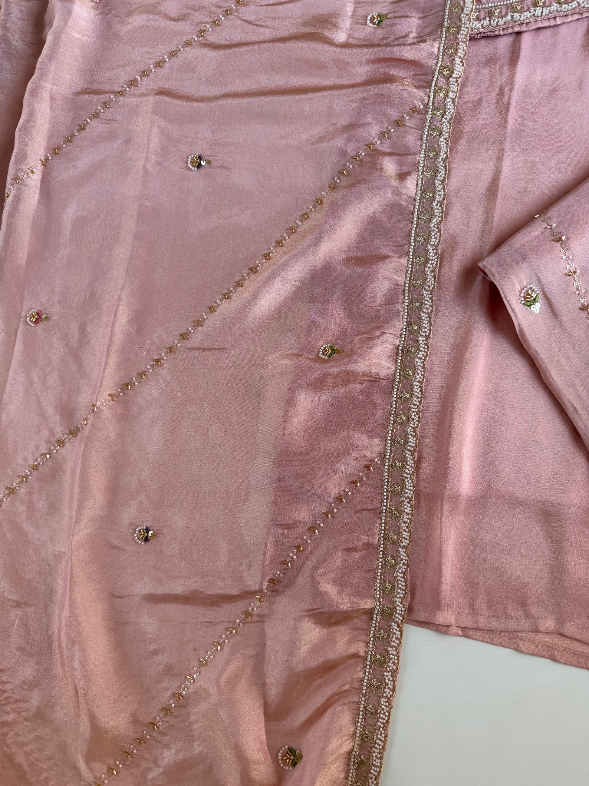 K627 - Tissue silk handwork straight Kurti with pants and dupatta