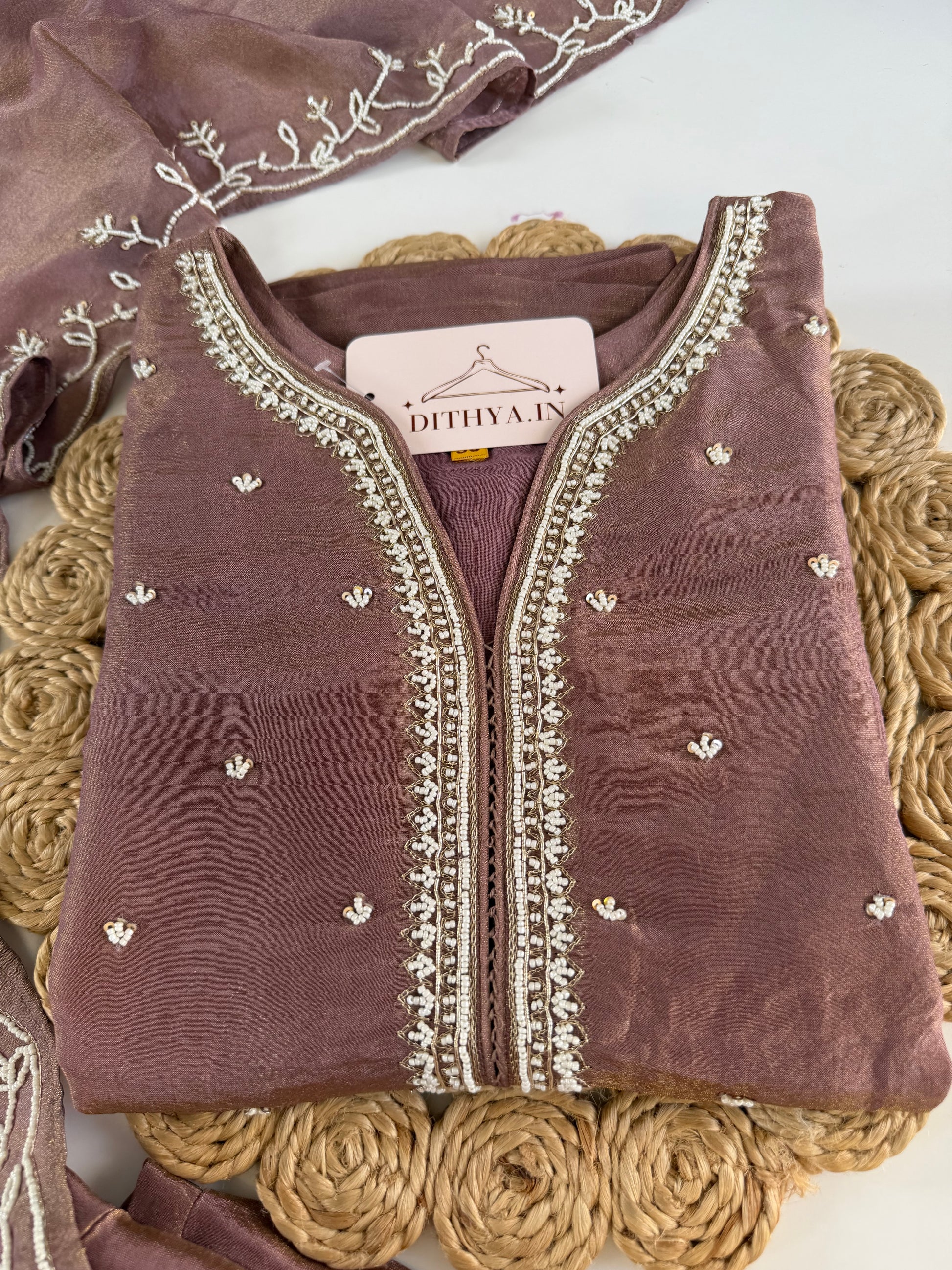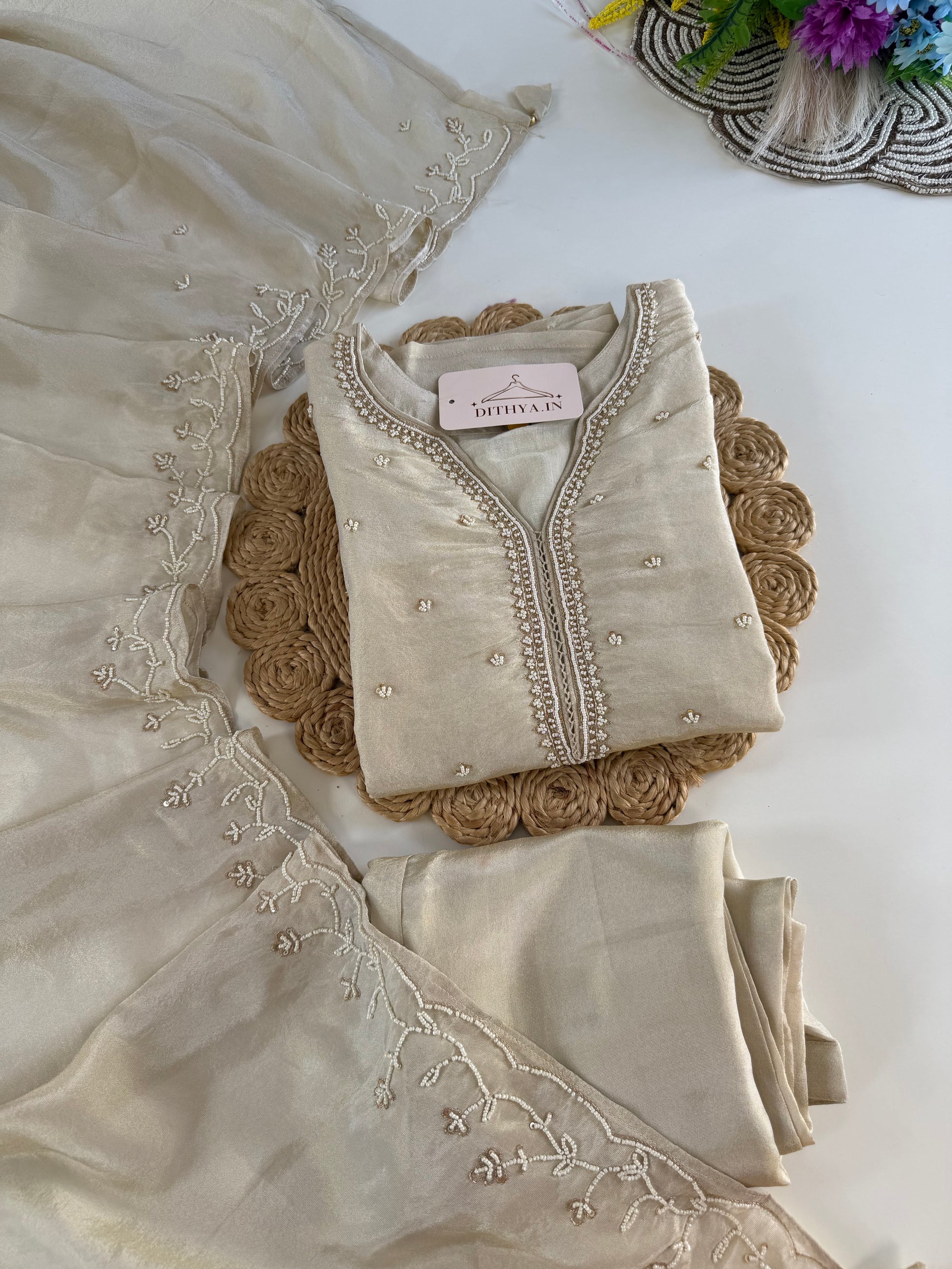 Elevate your ethnic wardrobe with this exquisite tissue silk ensemble featuring intricate pearl embroidery. The straight-cut kurti showcases delicate pearl work that catches light beautifully, paired with comfortable matching pants for effortless elegance. The coordinating dupatta adds versatility to your styling options. Available in two sophisticated color combinations, this three-piece set seamlessly transitions from festive occasions to everyday wear. Crafted from premium tissue silk, the fabric drapes gracefully while maintaining its structure, ensuring you look polished throughout the day. Perfect for celebrations, family gatherings, or when you want to make a refined statement.