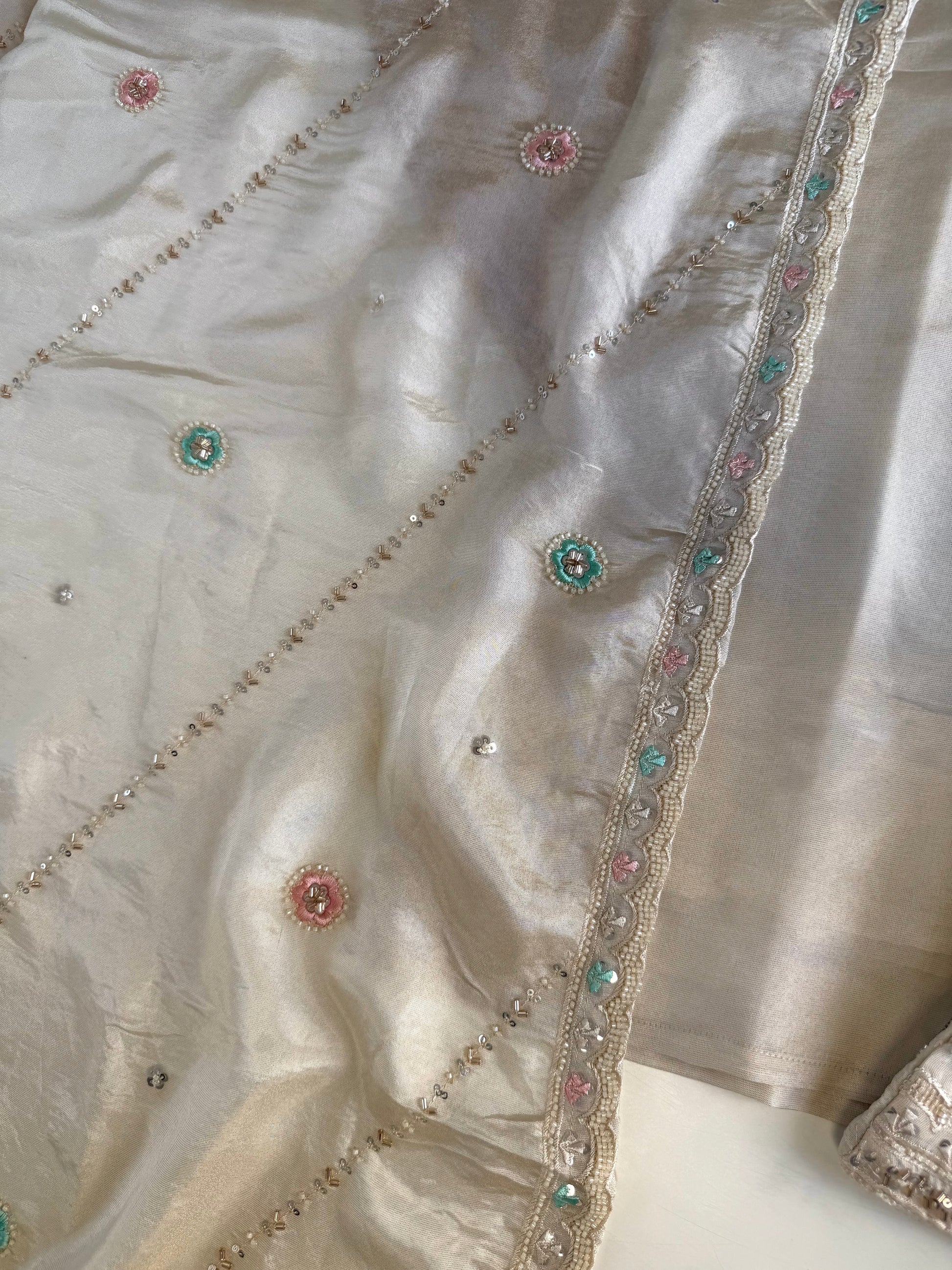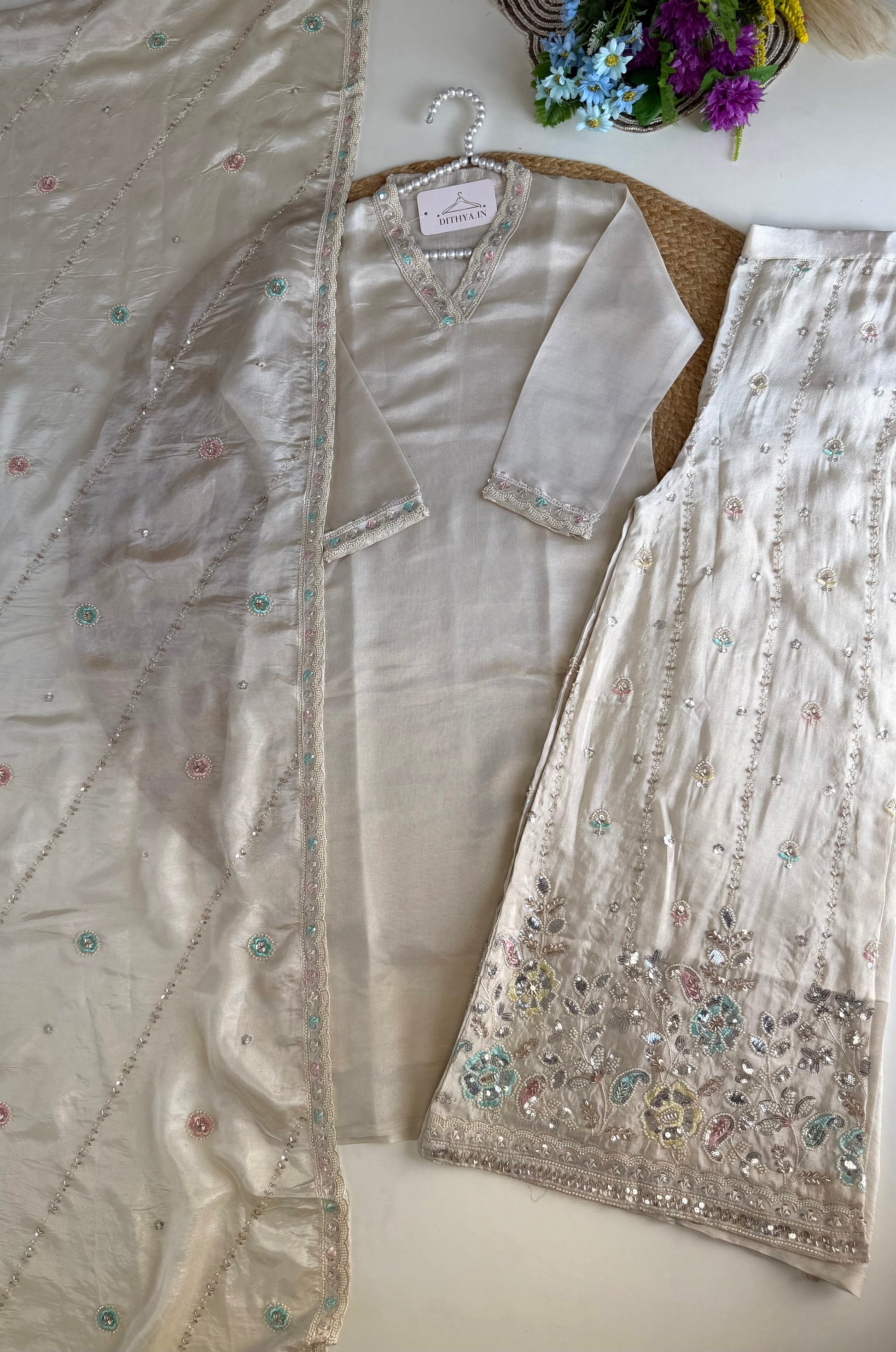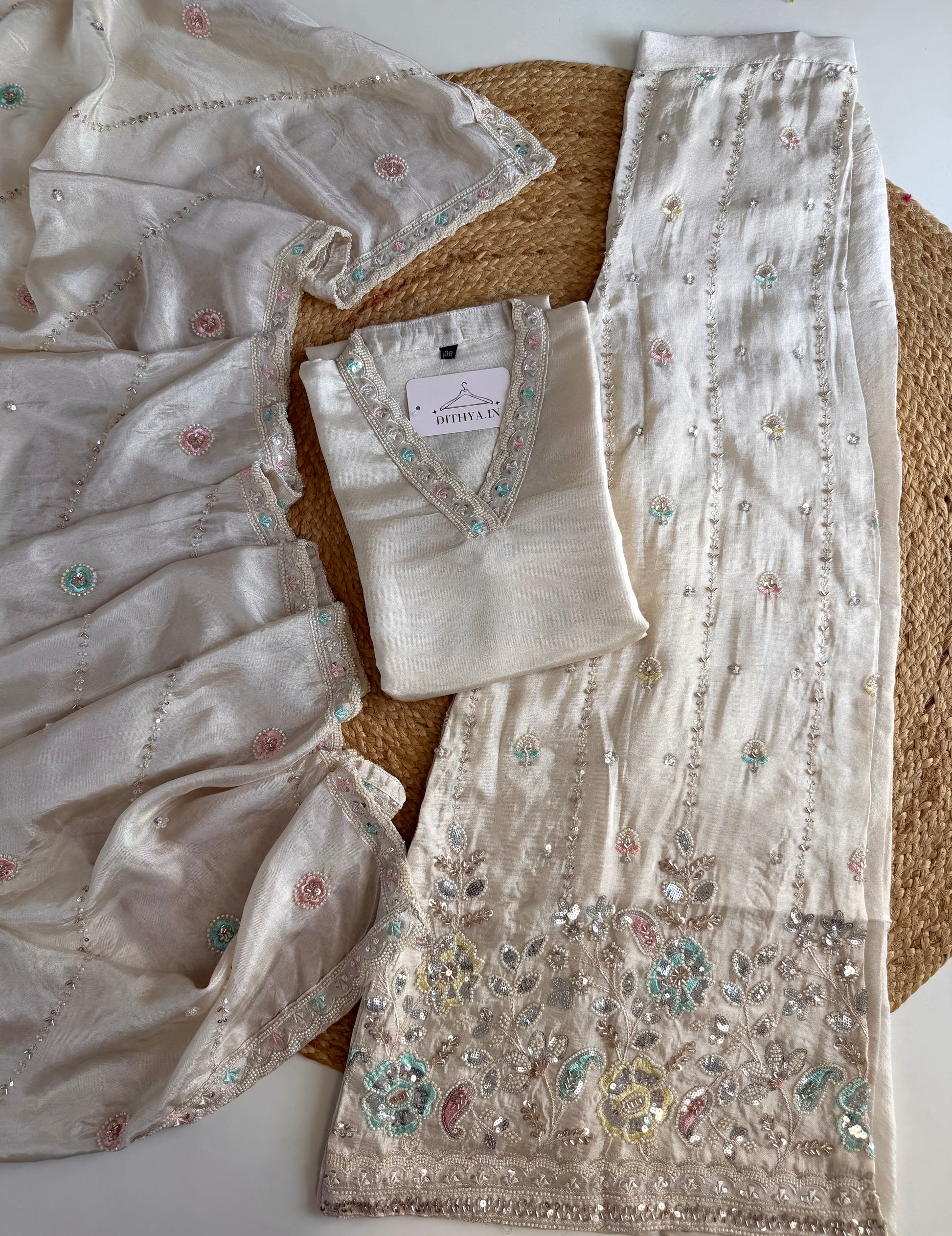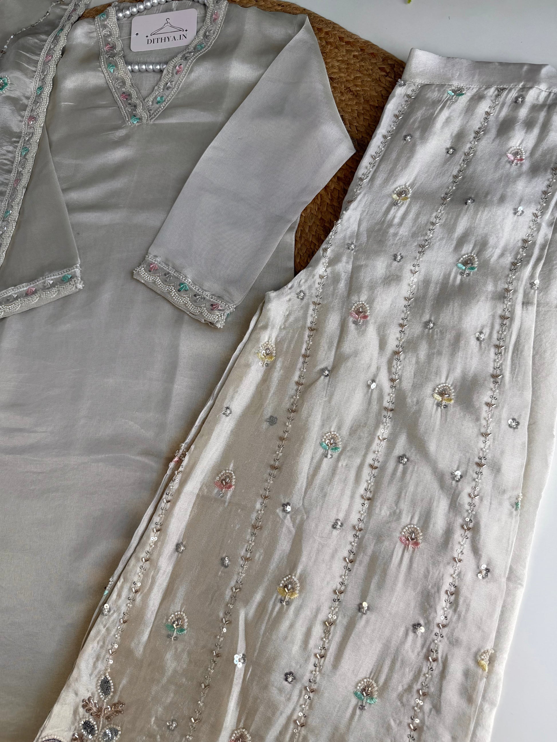 Crafted from luxurious tissue silk, this straight Kurti is sure to elevate your style. Accompanied by a heavy palazzo and dupatta, this set offers a royal and elegant look. Perfect for special occasions or parties, you'll feel confident and sophisticated in this high-quality ensemble.