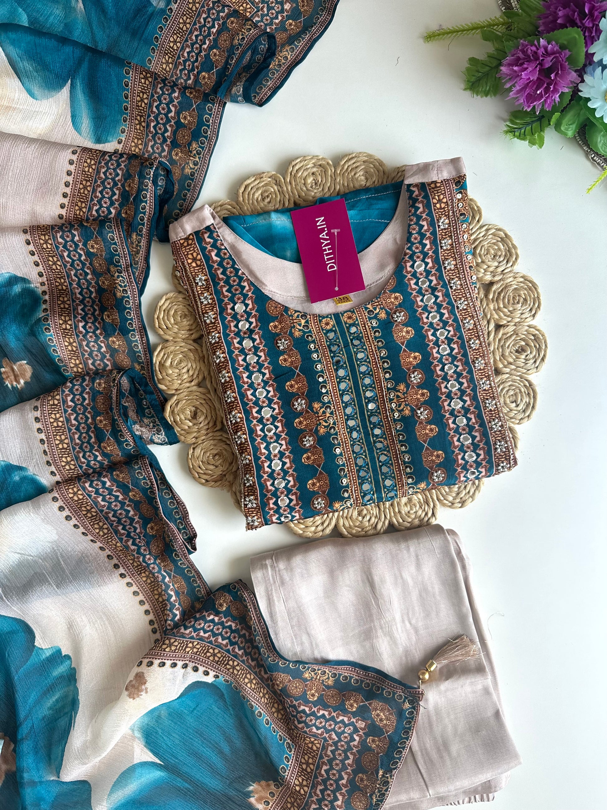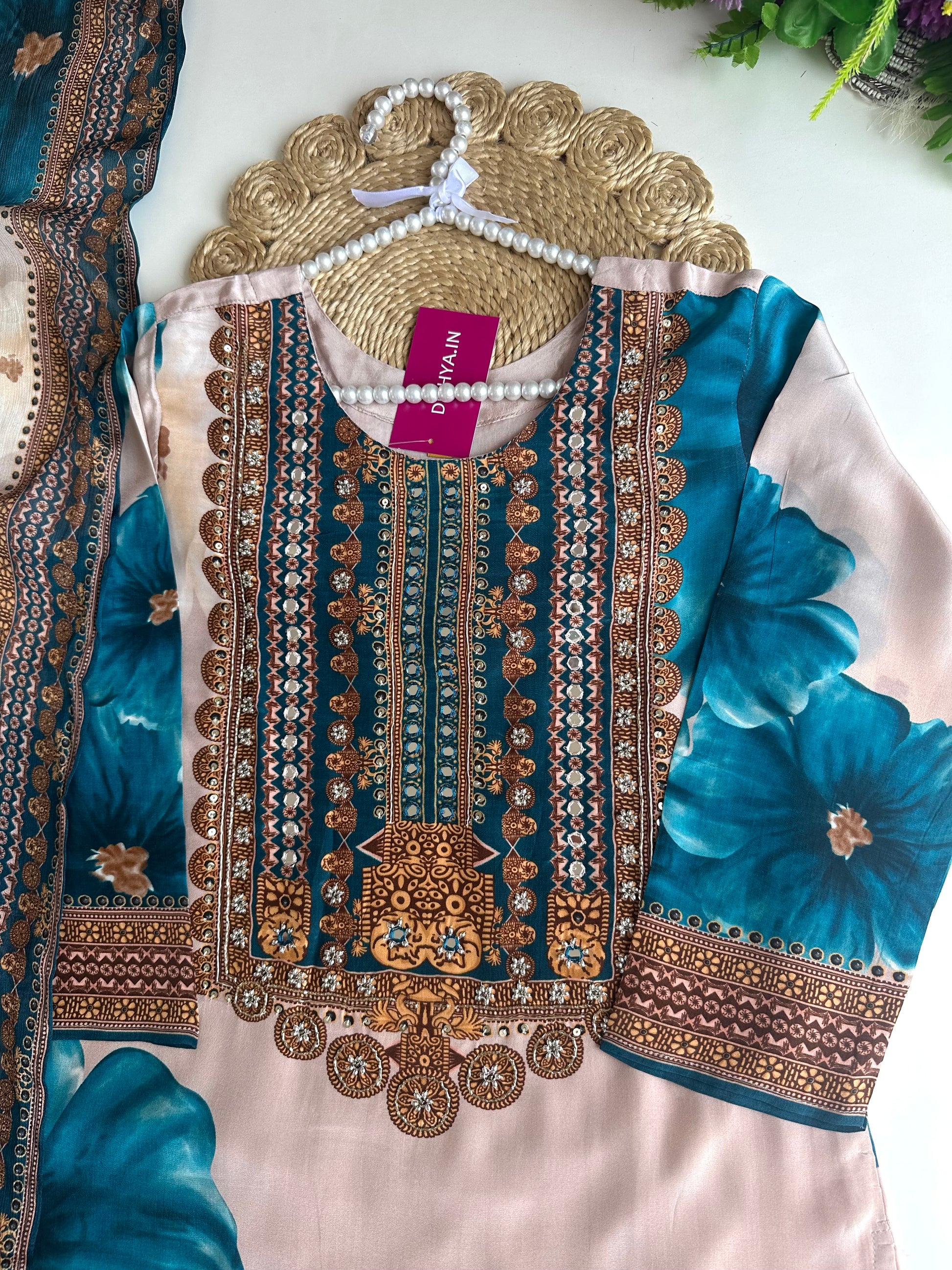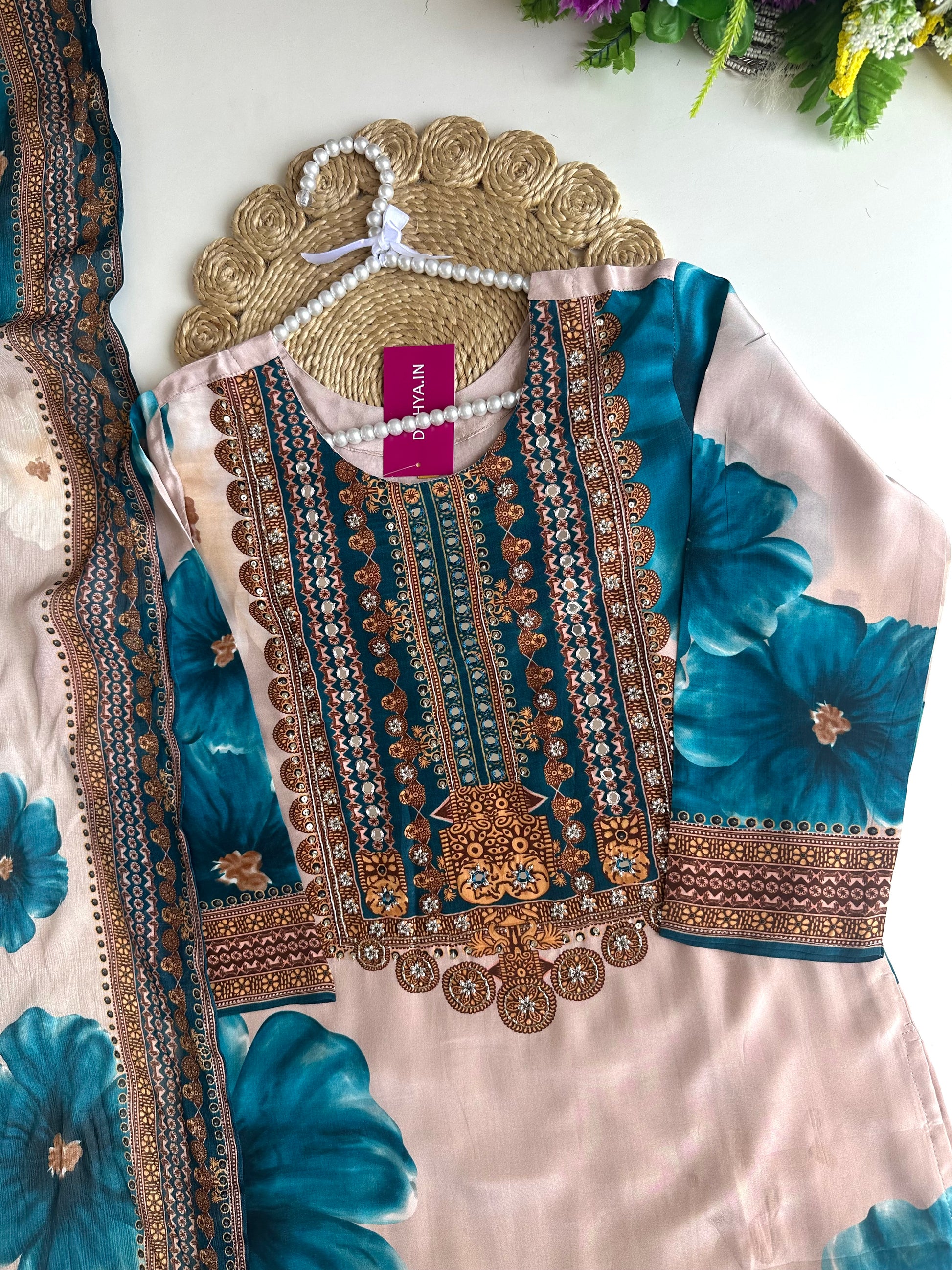 K037 - Pure crape floral handwork straight Kurti with pants and dupatta