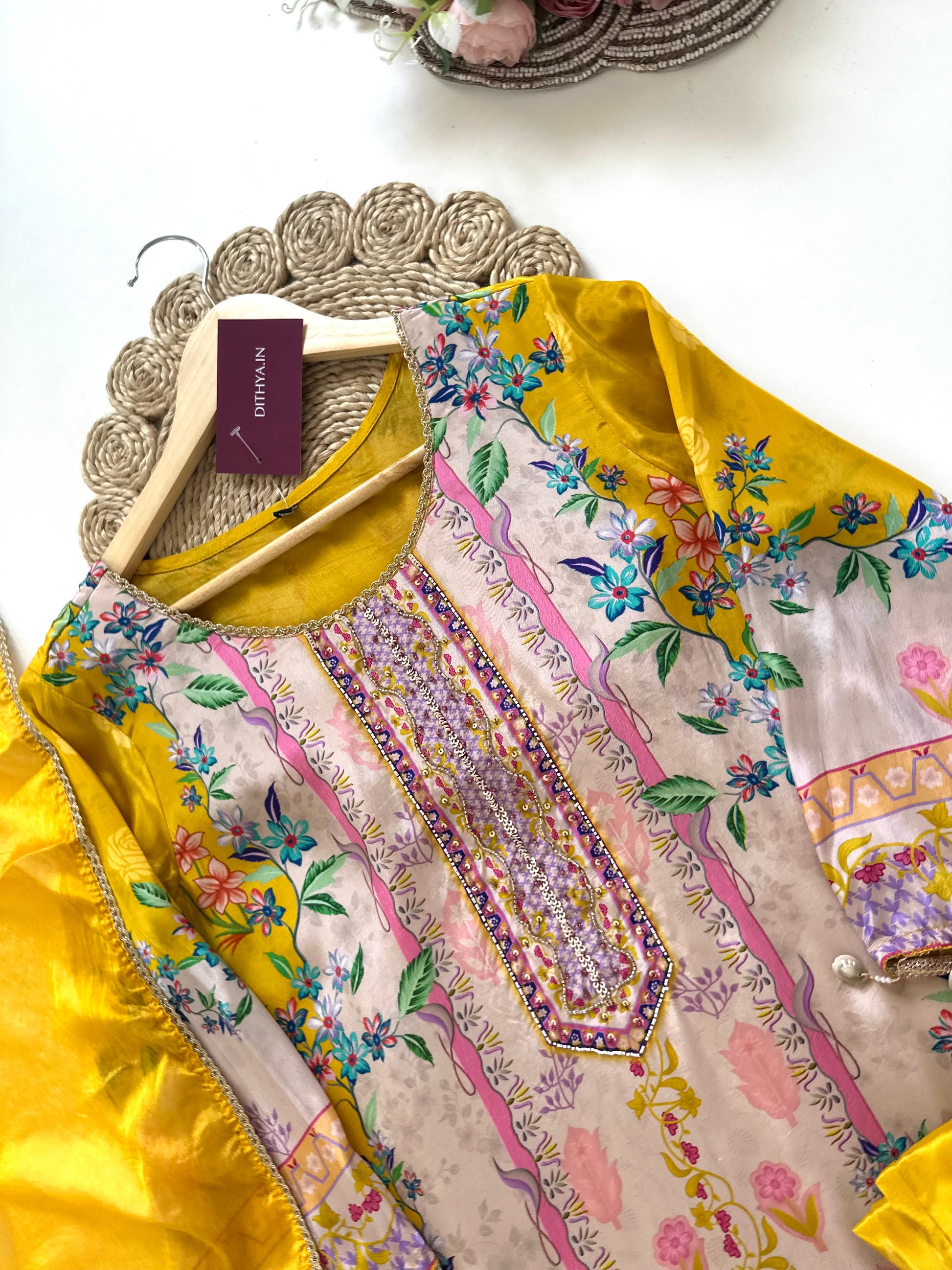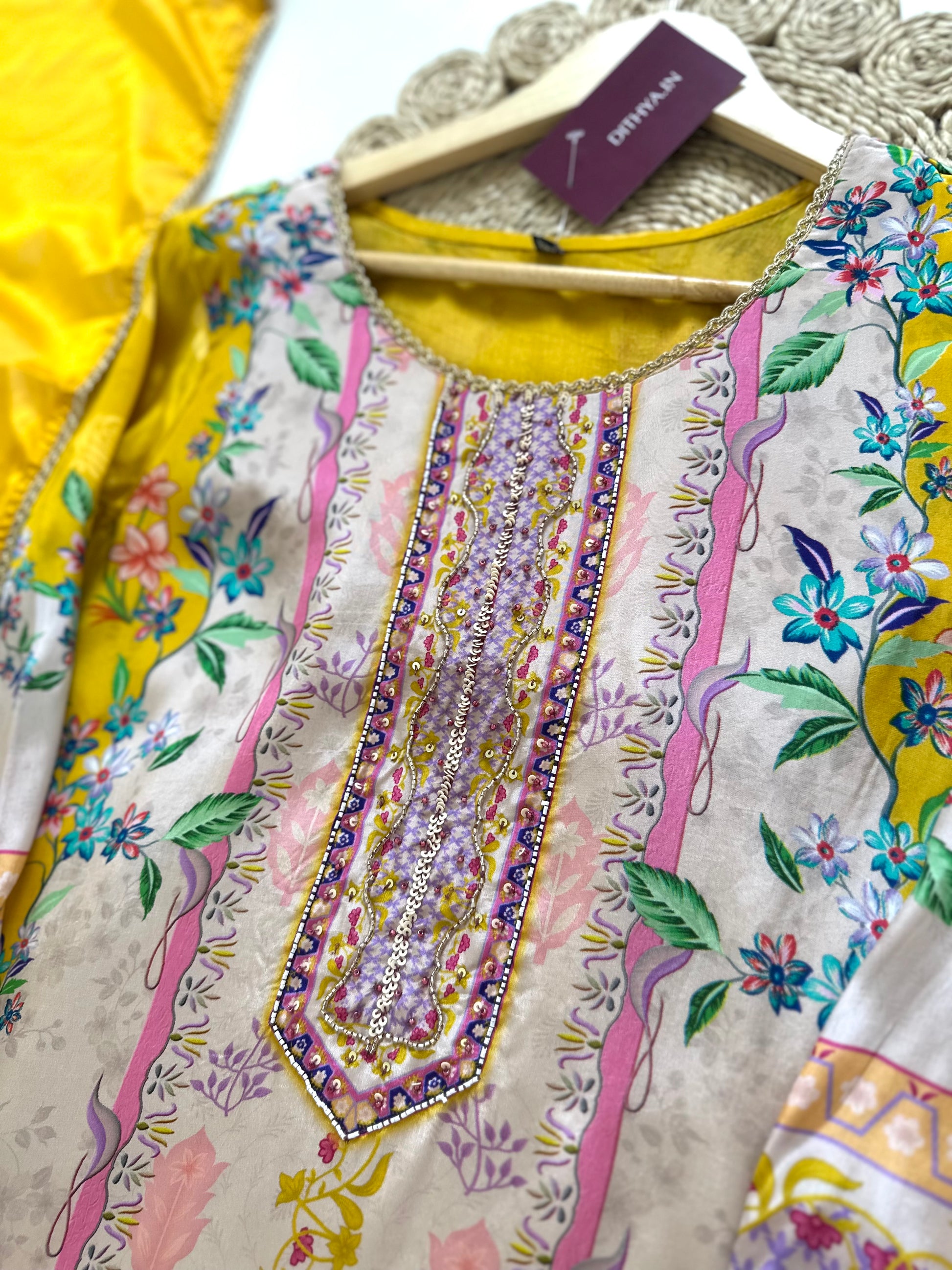 K070 - Pure crepe floral printed Aline Kurti with pants and dupatta